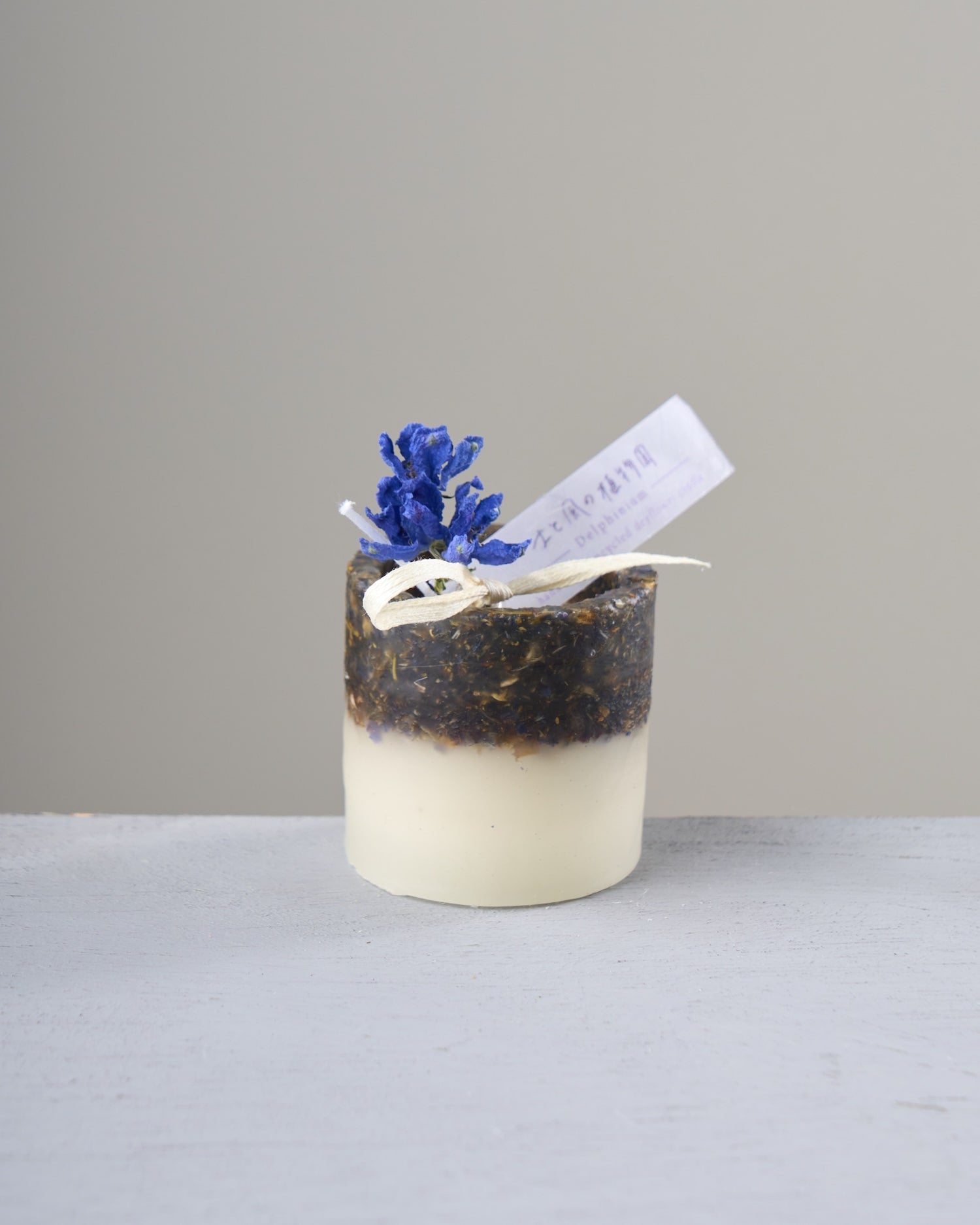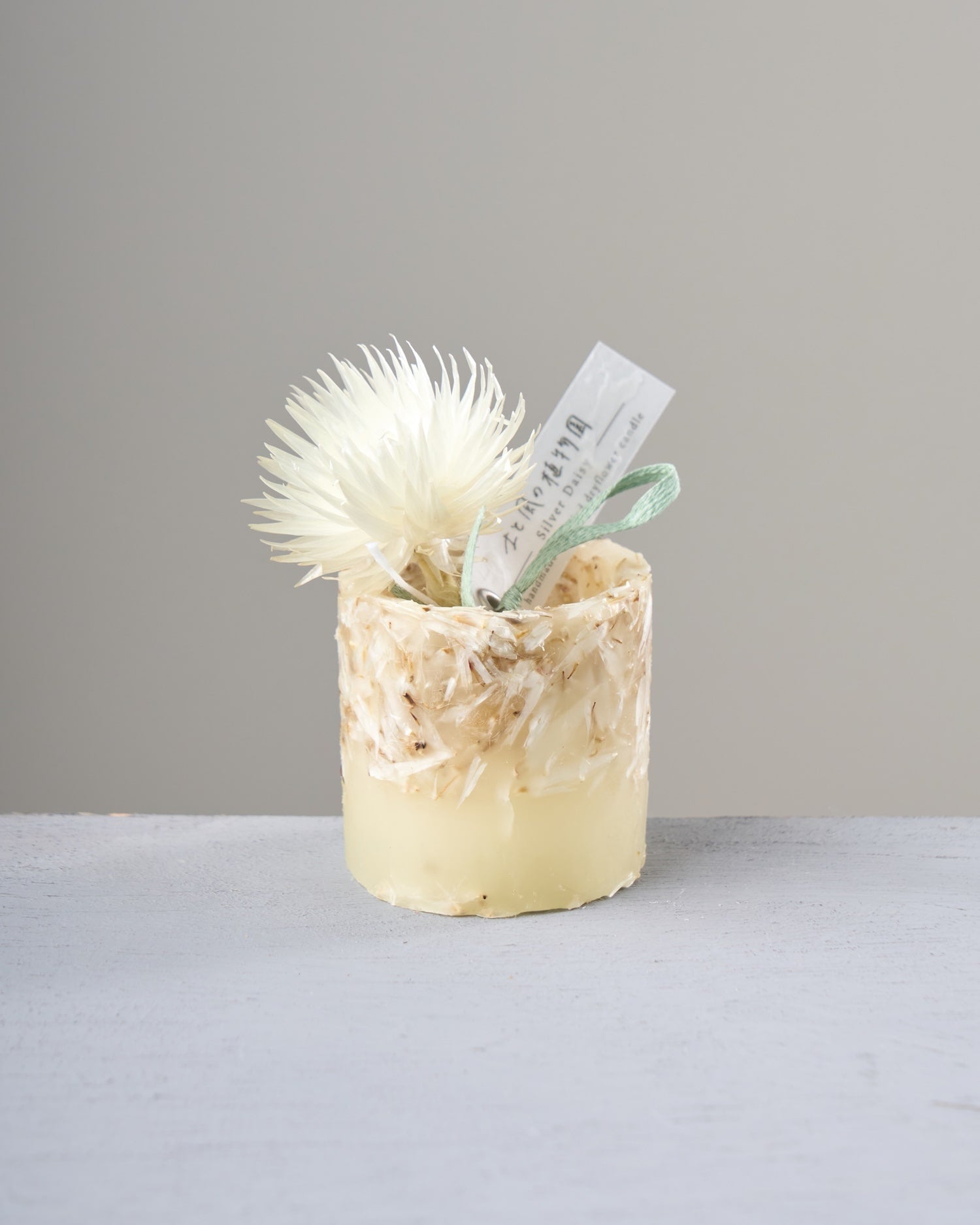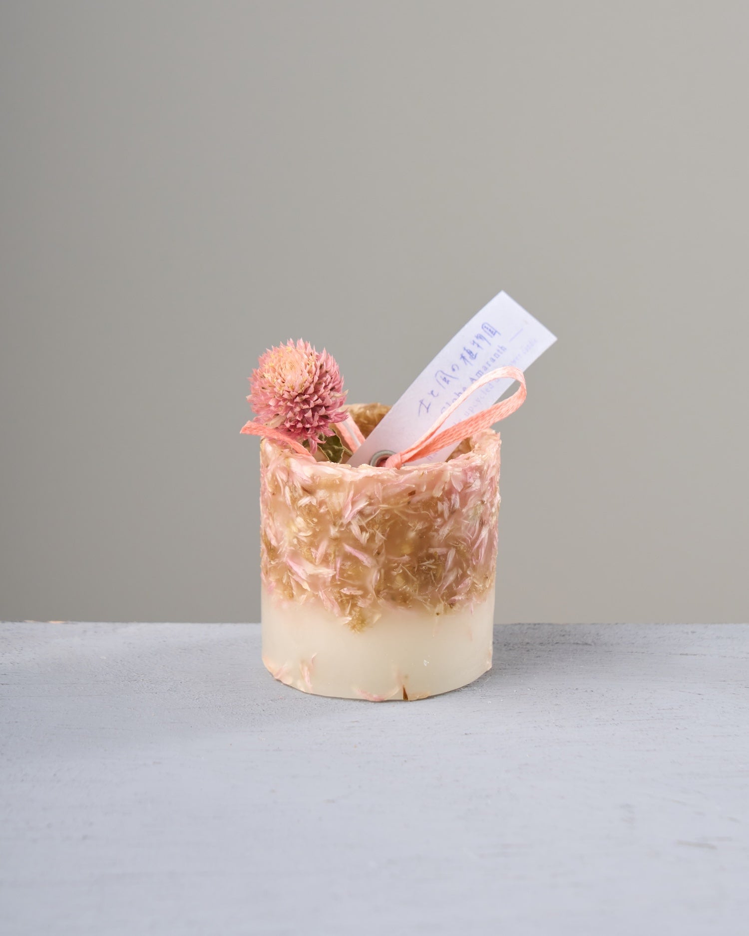 ドライフラワーのカケラをぎゅっと凝縮した、植物標本のようなミニキャンドルです。
