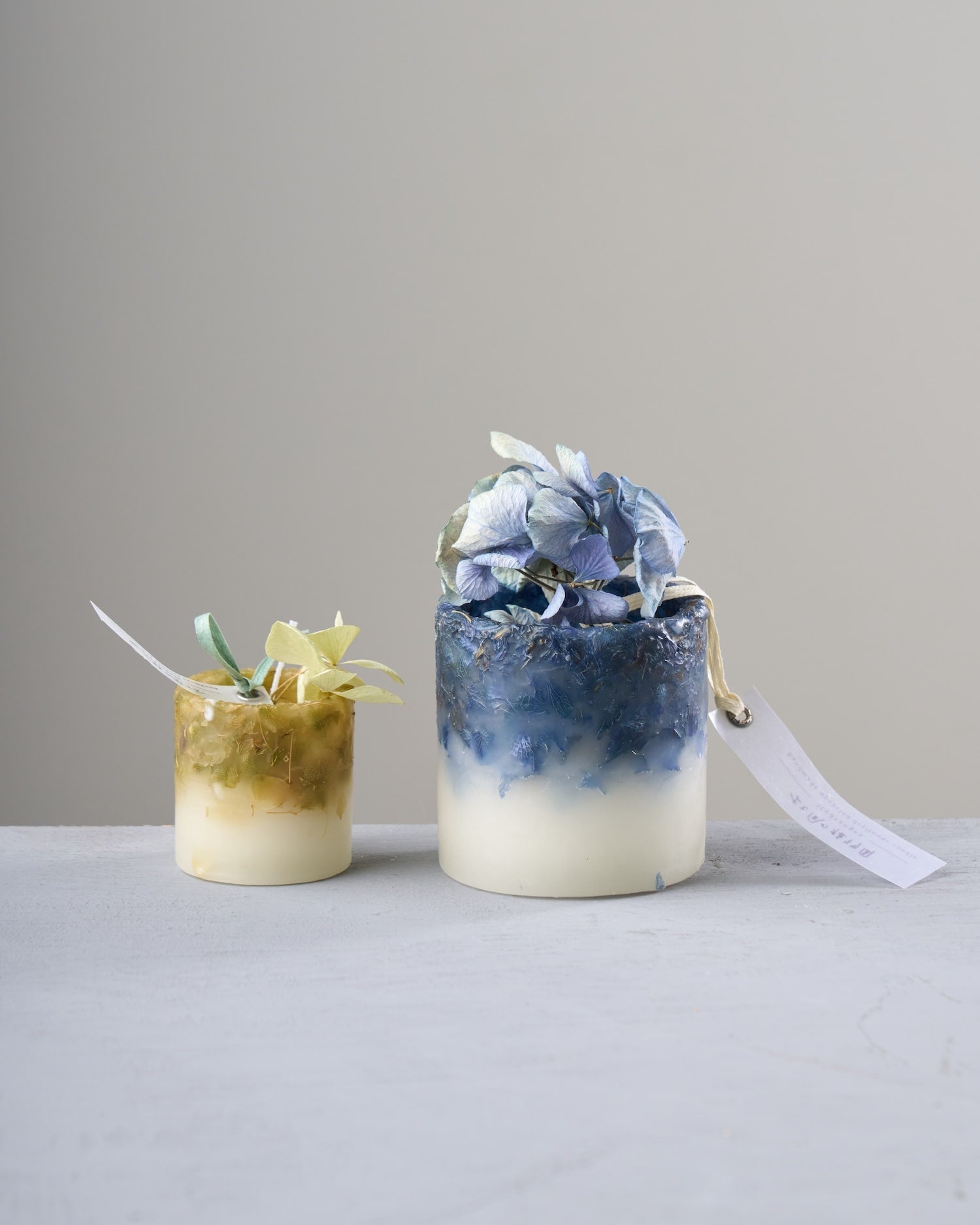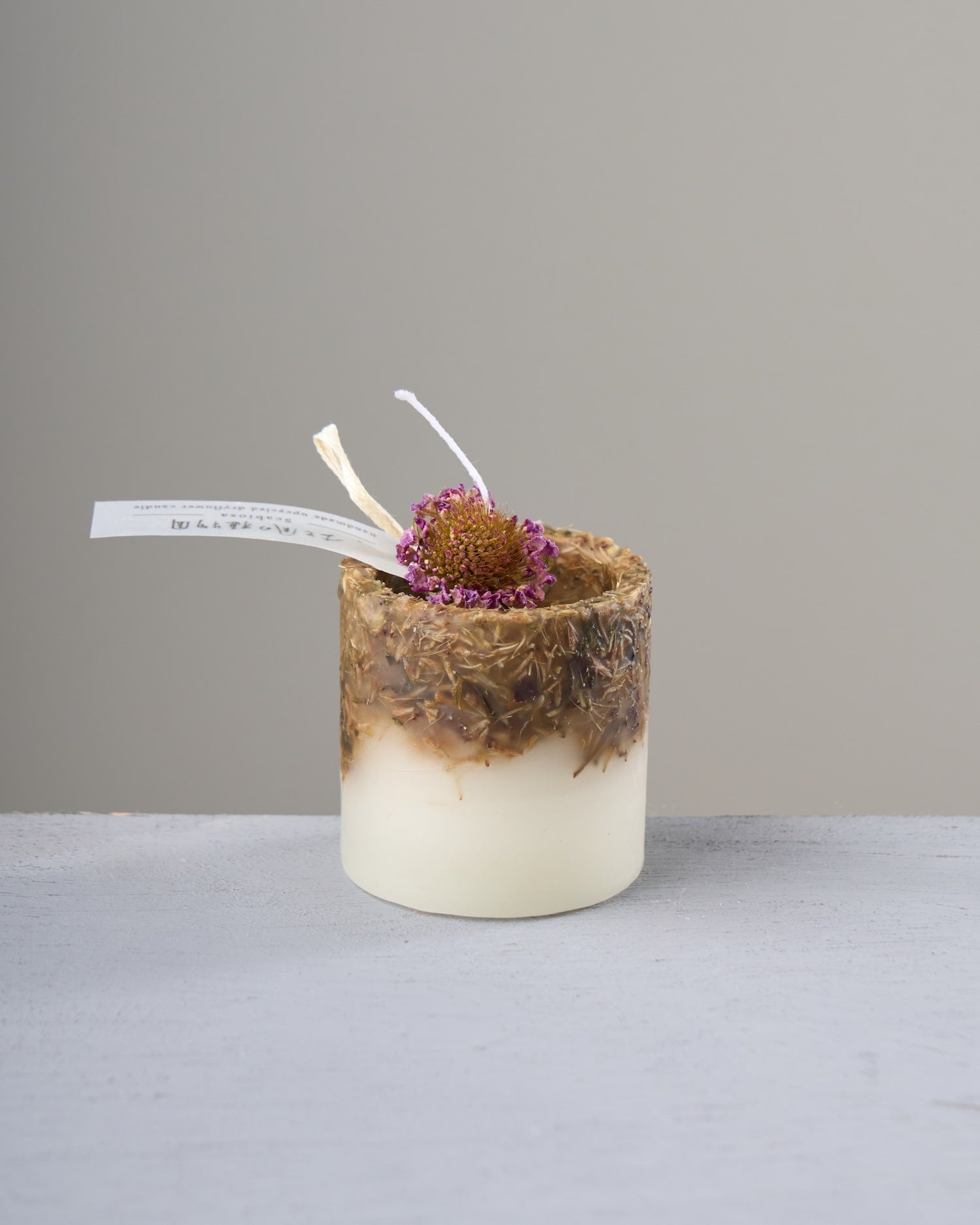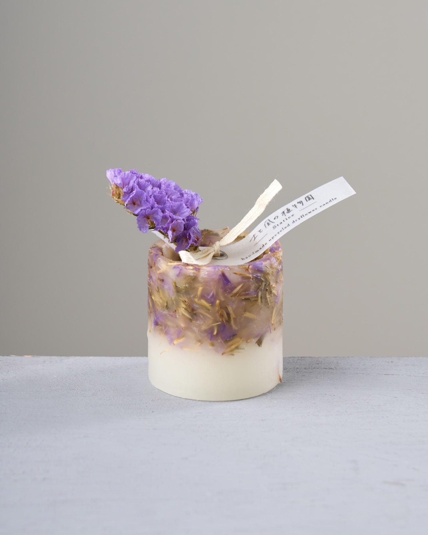 花を粉砕して蝋に混ぜ込むと、紫のつぶつぶが散りばめられて、あでやかな表情を見せてくれます。