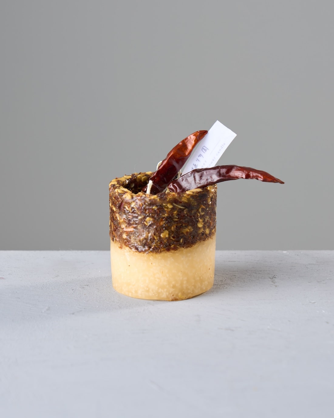 ツヤッとした質感の唐辛子は、粉砕して蝋に混ぜ込むと、やや深いマットな赤へと変化します。