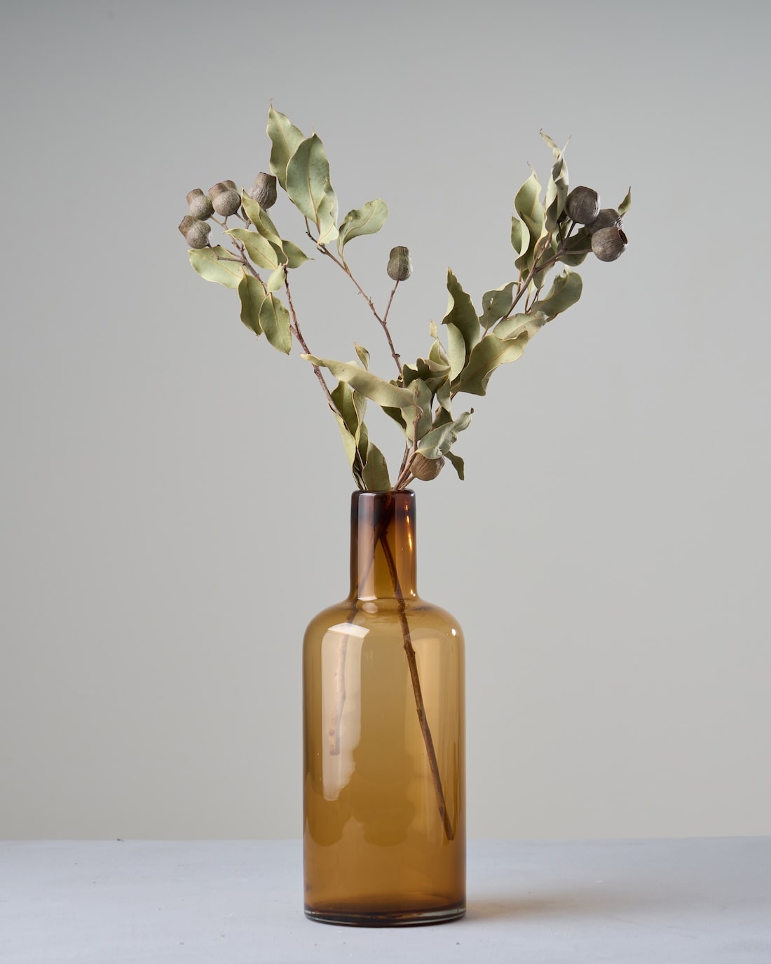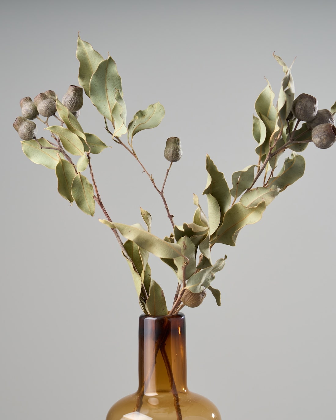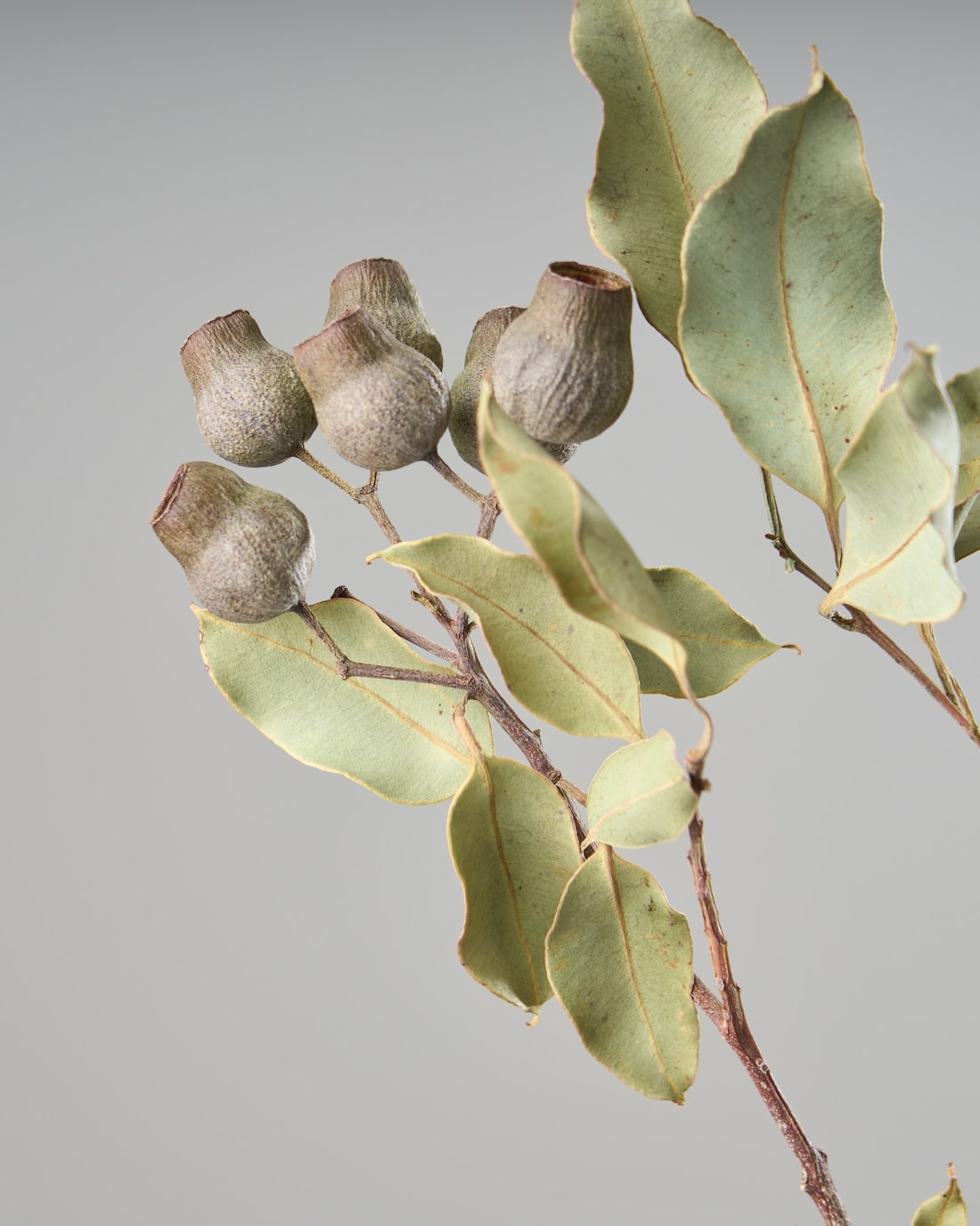 ユーカリ トランペットは、つぼ状のコロンとした実が、とてもユニーク。ちょっぴりくすんだ落ち着きのある色合いが、こなれた雰囲気を醸し出します。個性的な花材や、動きのドライフラワーとの相性が良いです。