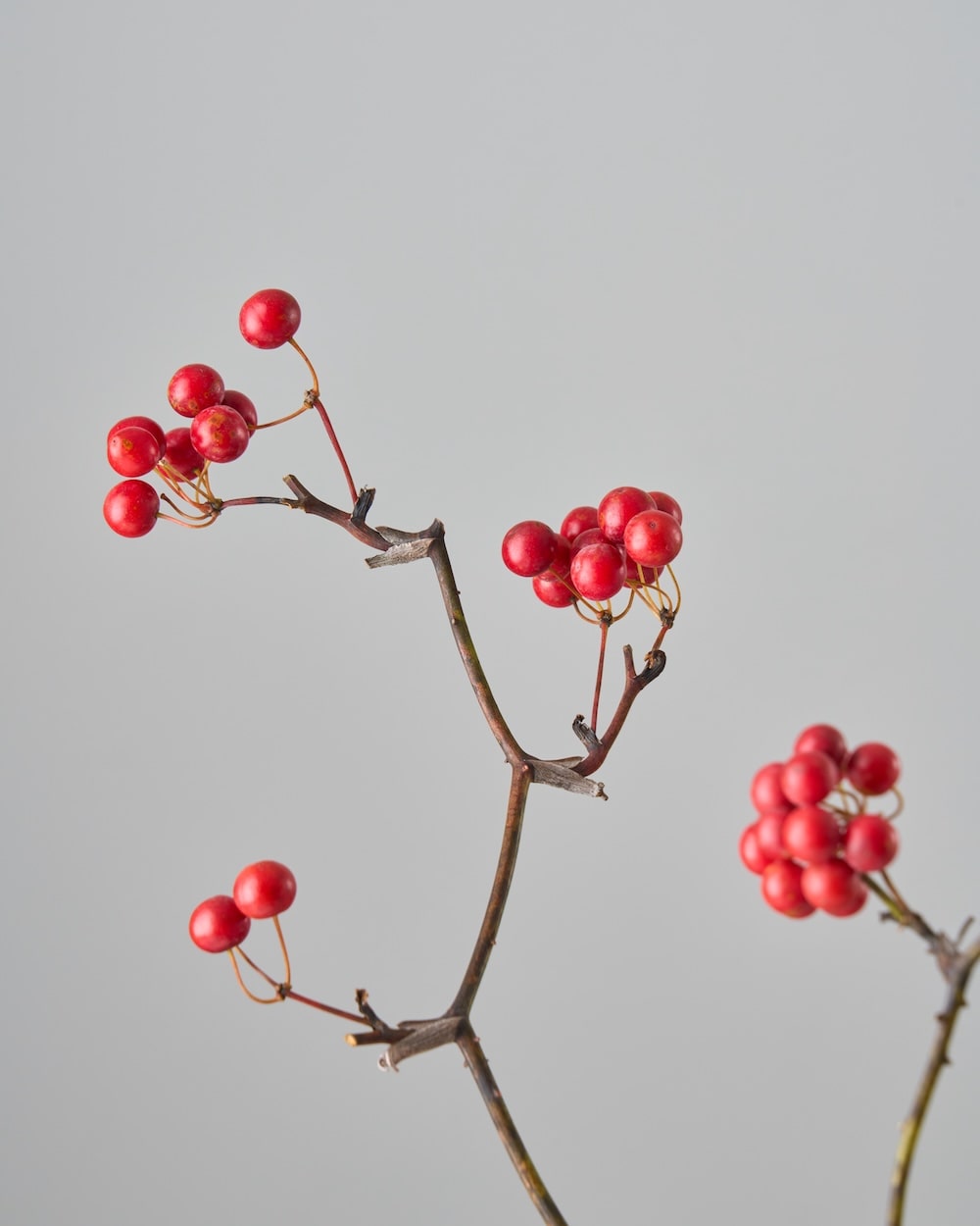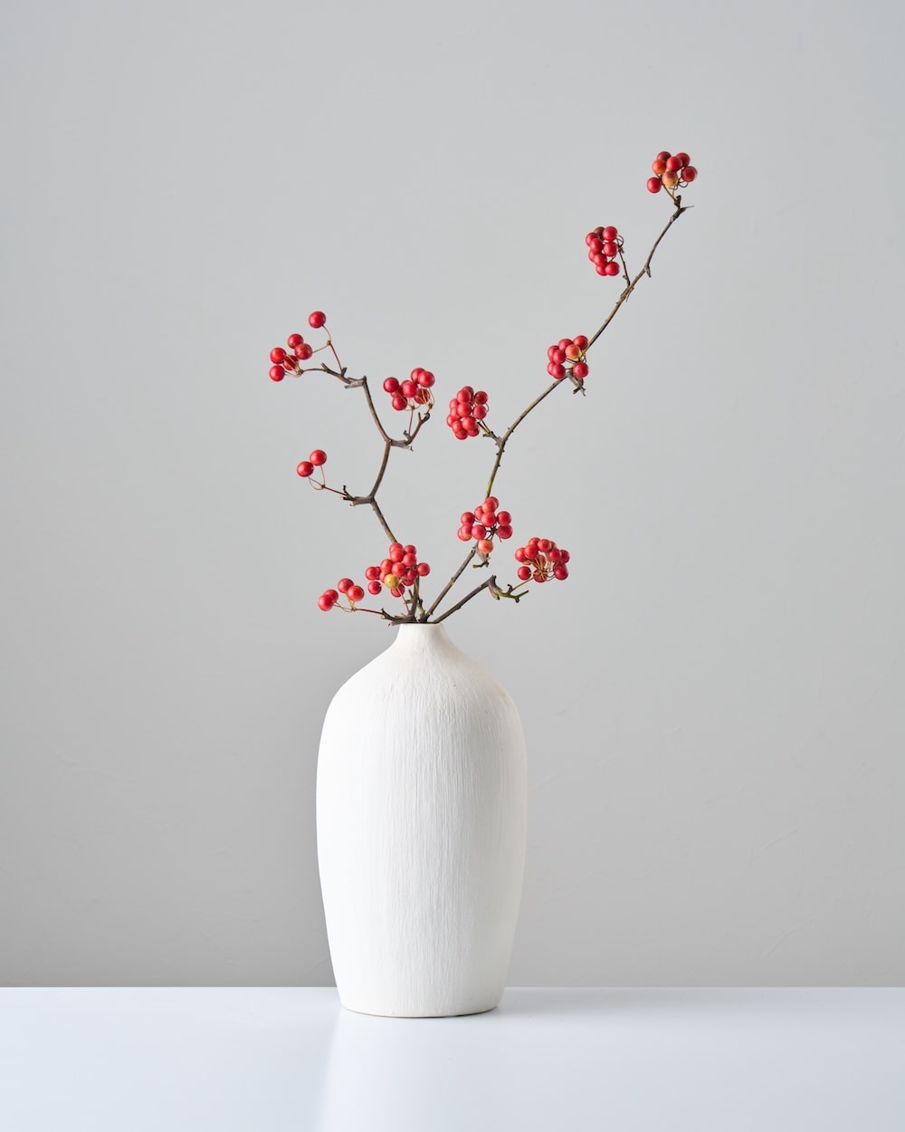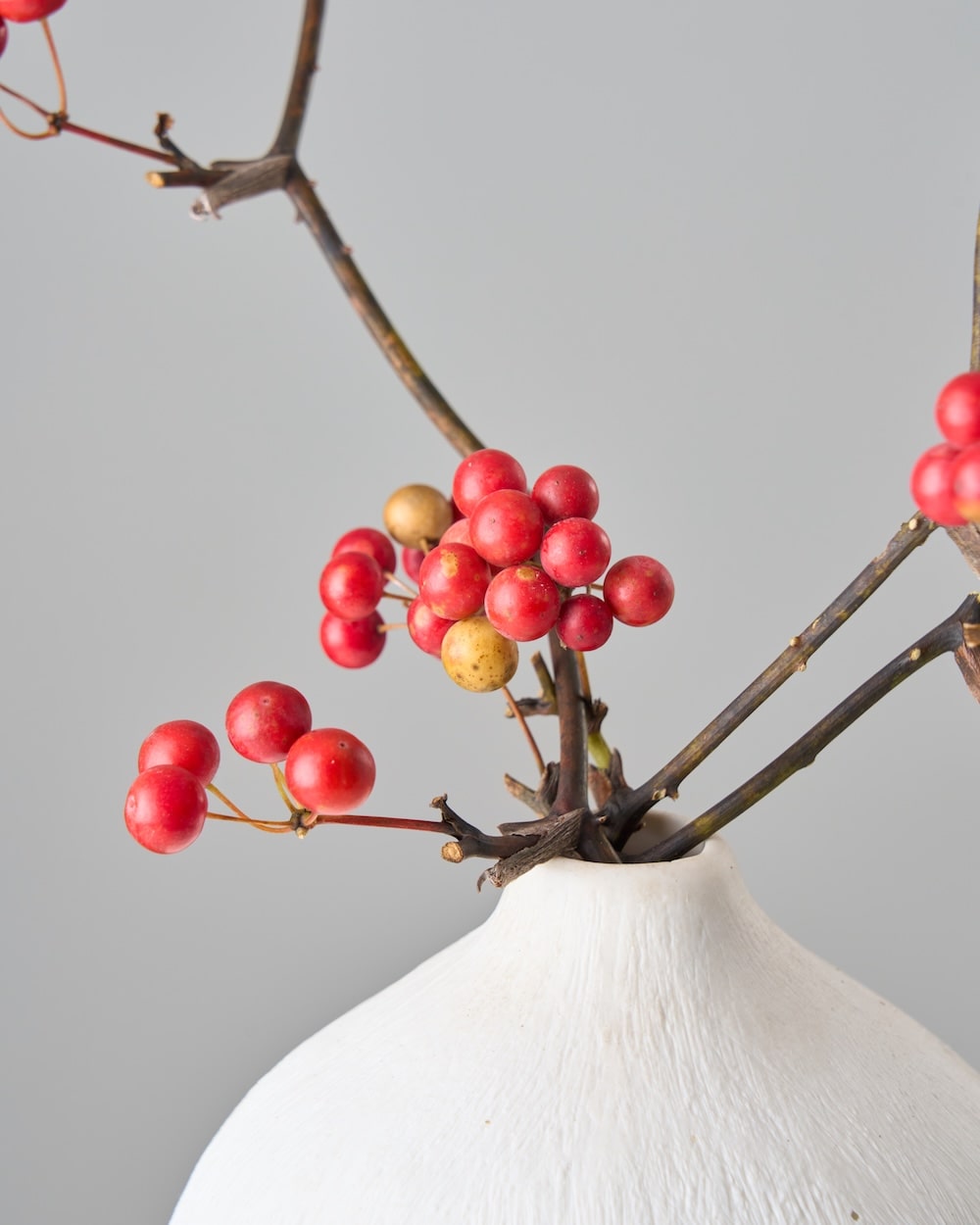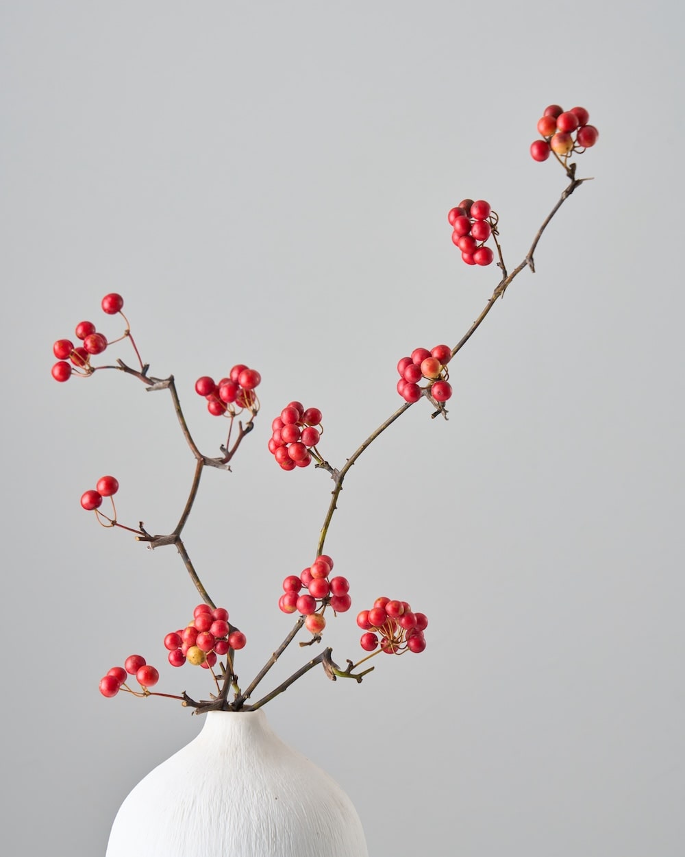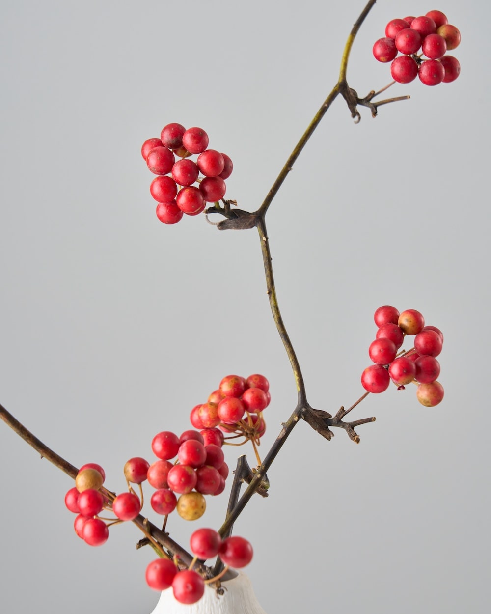 | 花材の特徴 | 赤い実が鮮やかで、つるのような茎に、独特なリズムで並ぶ姿が特徴 ※実には黒い斑点が現れることが多くあります こちらは不良品対応いたしかねますので、ご了承ください |