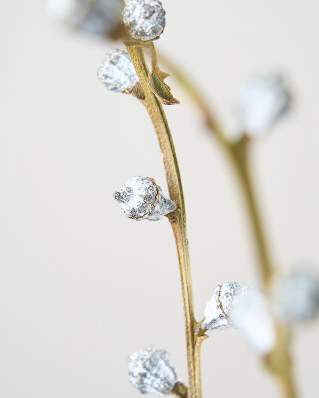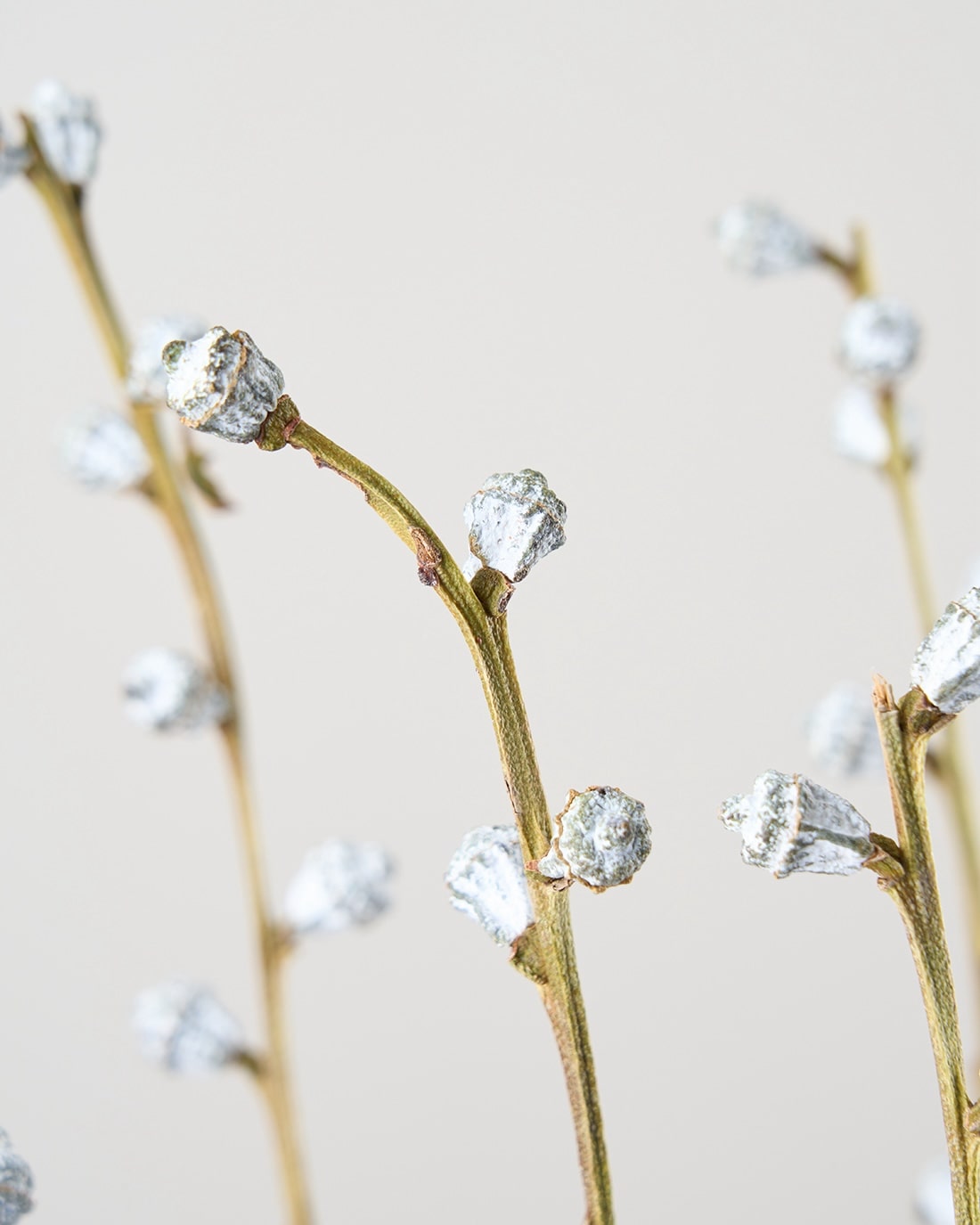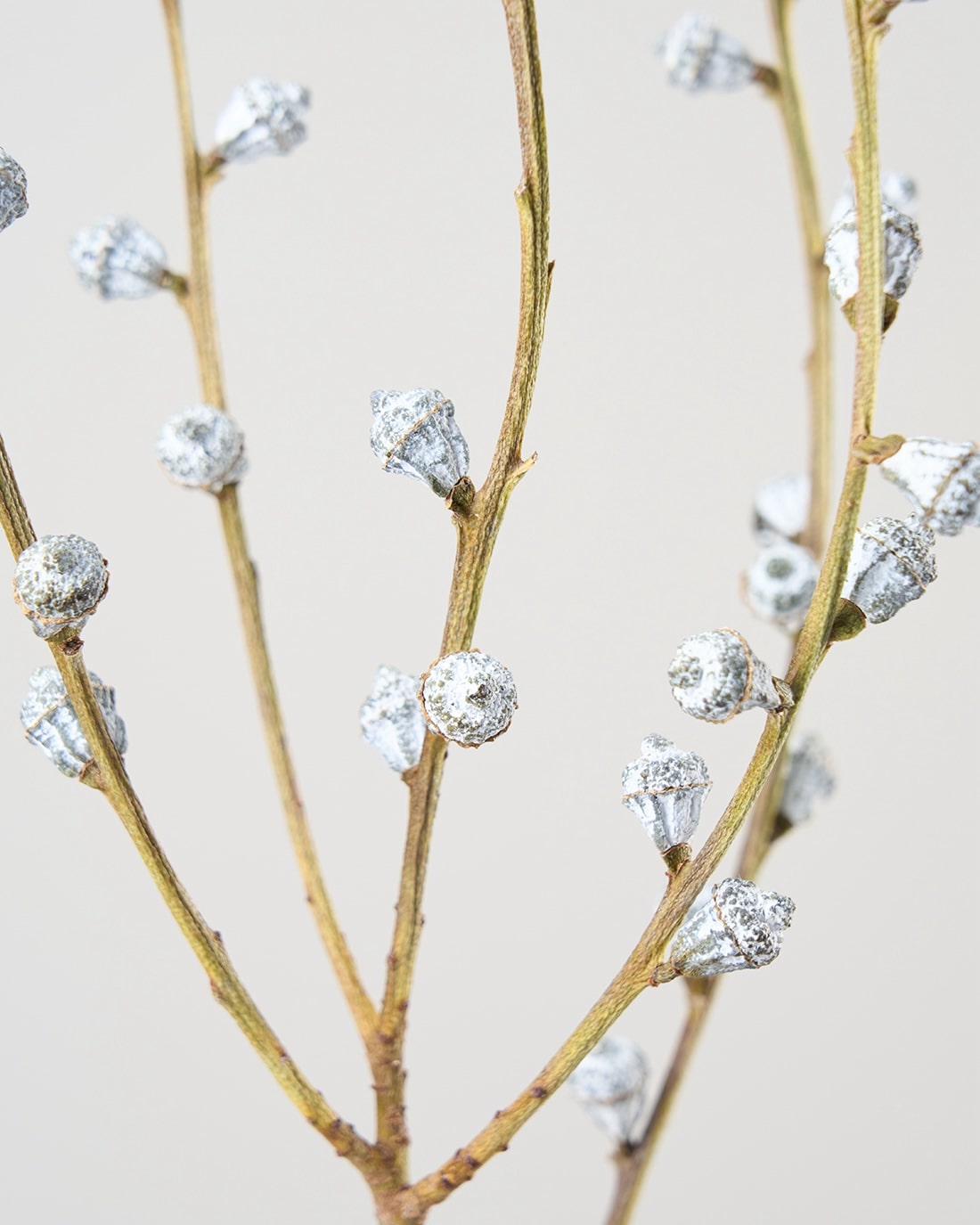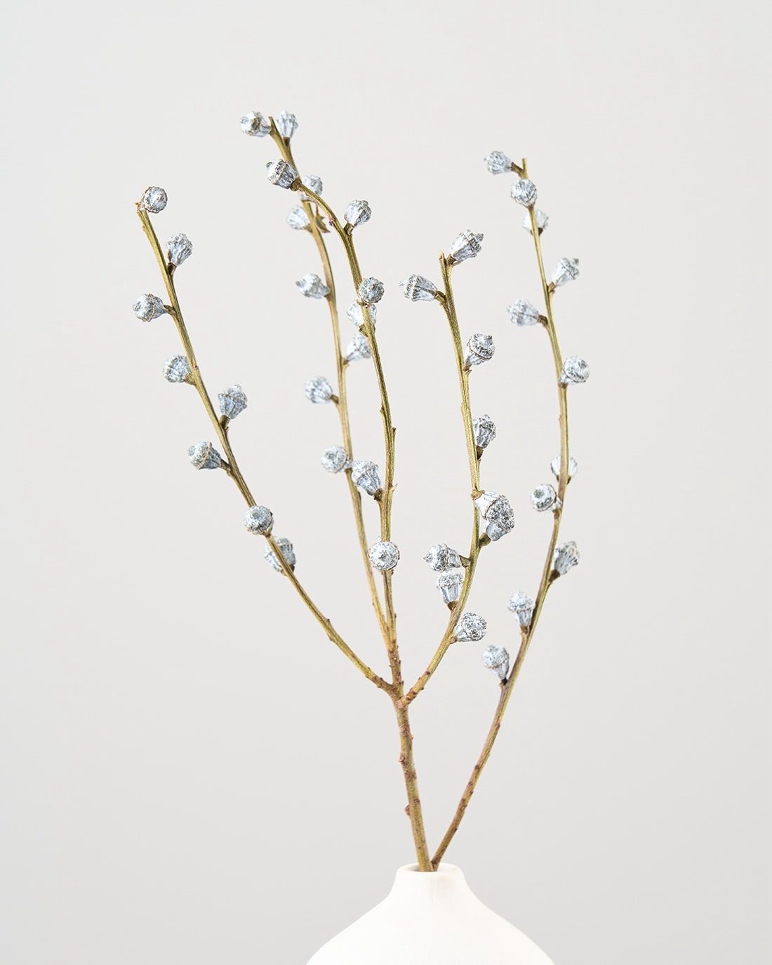 ユニークな佇まいが魅力の、ユーカリの仲間。ころんとした実は、ダイヤモンドみたいなシルエット。白い粉をふいたような表面は、雪景色を思わせる。単体で飾るだけでサマになるひと品です。
