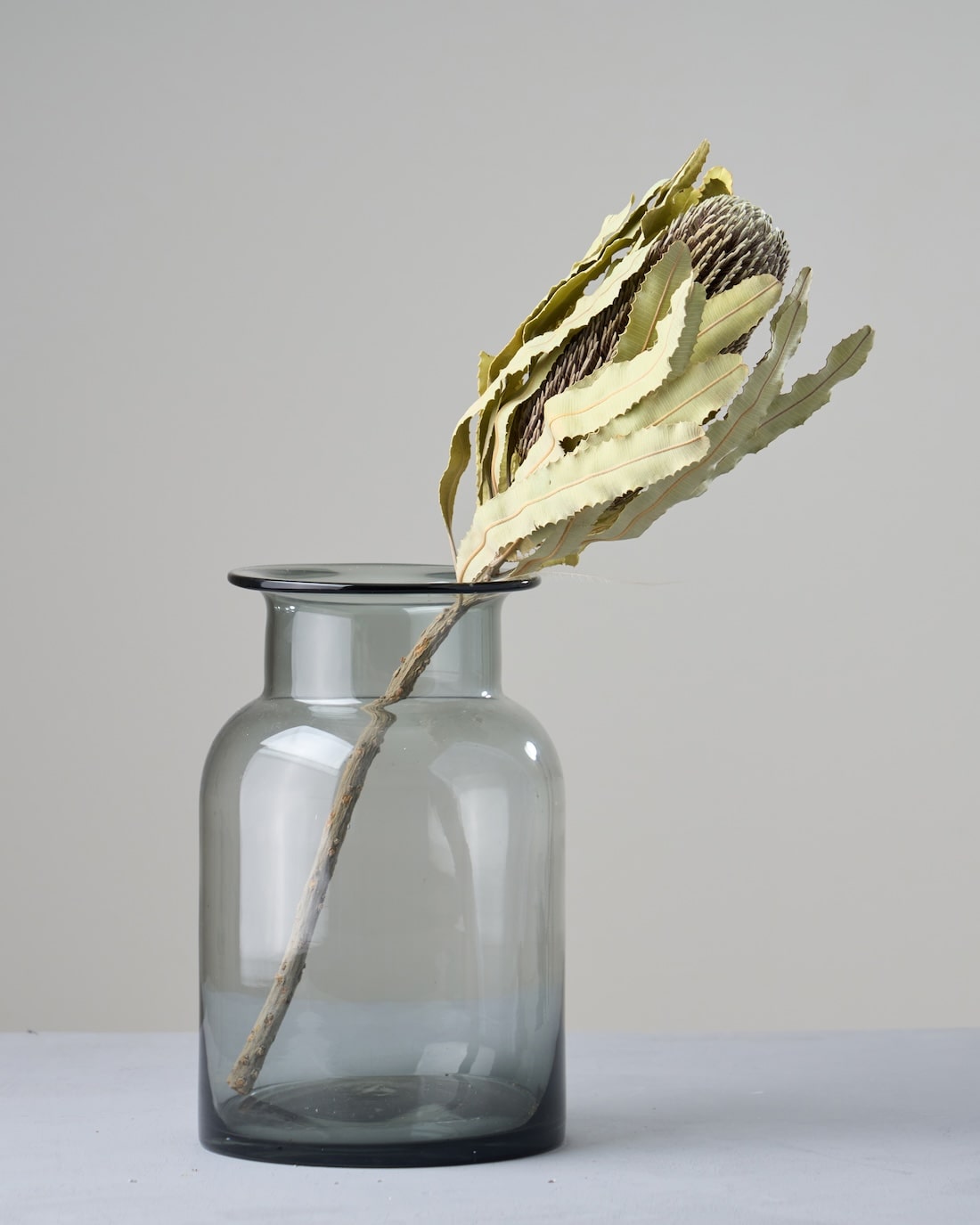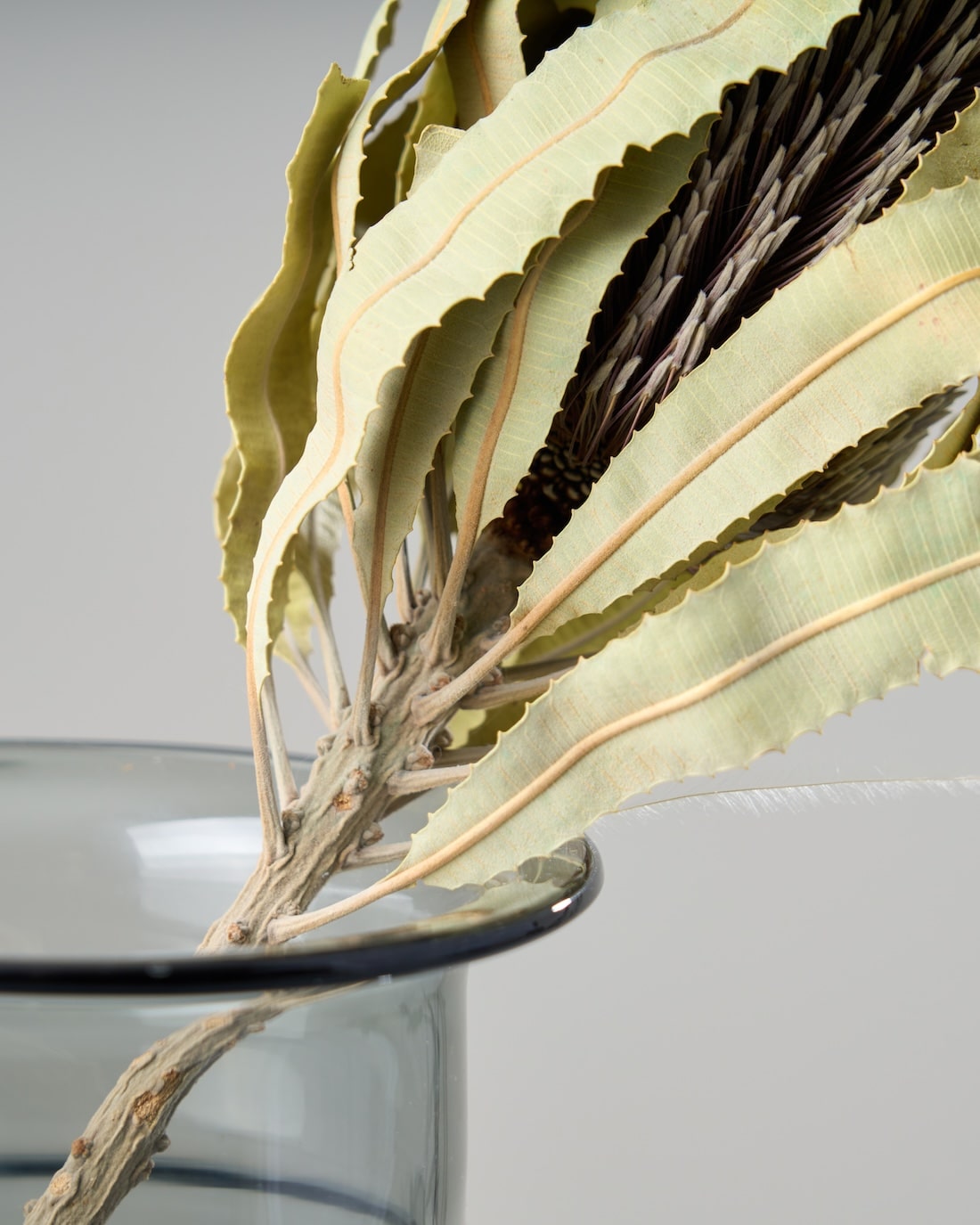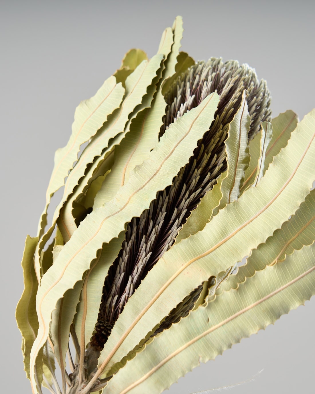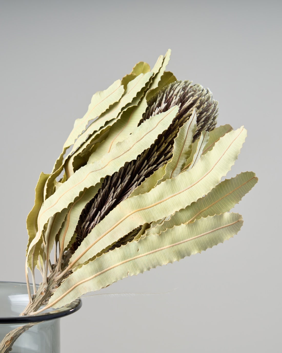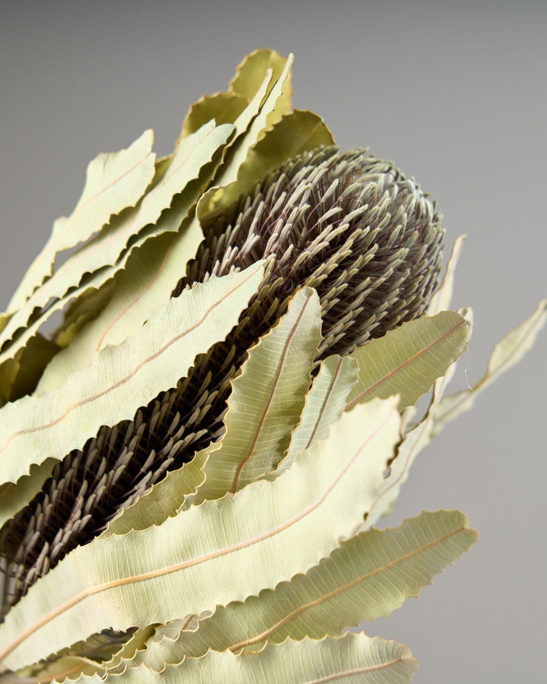 落ち着いたお色で、ワイルドフラワーの中でも人気の高いバンクシア メンジェイシー。ギザギザとした葉と、ブラシのような花は存在感抜群です。そのまま花びんに飾っても、スワッグの主役にしてもサマになるひと品です。