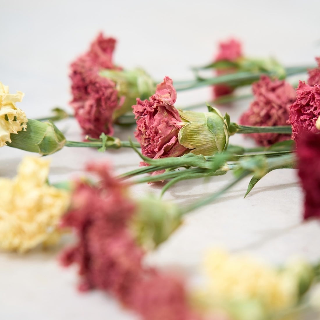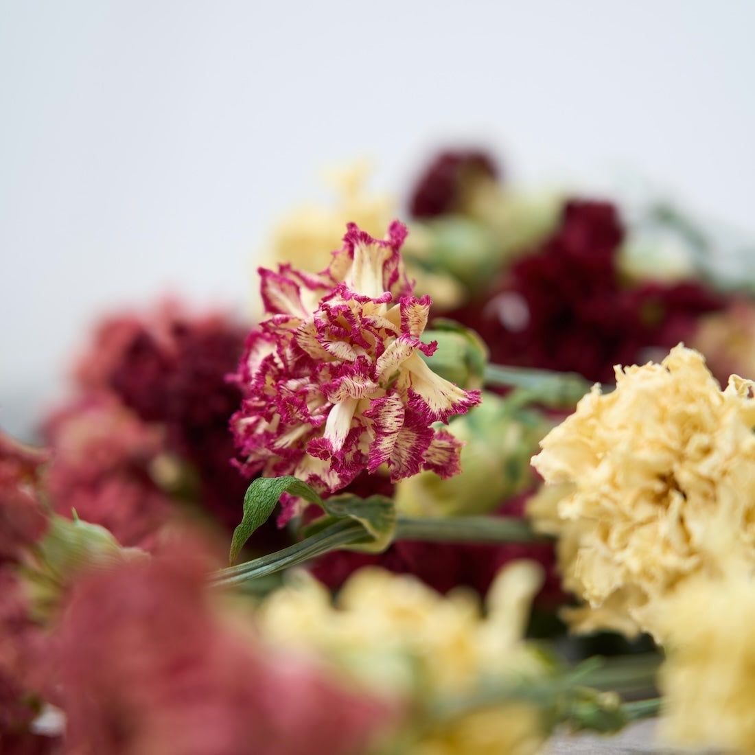 ドライのカーネーションは、フレッシュの時とはまた違った、どこか大人びた雰囲気をまとった花色が魅力的。