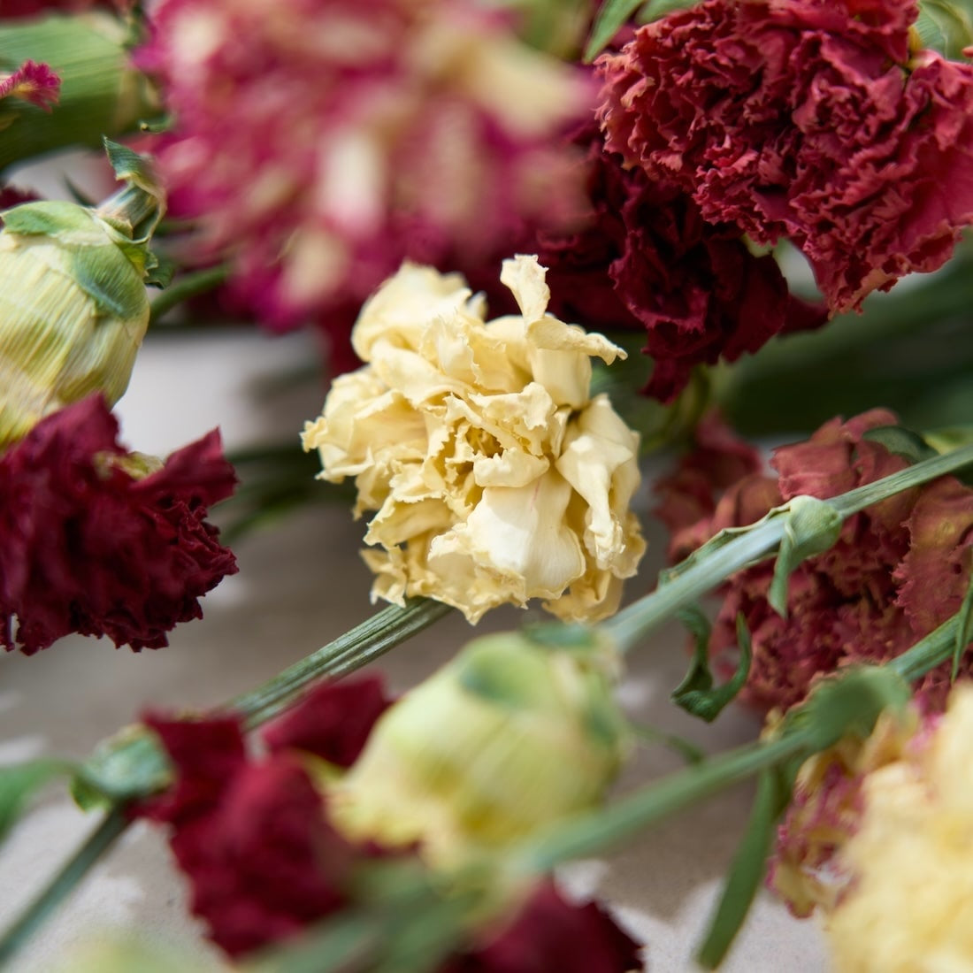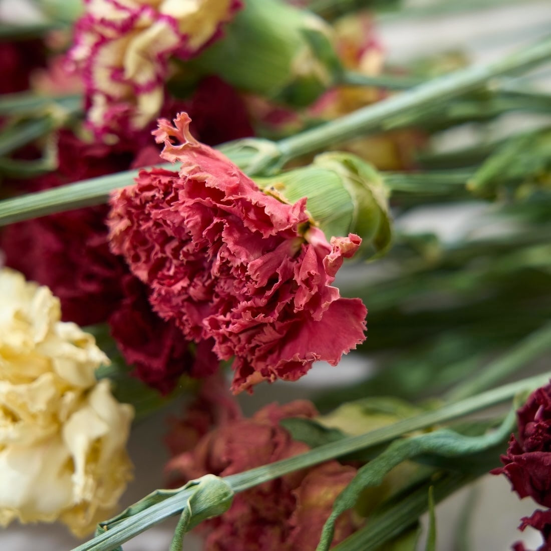 色や品種の異なるカーネーションを、フローリストがランダムで組み合わせてお届けします。