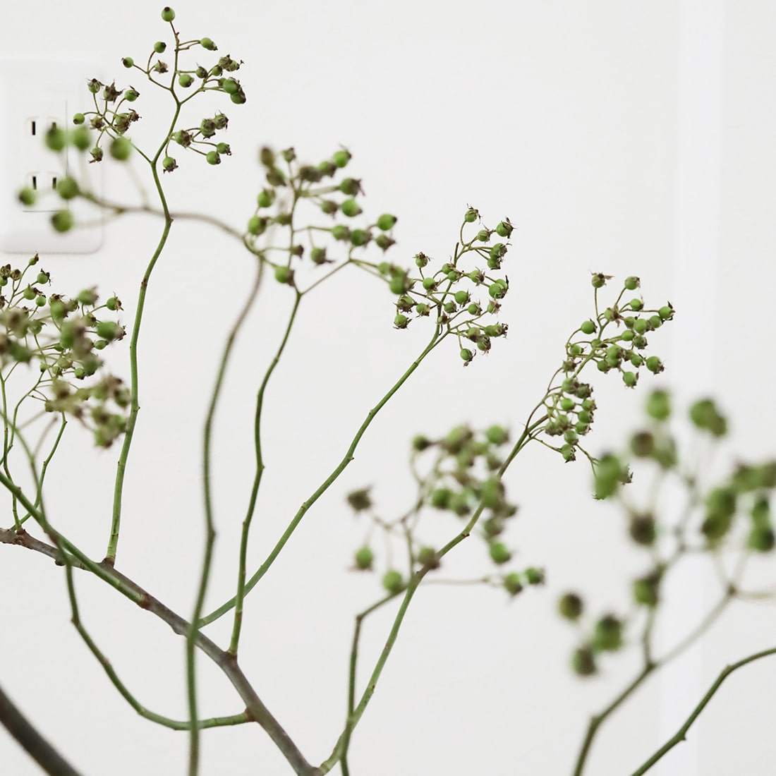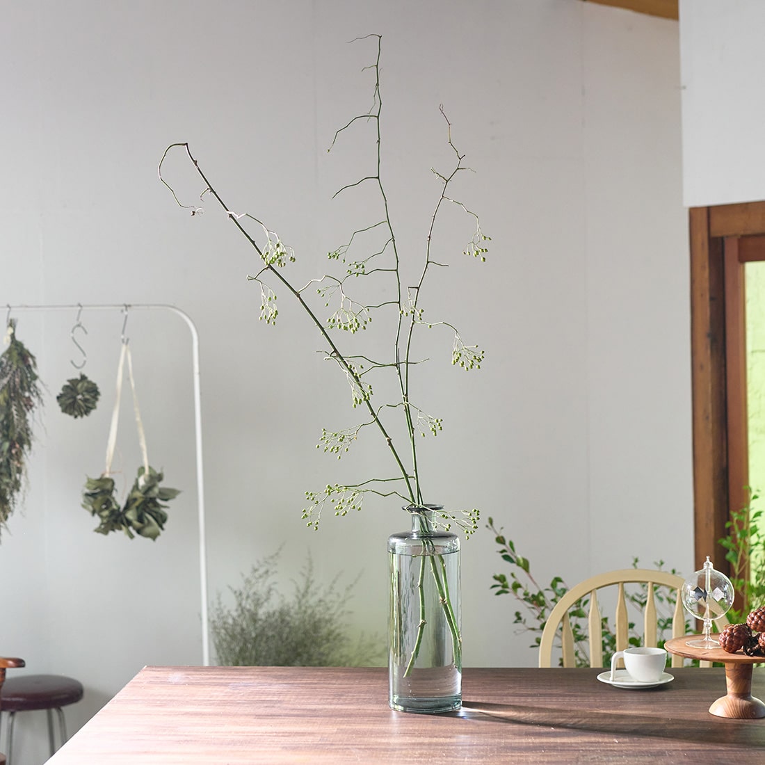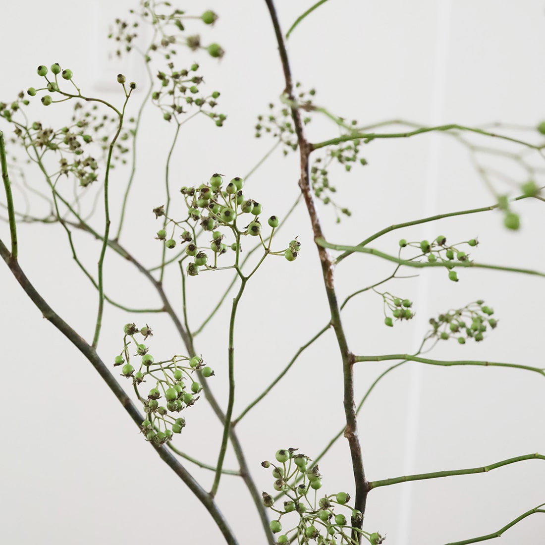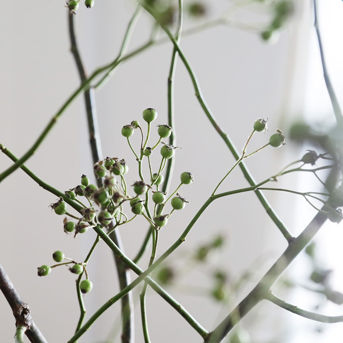 みずみずしさ満点の、グリーンの野ばらの実が初登場。赤く染まる前のピュアな色彩は、暑い季節にぴったりです。110㎝と、他店にはないボリューム感。小さな実がリズミカルに連なる姿に、心がはずむ。枝ぶりは格好良いので、花びんに無造作に飾るだけで、空間がぐっと引き締まります。お部屋の主役にはもちろん、お店の装飾にも。