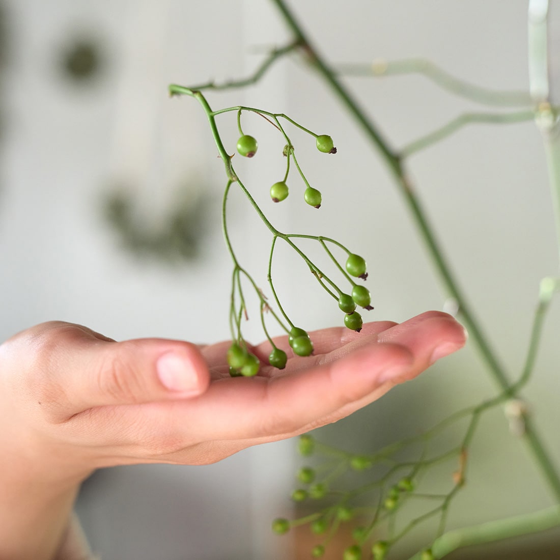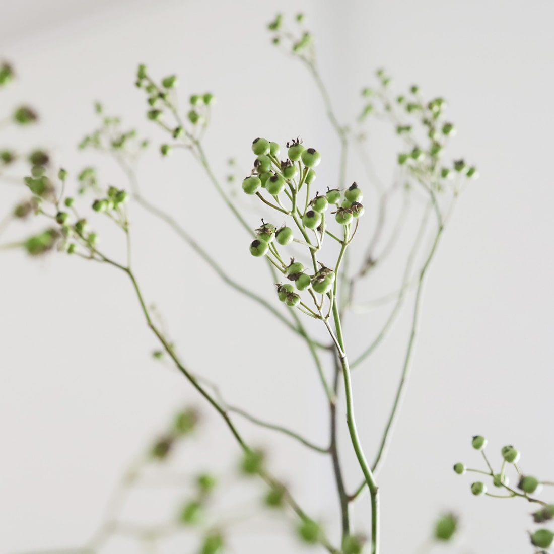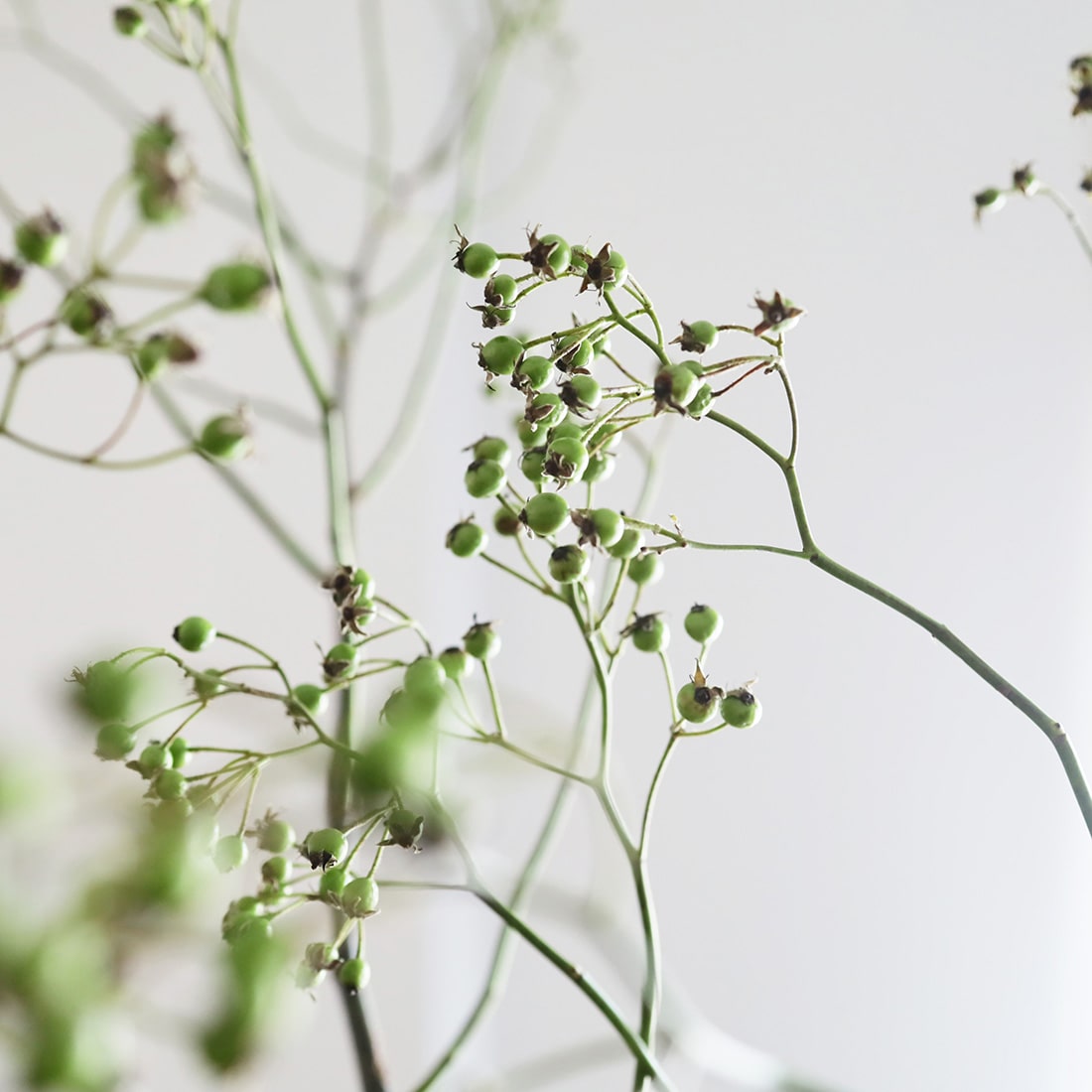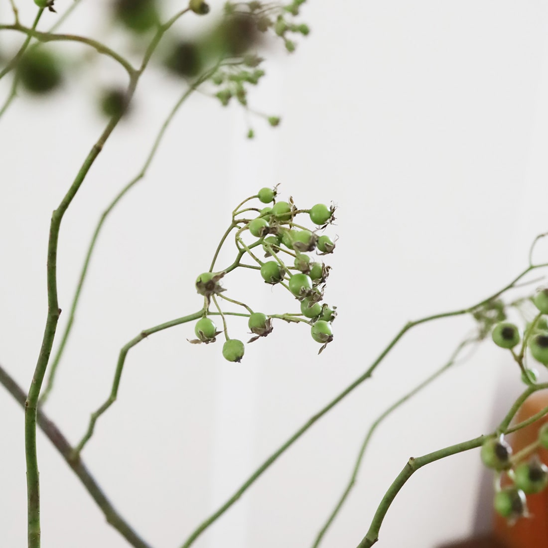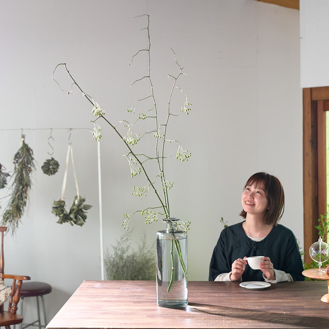 みずみずしさ満点の、グリーンの野ばらの実が初登場。赤く染まる前のピュアな色彩は、暑い季節にぴったりです。110㎝と、他店にはないボリューム感。小さな実がリズミカルに連なる姿に、心がはずむ。枝ぶりは格好良いので、花びんに無造作に飾るだけで、空間がぐっと引き締まります。お部屋の主役にはもちろん、お店の装飾にも。