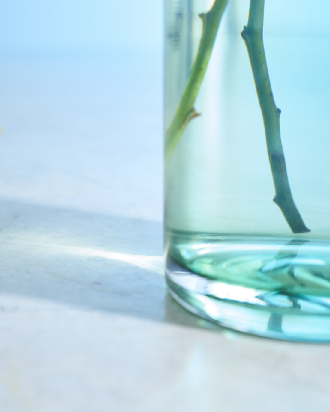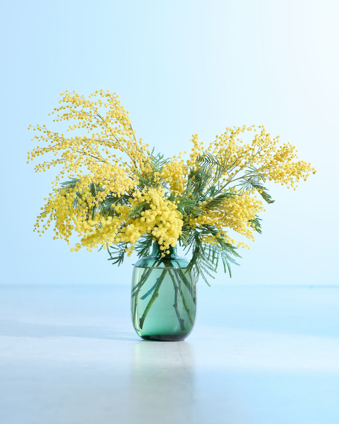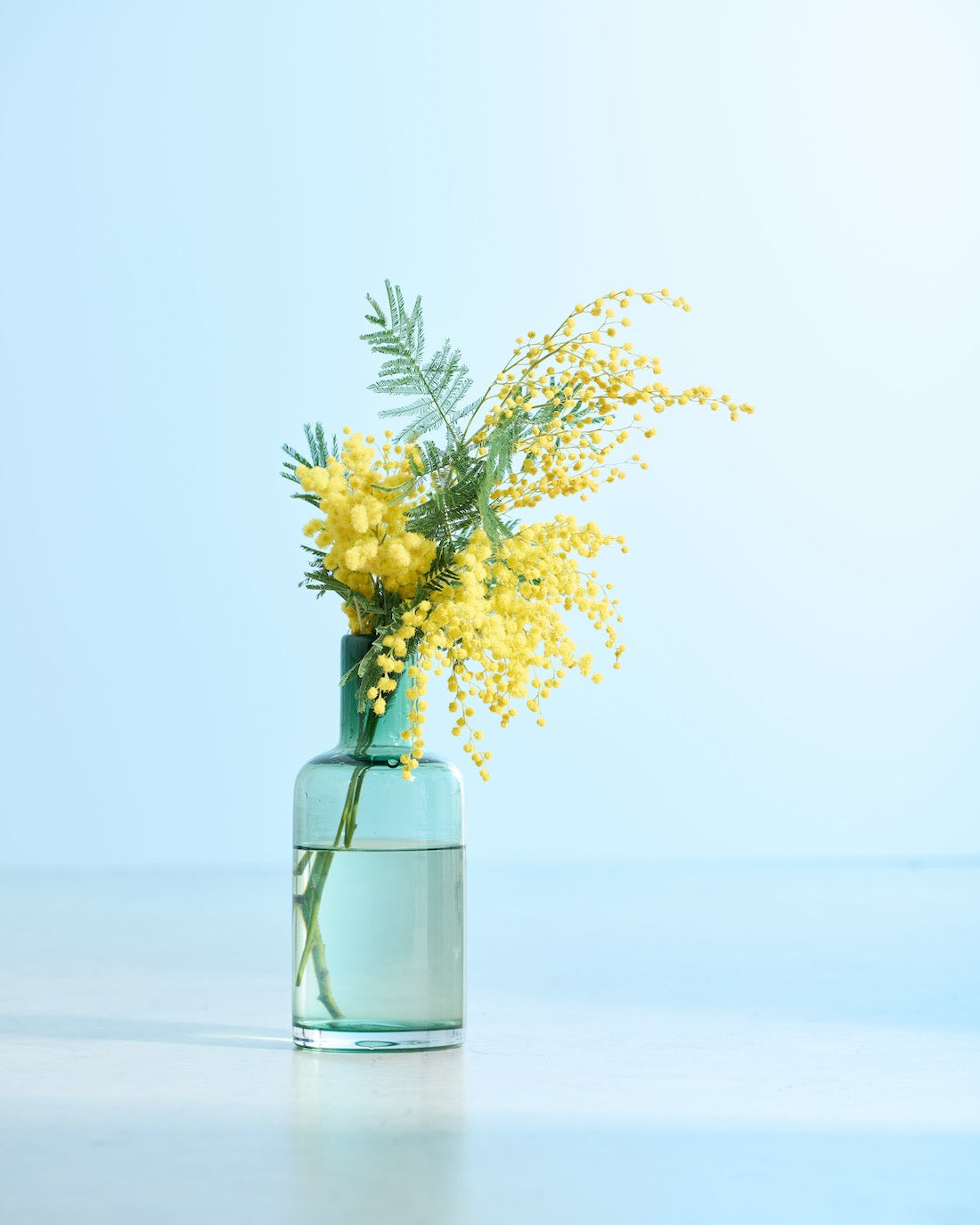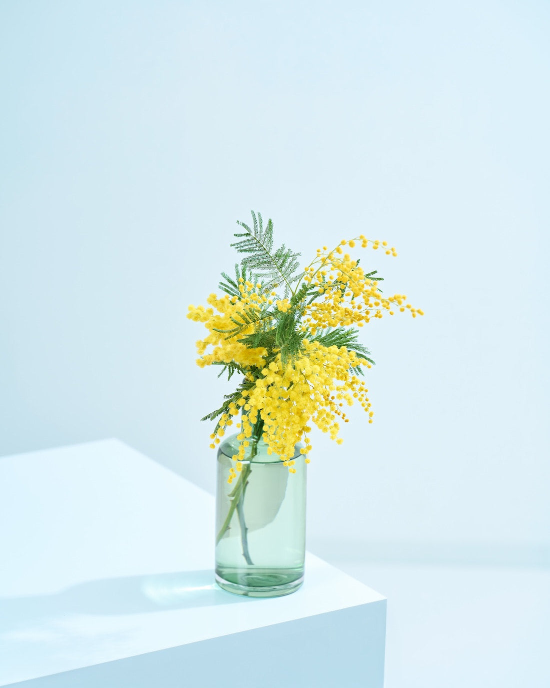 花びんに少量の水を入れ、ミモザを挿しておきます。自然にたわんだままの姿でドライになるため、ナチュラルな姿を楽しみたい方におすすめ。