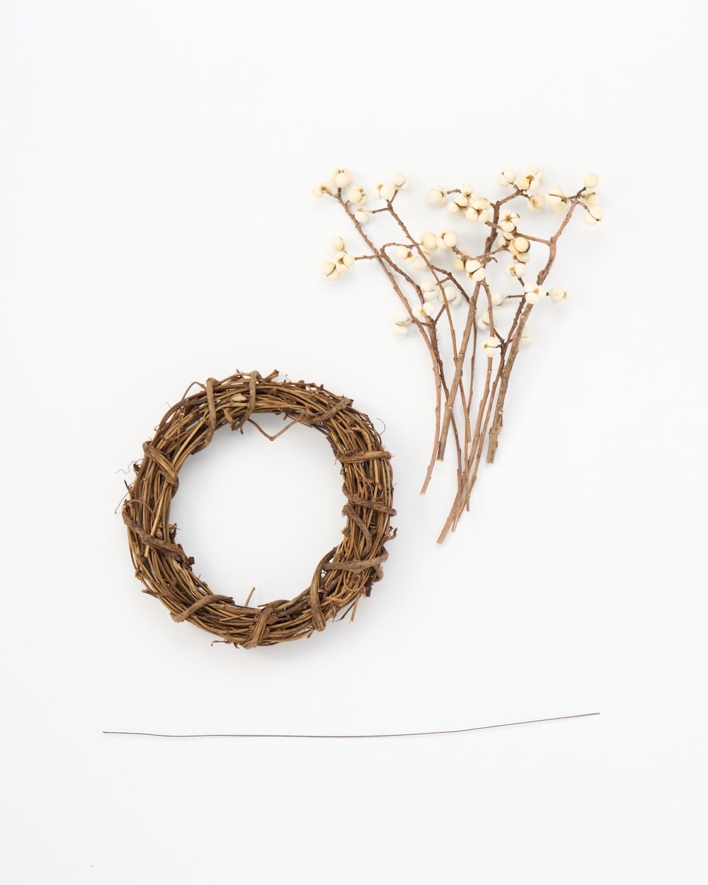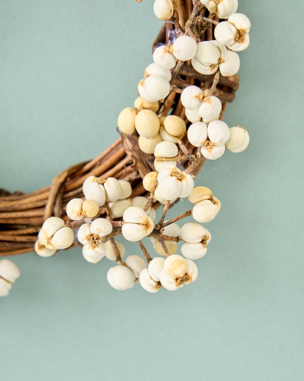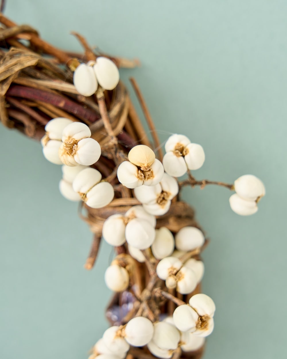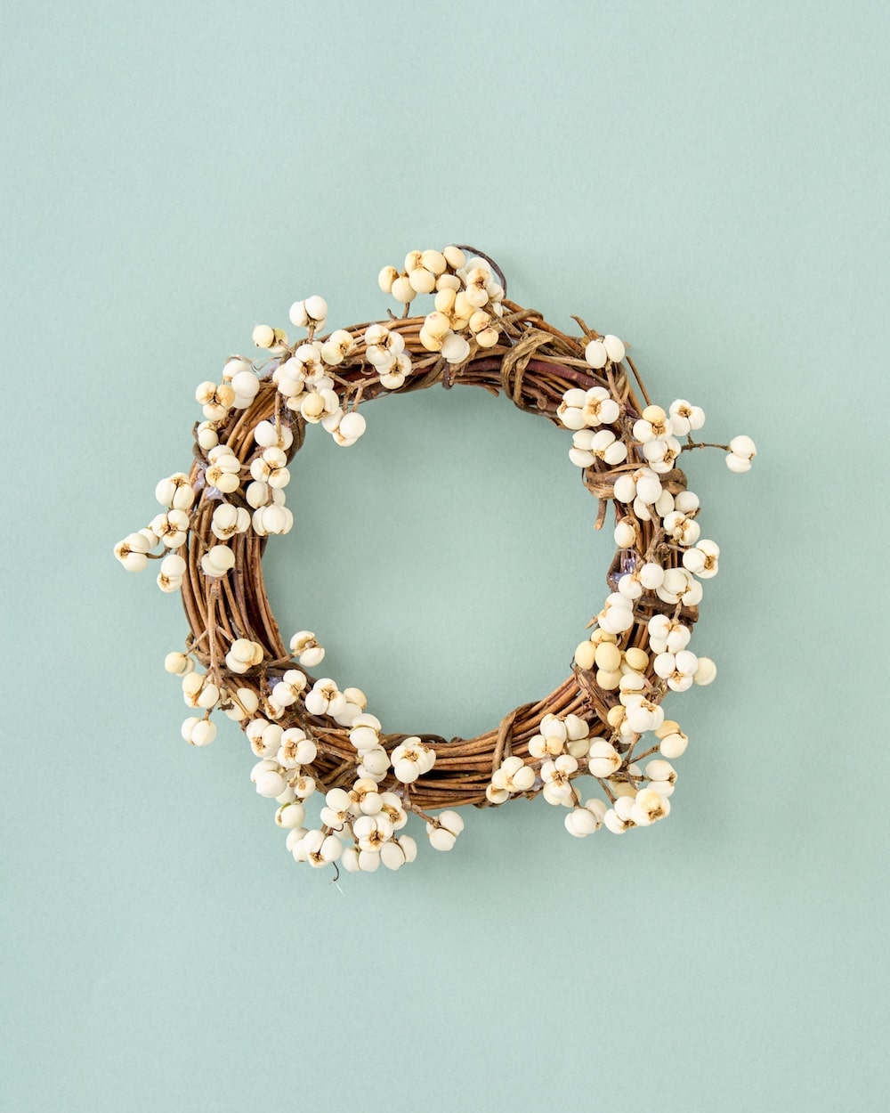 ブラウンのリース台とのコントラストが美しい。枝に降り積もった雪のようにも見えます。冬のお部屋に、心あたたまるひとときを運んできてくれるはず。