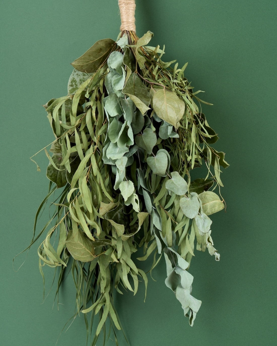 豊かな土壌とのびゆく樹々。グリーンだけを束ねたナチュラル感あふれるスワッグです。個性豊かなシルエットのグリーンたちがふわっと広がるイメージで束ねました。