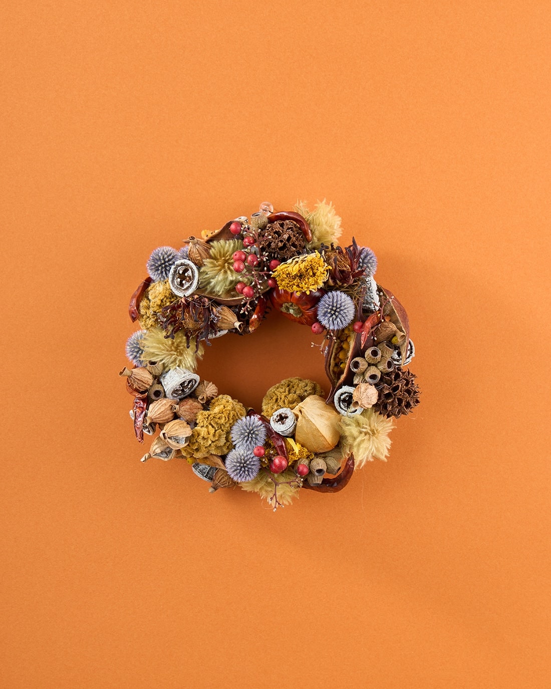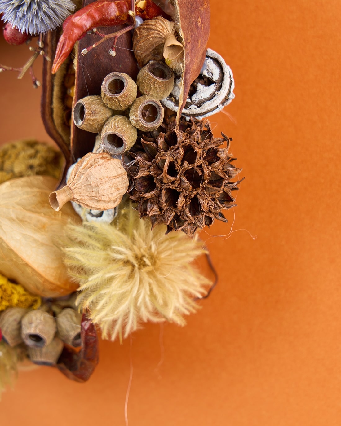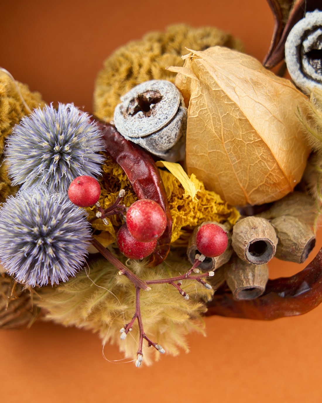 オレンジによく馴染む、暖色系のドライフラワーや実ものを中心に。