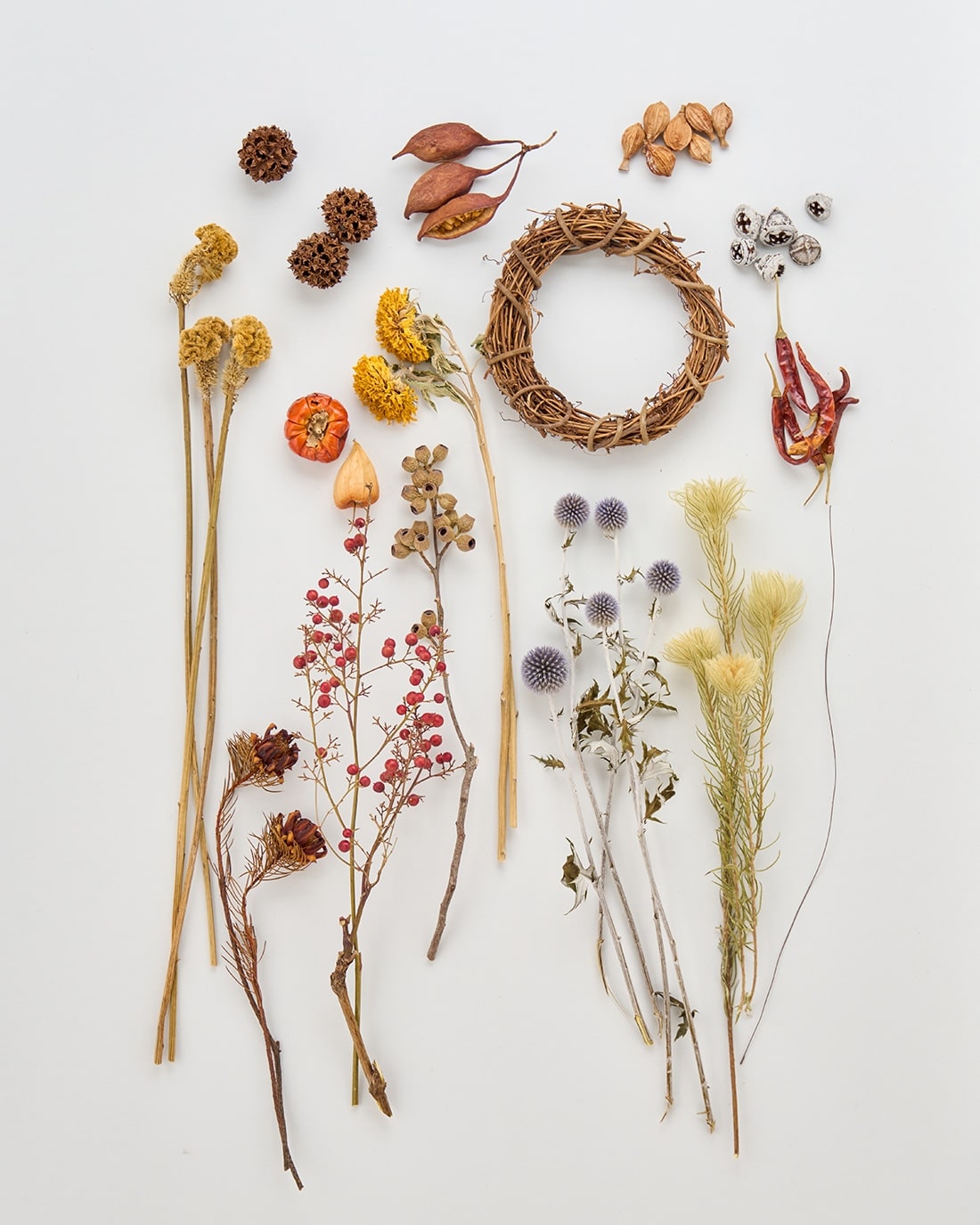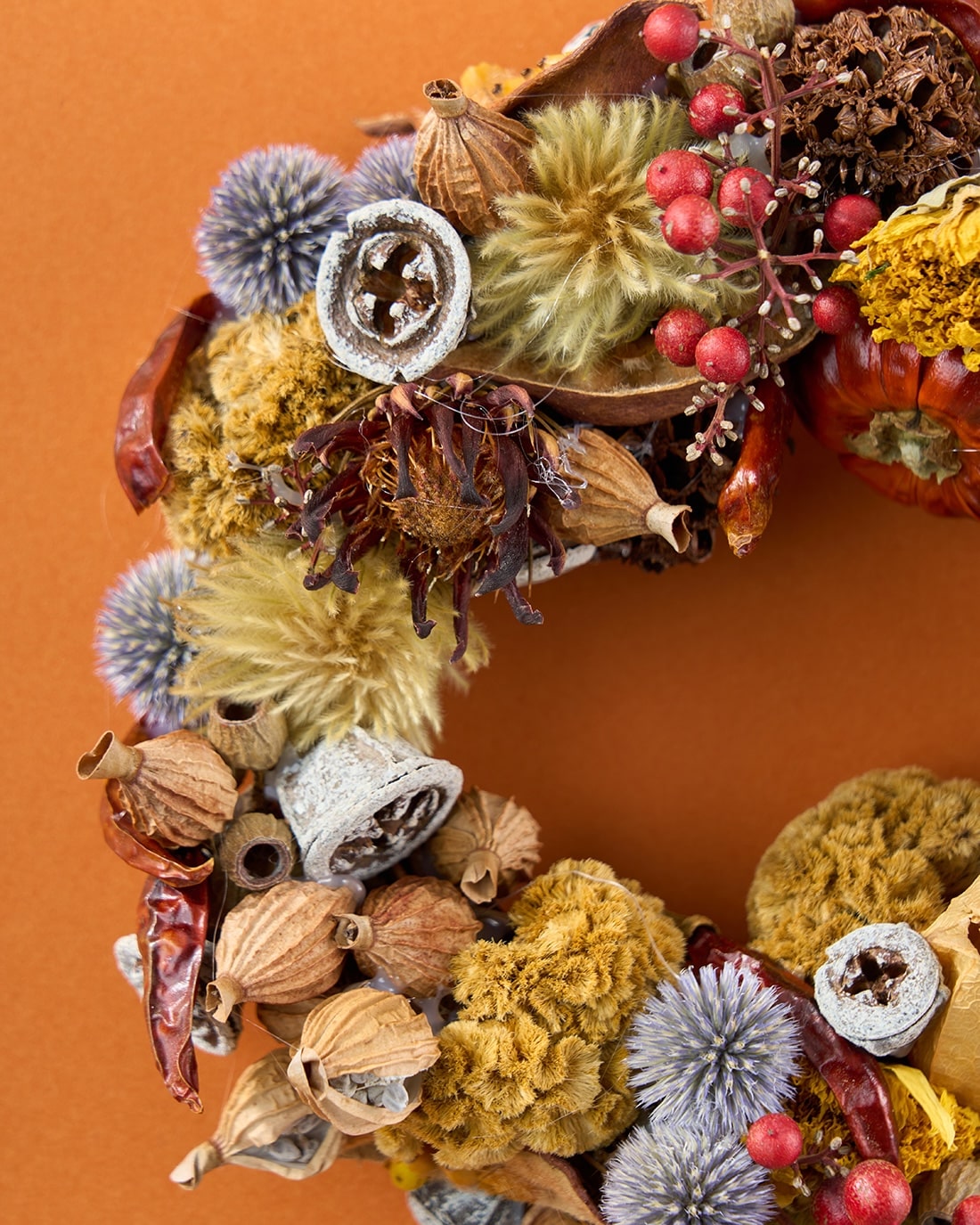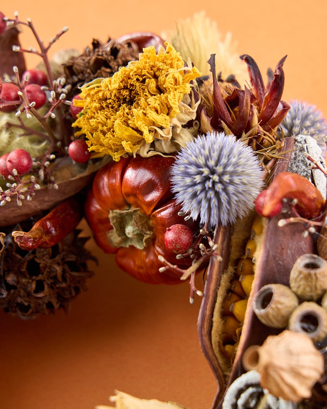 オレンジによく馴染む、暖色系のドライフラワーや実ものを中心に。