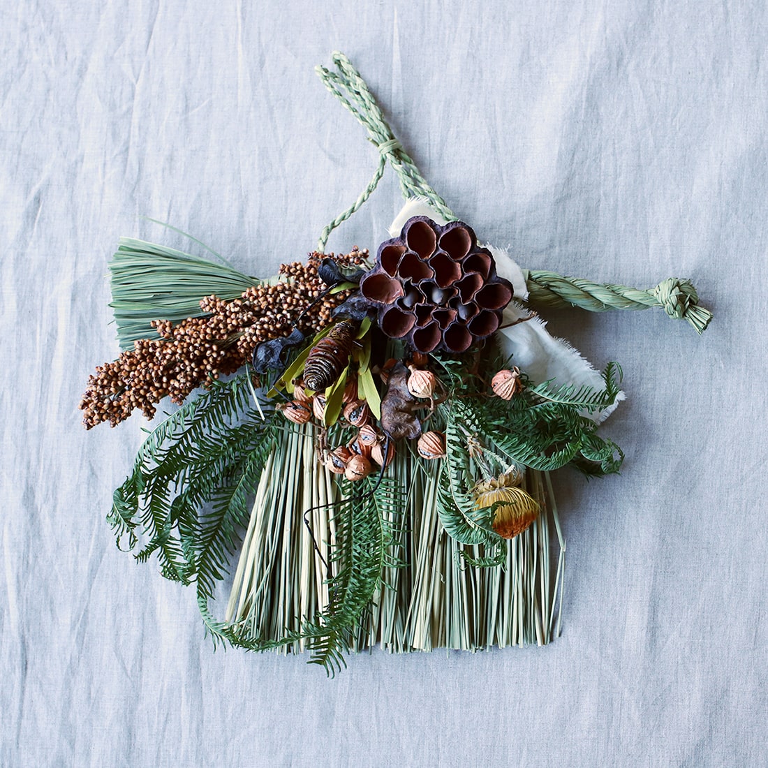 新年は、たくさんの幸せが訪れますように。伊勢しめ縄を使ったお正月飾りです。オレンジとグリーンを基調にした色合いでまとめました。キビやハス、月桃の実などを使って、豊穣への願いを感じていただけるように。予約販売のお品のため、12月15日より順次発送します。販売期間は12月26日までですが、ご注文状況により販売終了日が早まる可能性があります。