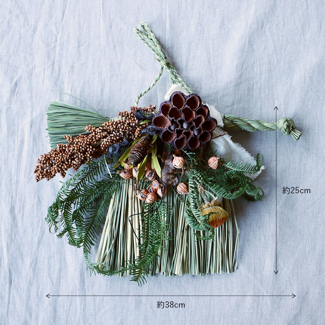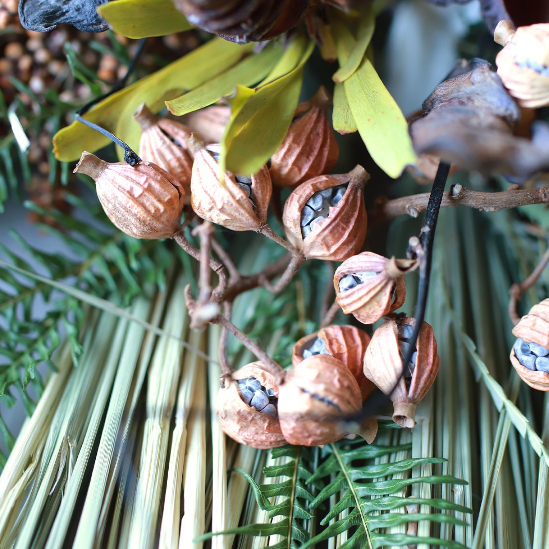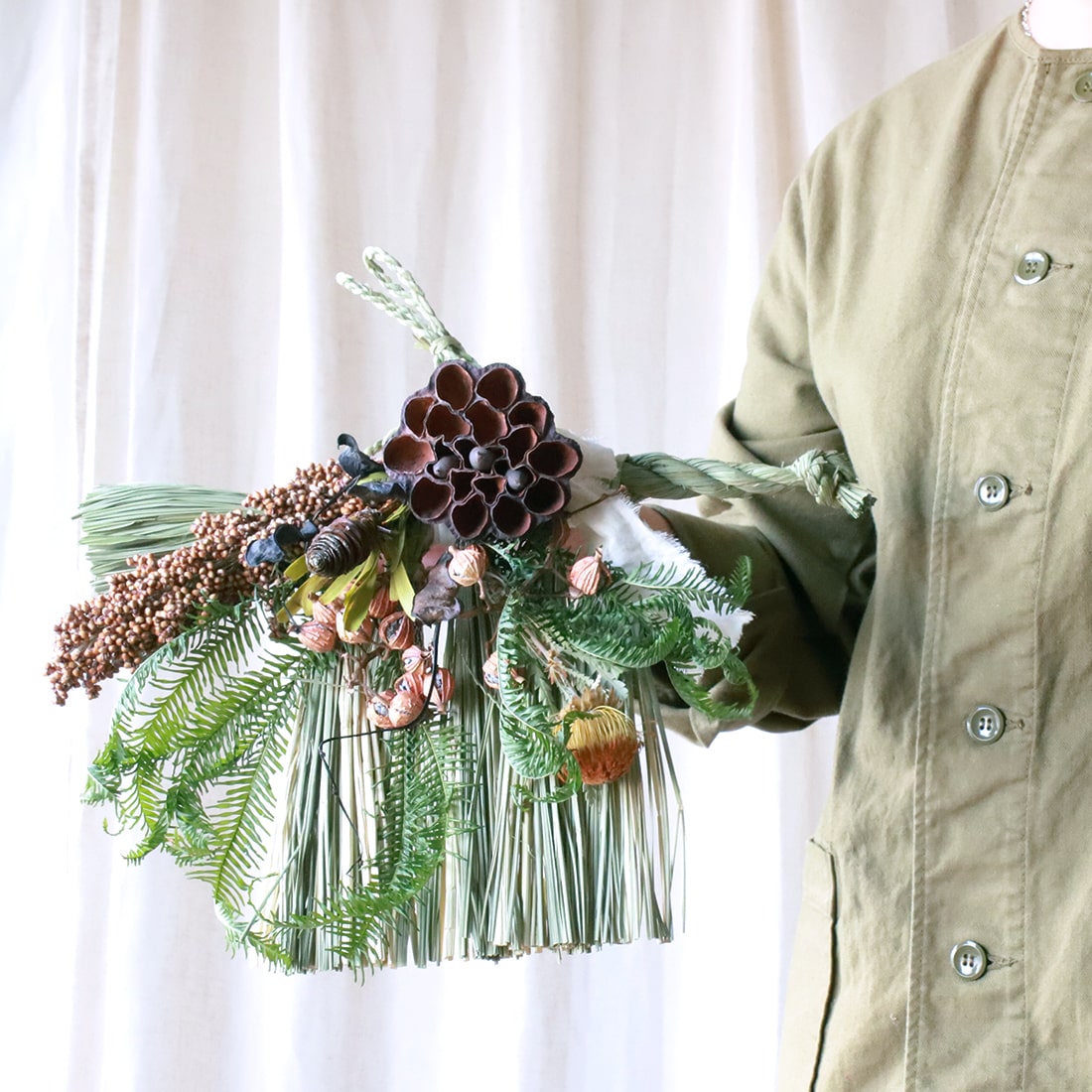 橙(だいだい)や柊(ひいらぎ)などがあしらわれるのが一般的なので、それにならってオレンジやグリーンを基調としたドライフラワーでまとめました。