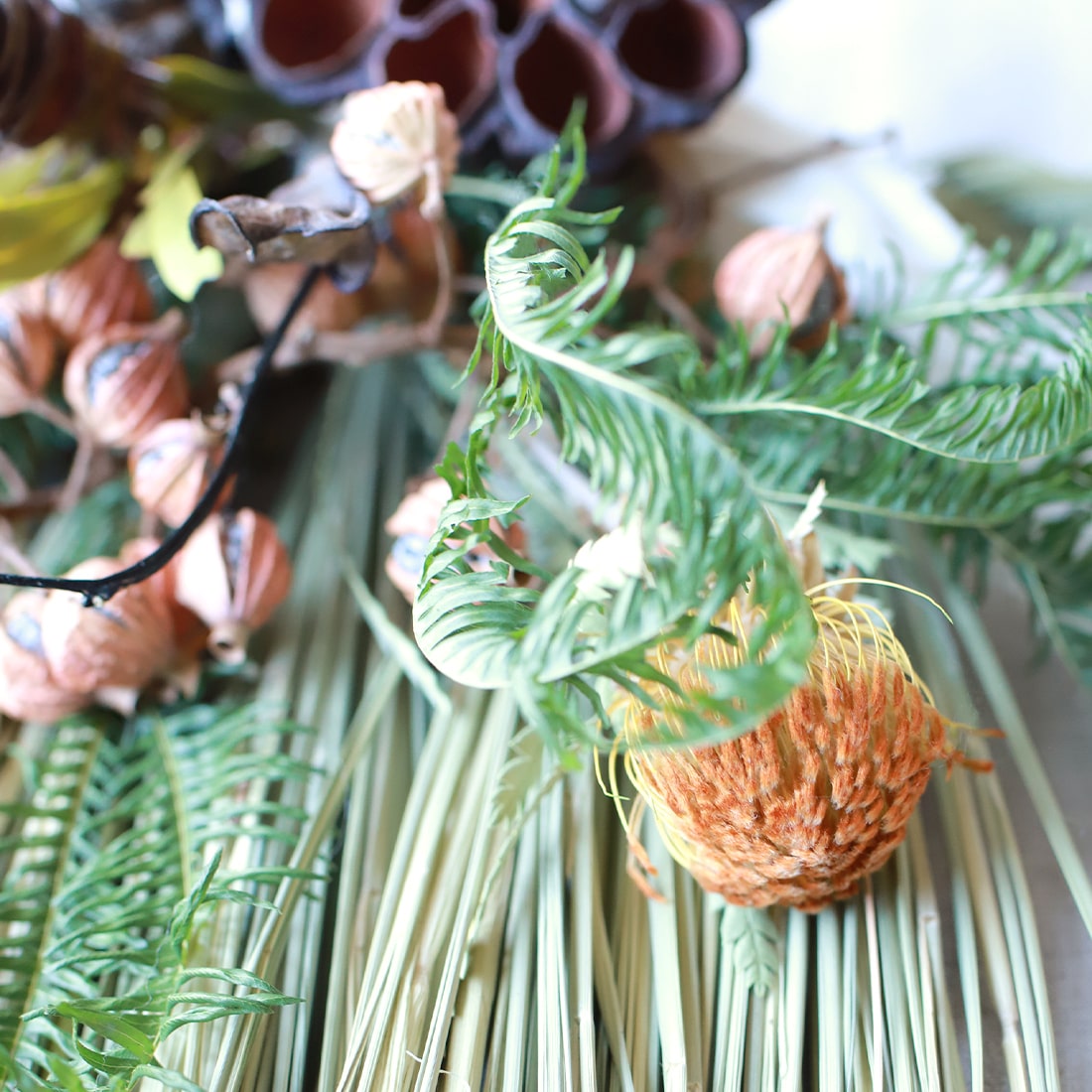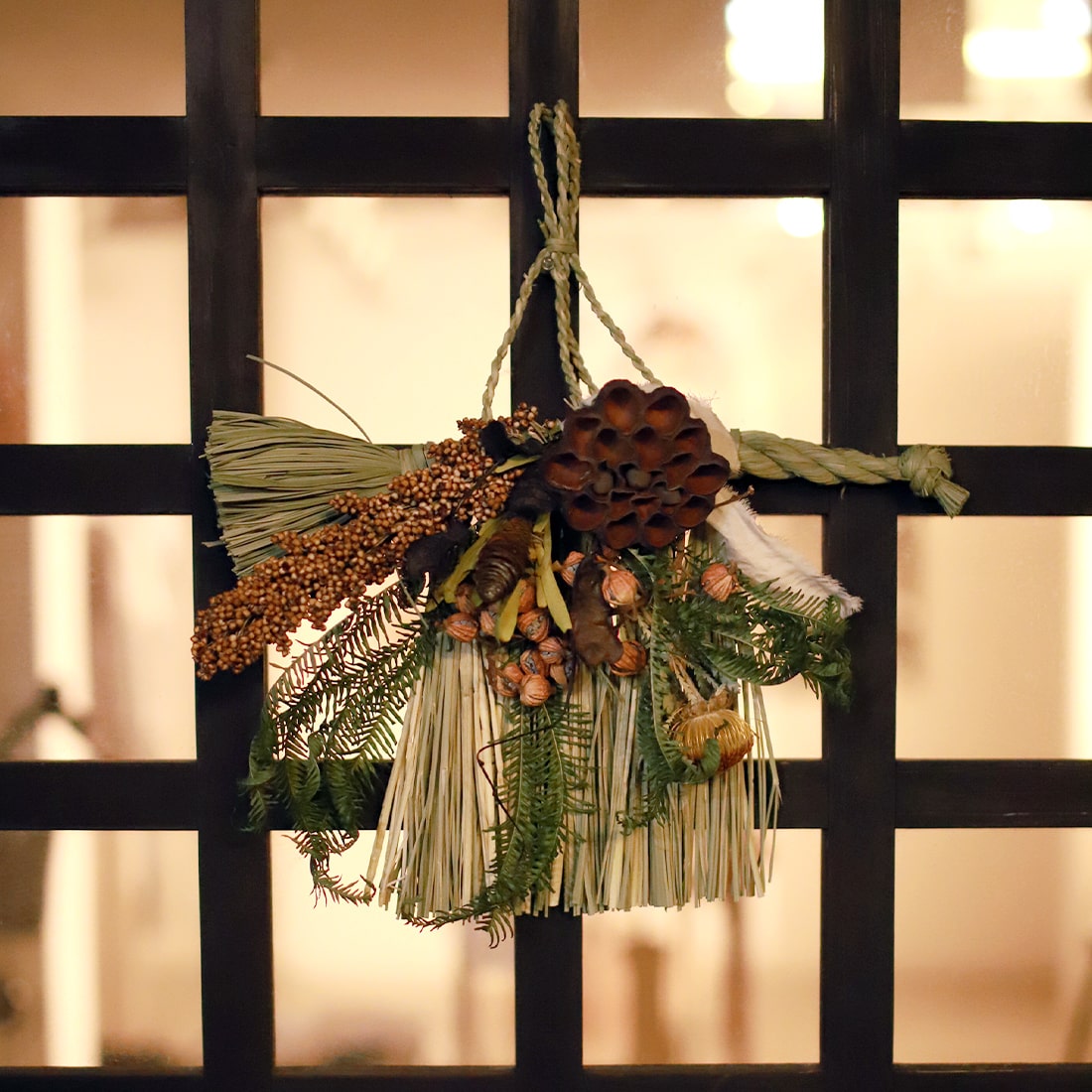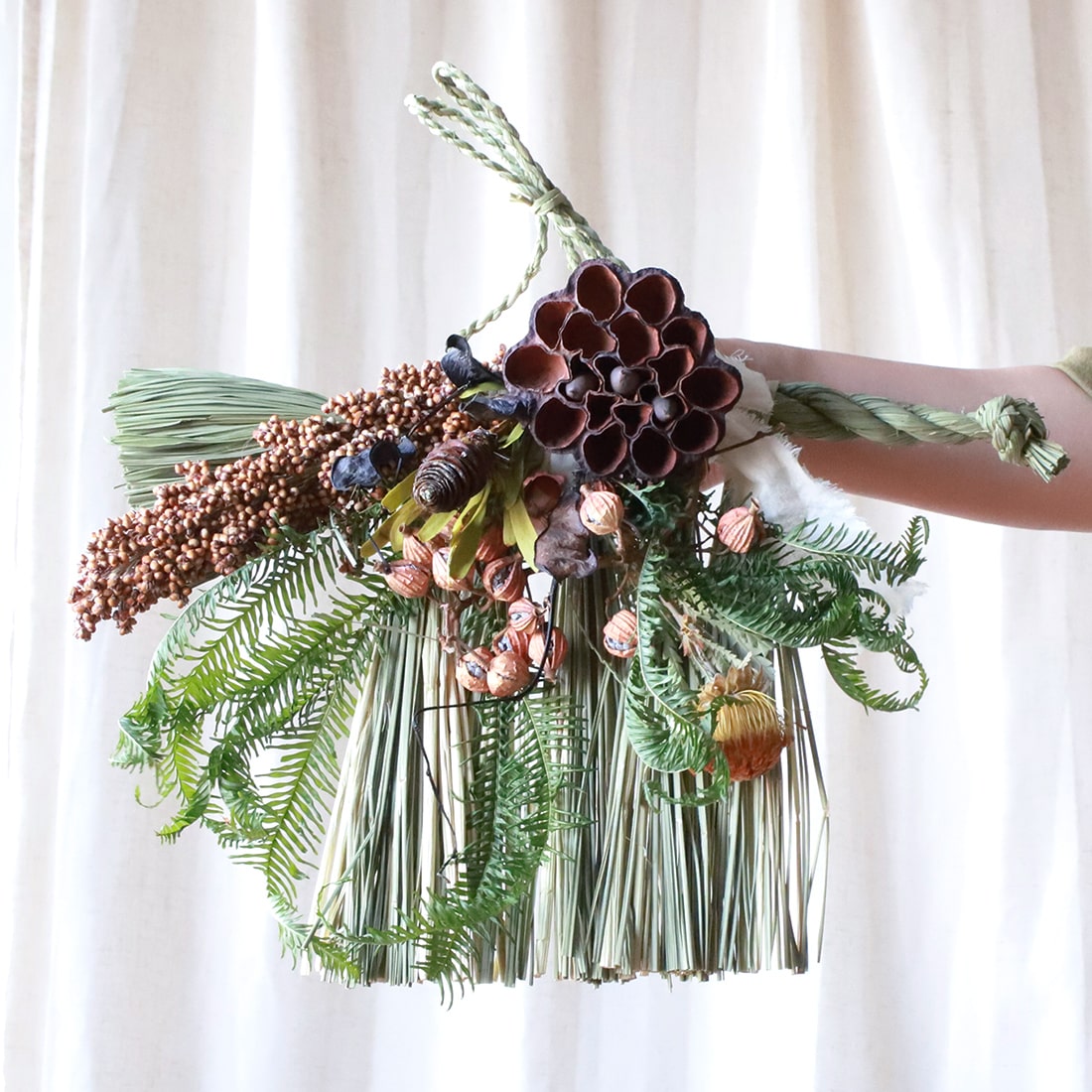 橙(だいだい)や柊(ひいらぎ)などがあしらわれるのが一般的なので、それにならってオレンジやグリーンを基調としたドライフラワーでまとめました。