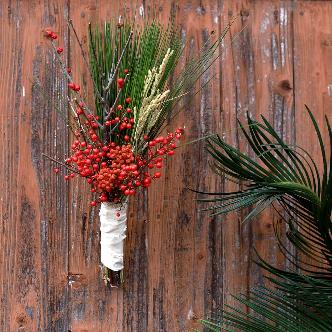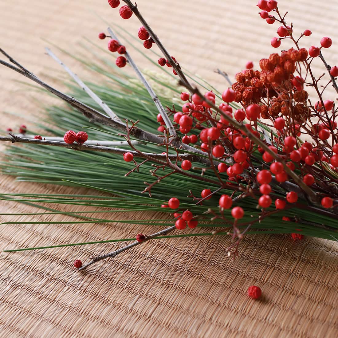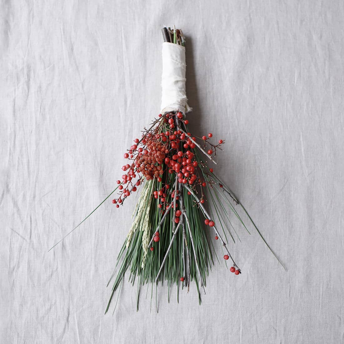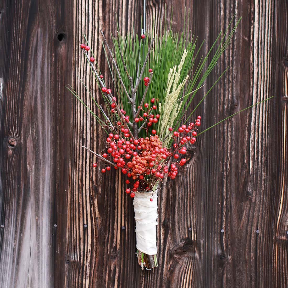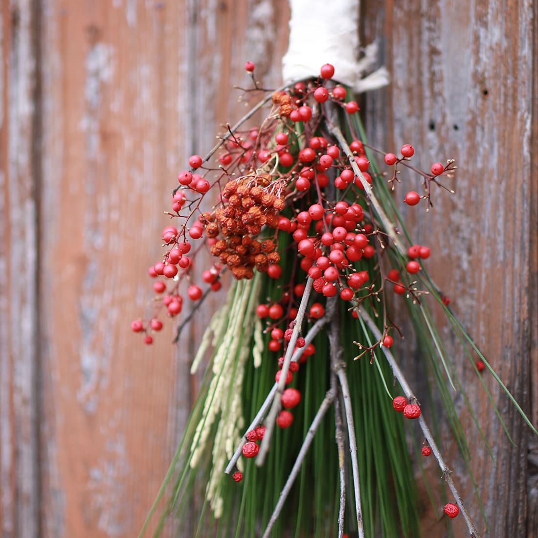 冬の張りつめたような、凛とした空気を閉じ込めて。シンプルだけど、あでやかなお正月飾りをご用意しました。縁起がよいとされる南天や松を使っています。ウメモドキやナナカマドなど、赤い実の共演もお楽しみください。