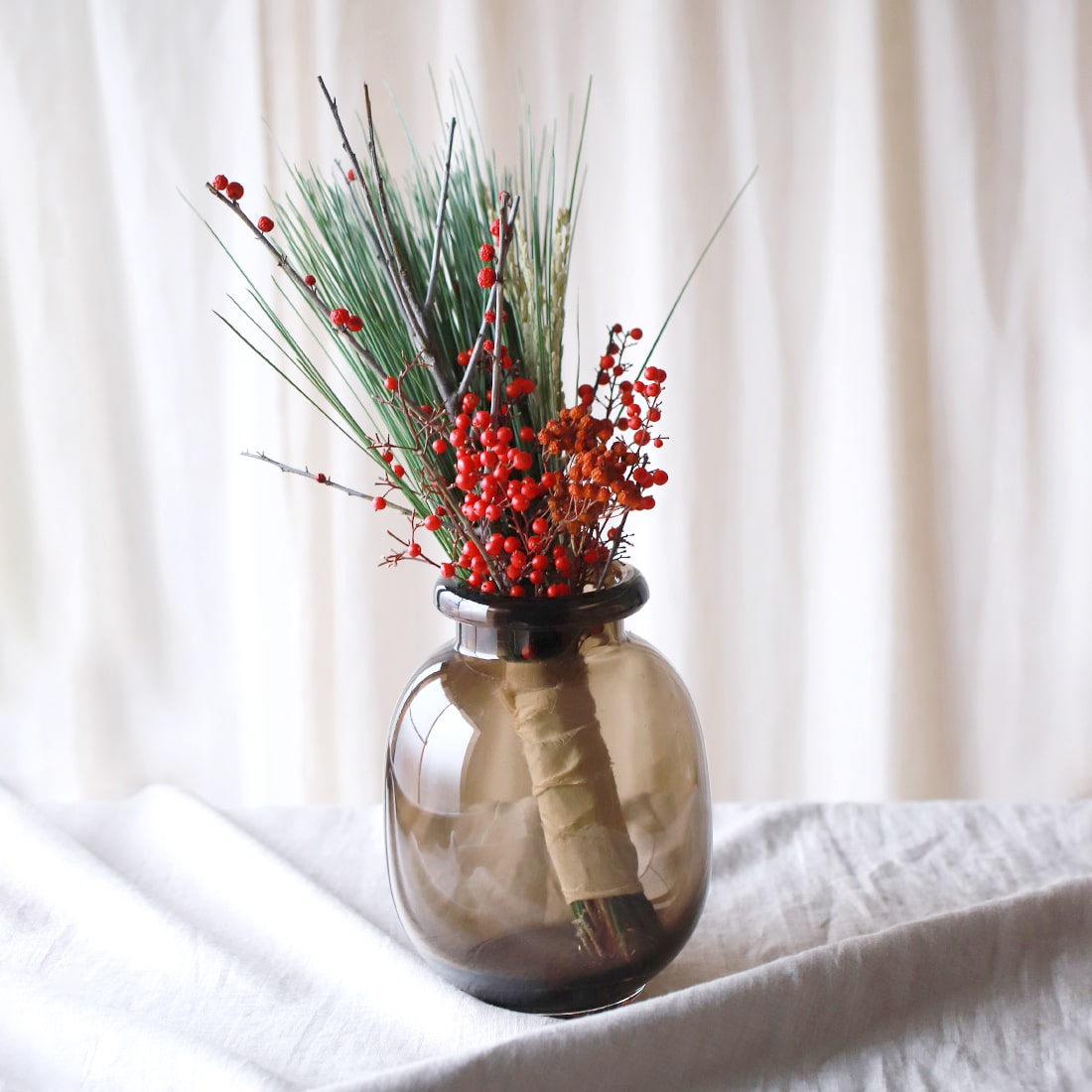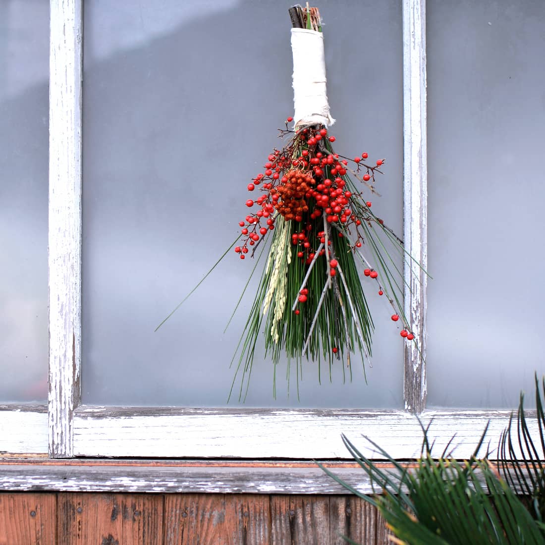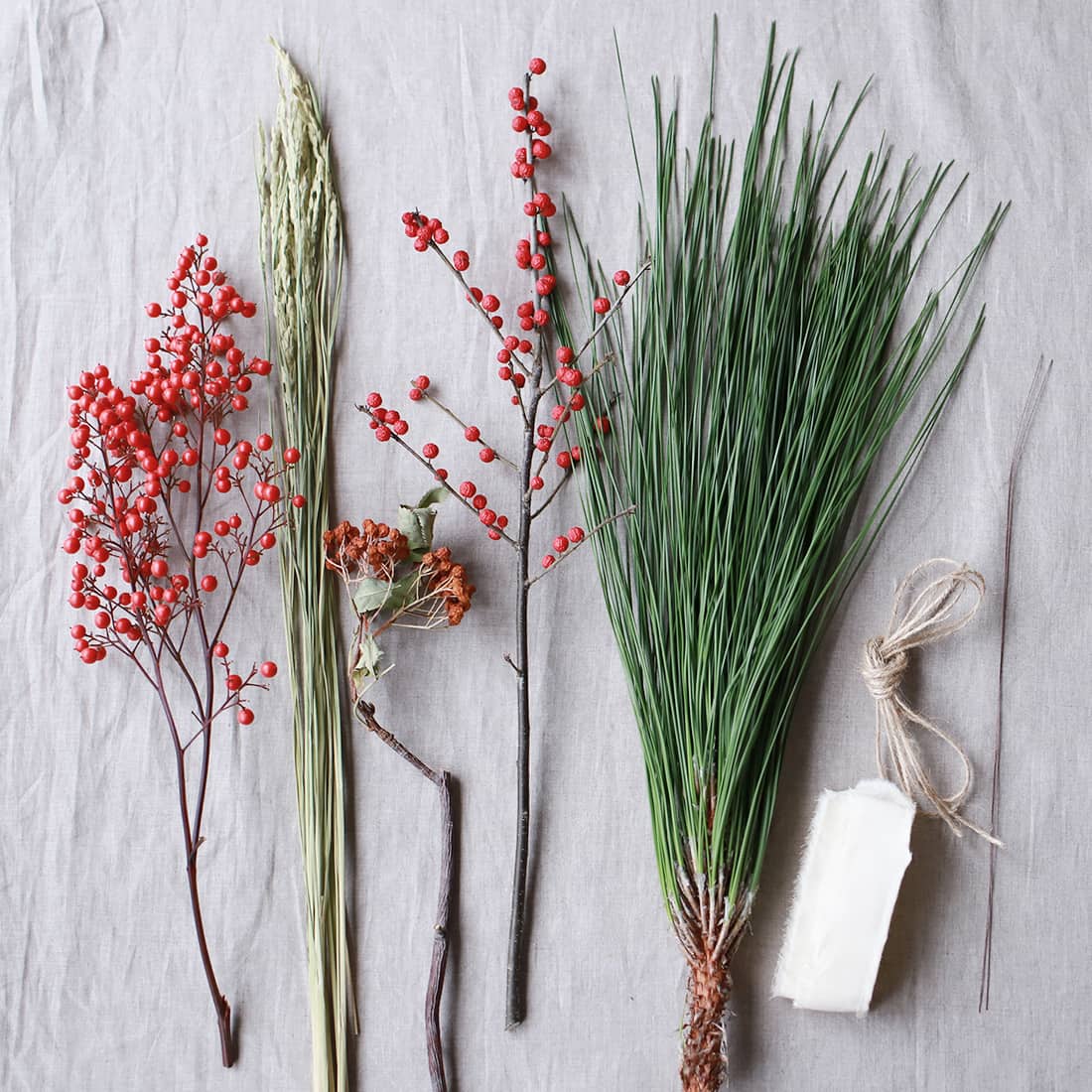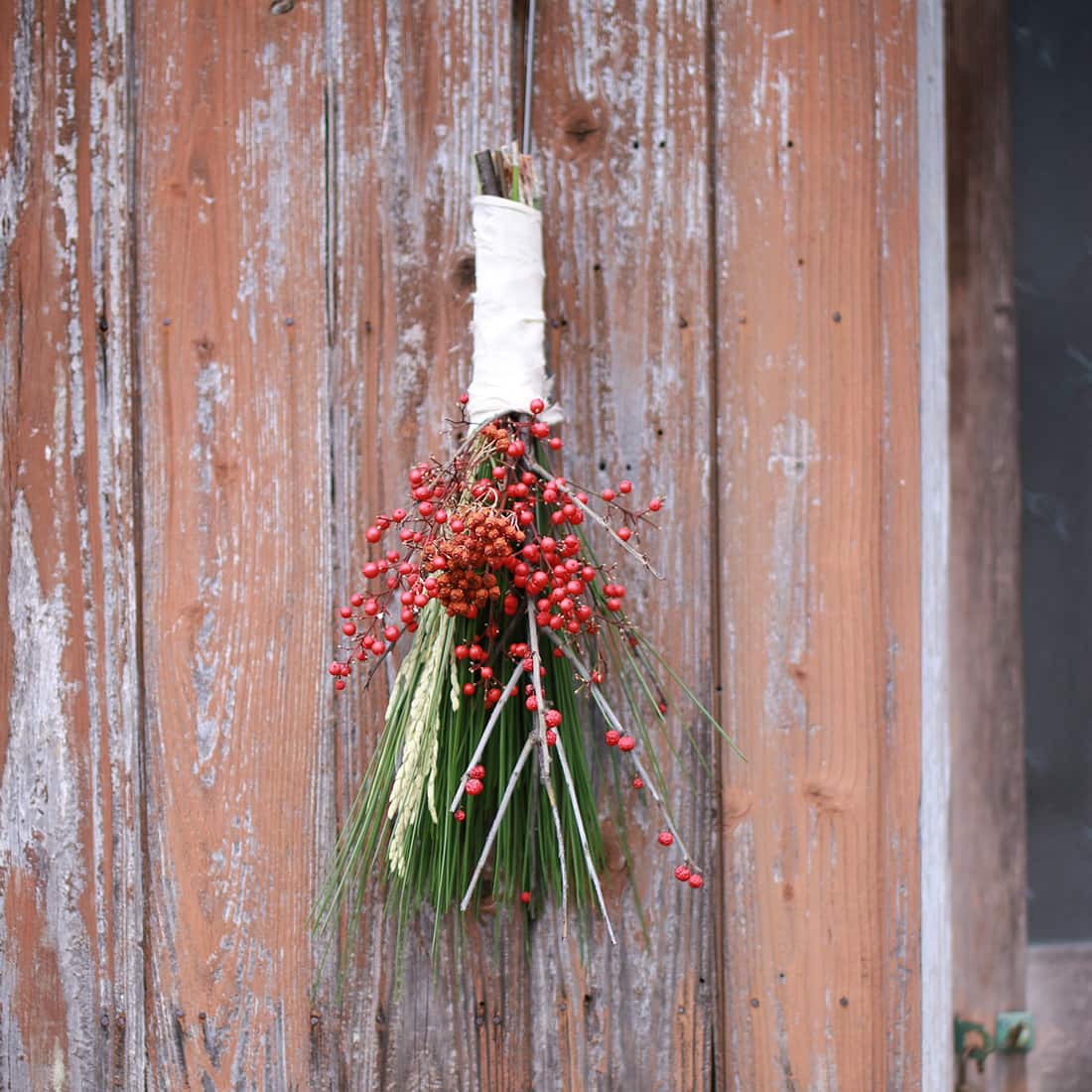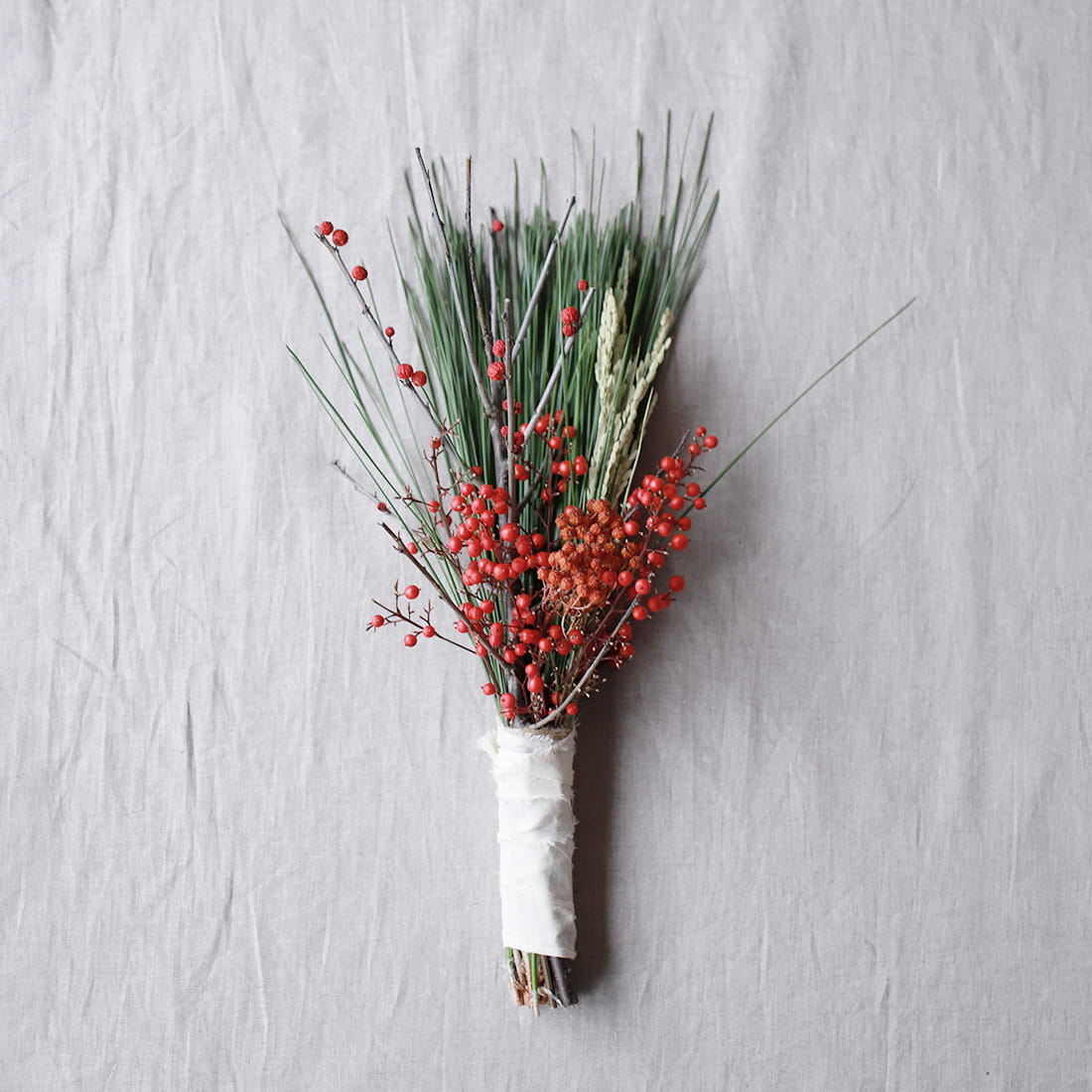 冬の張りつめたような、凛とした空気を閉じ込めて。シンプルだけど、あでやかなお正月飾りをご用意しました。縁起がよいとされる南天や松を使っています。ウメモドキやナナカマドなど、赤い実の共演もお楽しみください。