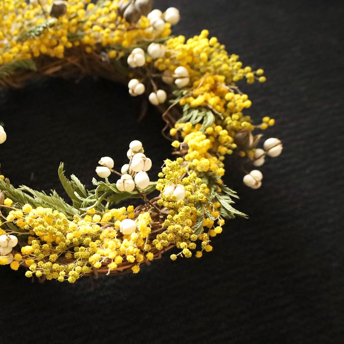 春を告げる花ミモザの、心はなやぐアレンジメントをご用意しました。ミモザと、やさしいホワイトのナンキンハゼをあしらったリースです。