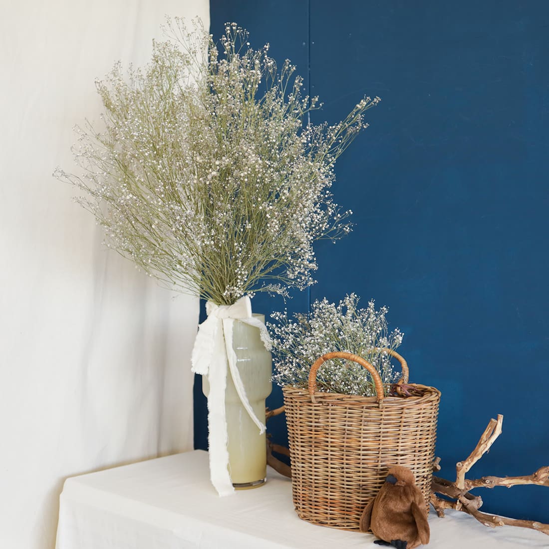 「Baby’s breath=愛しい人の吐息」とも呼ばれるカスミソウ。アンティークな雰囲気なドライのものををたっぷり丸く束ねてブーケに仕立てました。「いつまでもお幸せに」と願いをこめて。大切な方への贈りものやウエディングのシーンにぴったりなブーケです。