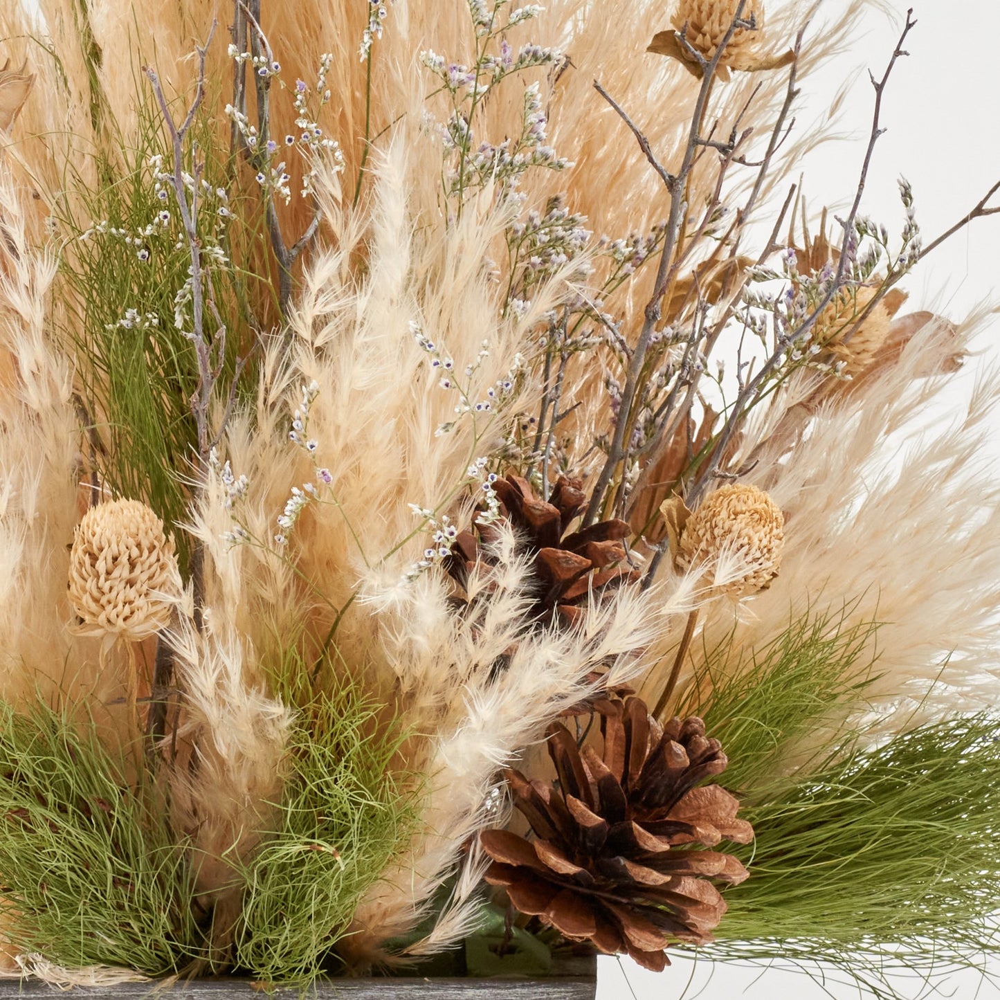 クールでスタイリッシュな雰囲気の中にも可愛らしさや温もりを感じていただけるよう、コットンフラワーや松ぼっくりをお入れしました。