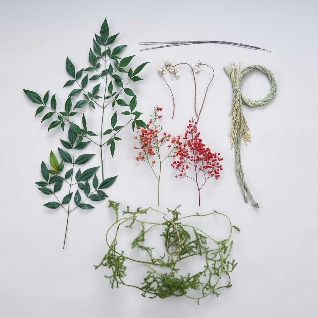| 手作りキットの内容 | 豊作しめ飾り 1個/南天の実 1束/南天の葉 1束/ヒカゲノカズラ 1束/ナンキンハゼ ショート 1束(1-3本程度)/テーピングワイヤー #26 10本/*季節によって一部が似寄りになる場合があります /*キットの花材は長さが短い状態でお届けする場合があります |