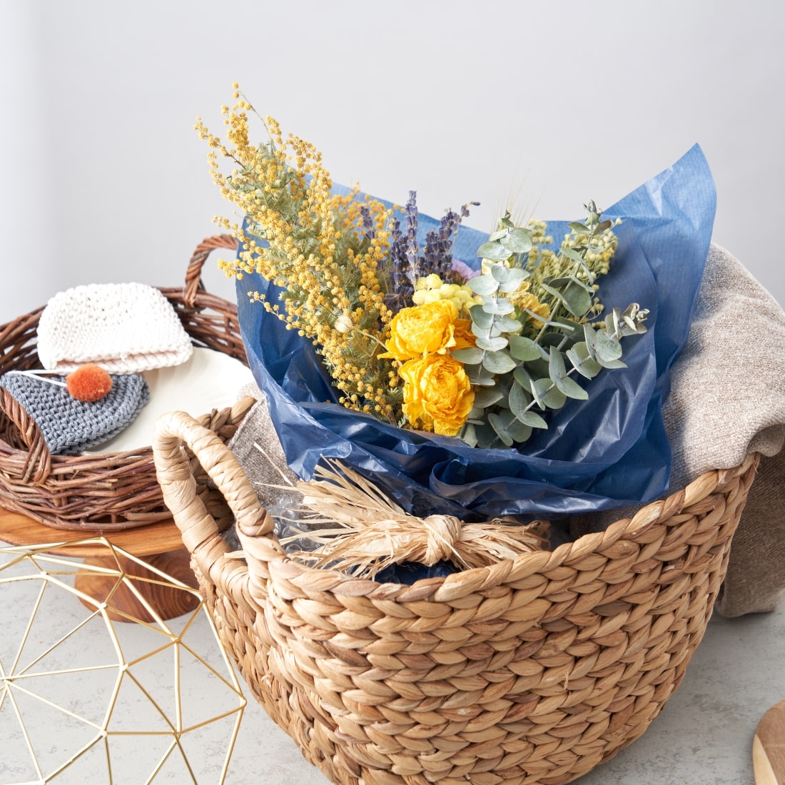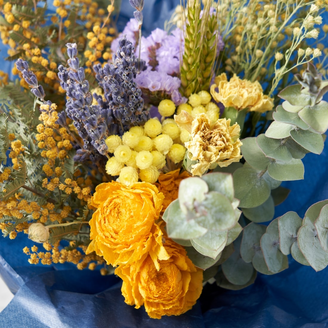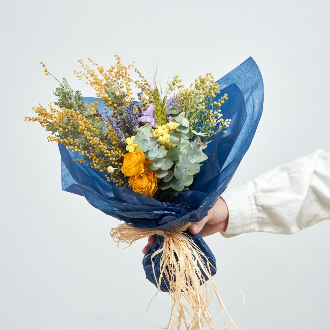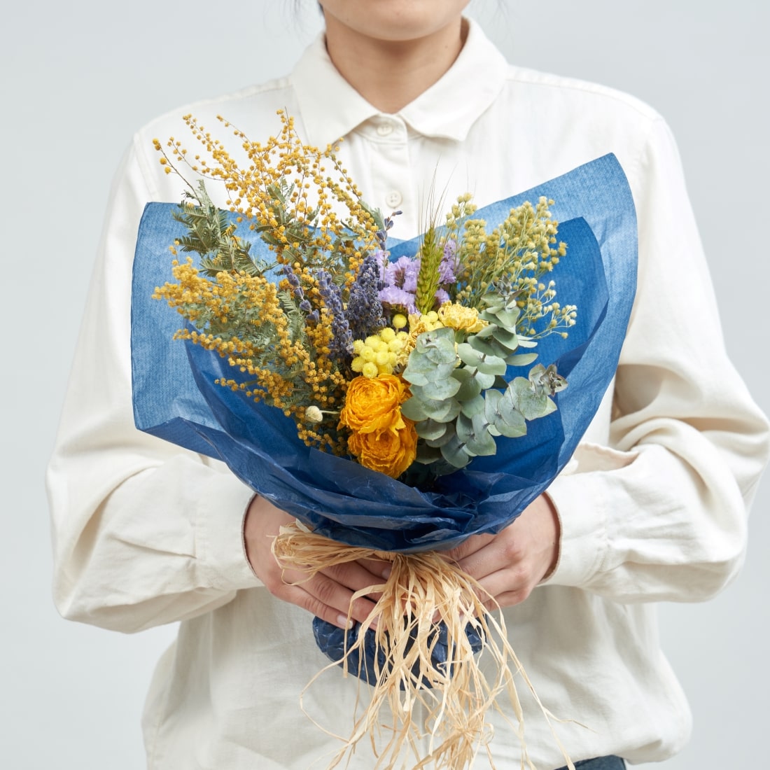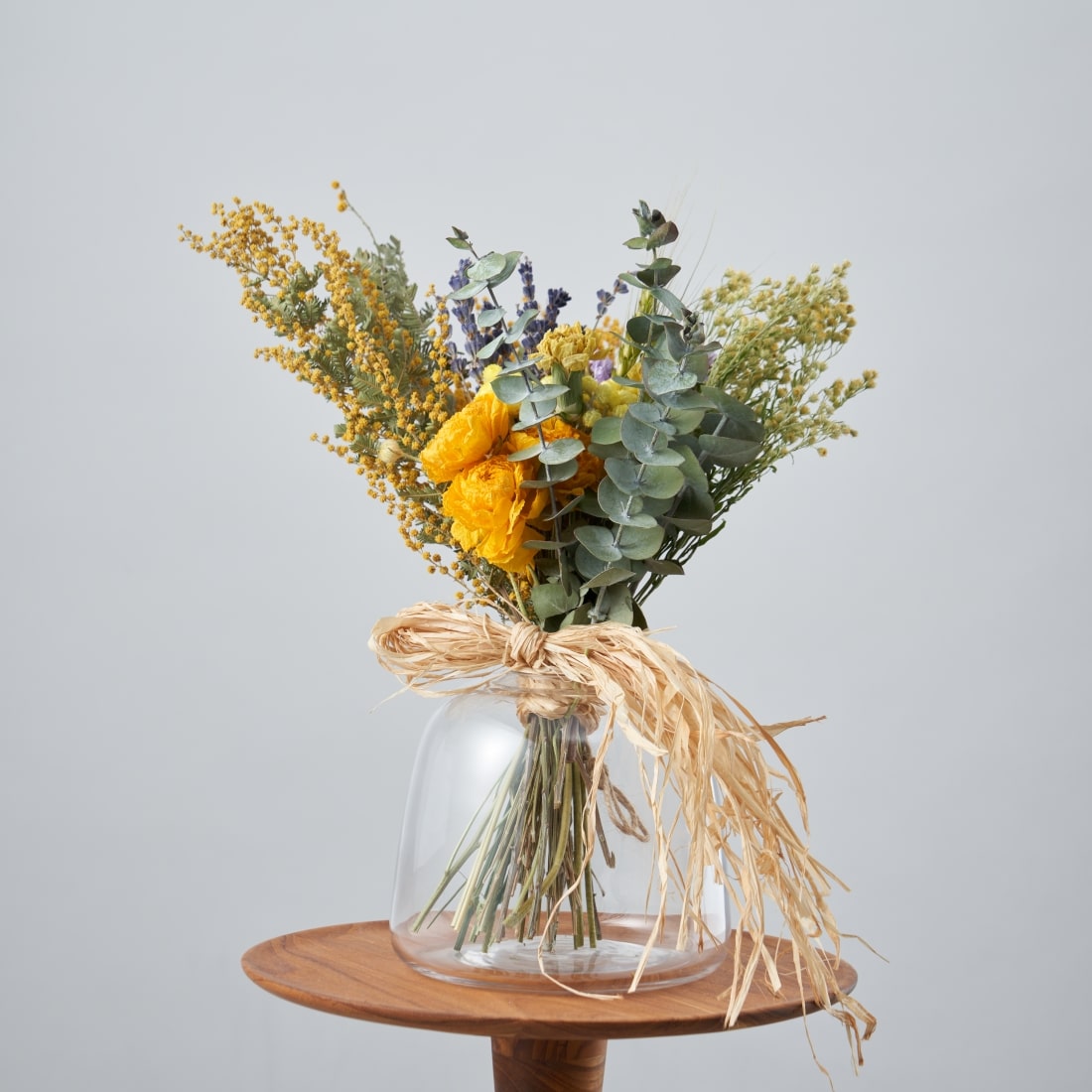 ひだまりみたいな色合いのドライボタニカルたちを集めて、思わず顔がほころぶブーケに仕立てました。