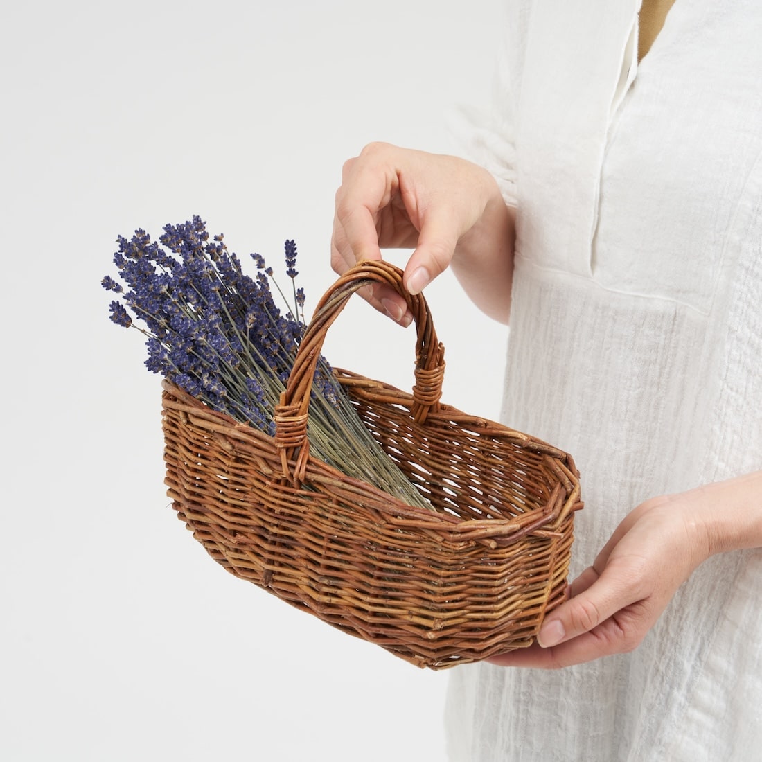 目の覚めるような紫のラベンダーと、ラベンダーを飾るのにちょうど良いサイズ感のかごをセットにしてお届けします。スリムなかごだから、お好きな場所にちょこんと飾れます。お部屋に広がる癒しの香りをお楽しみください。