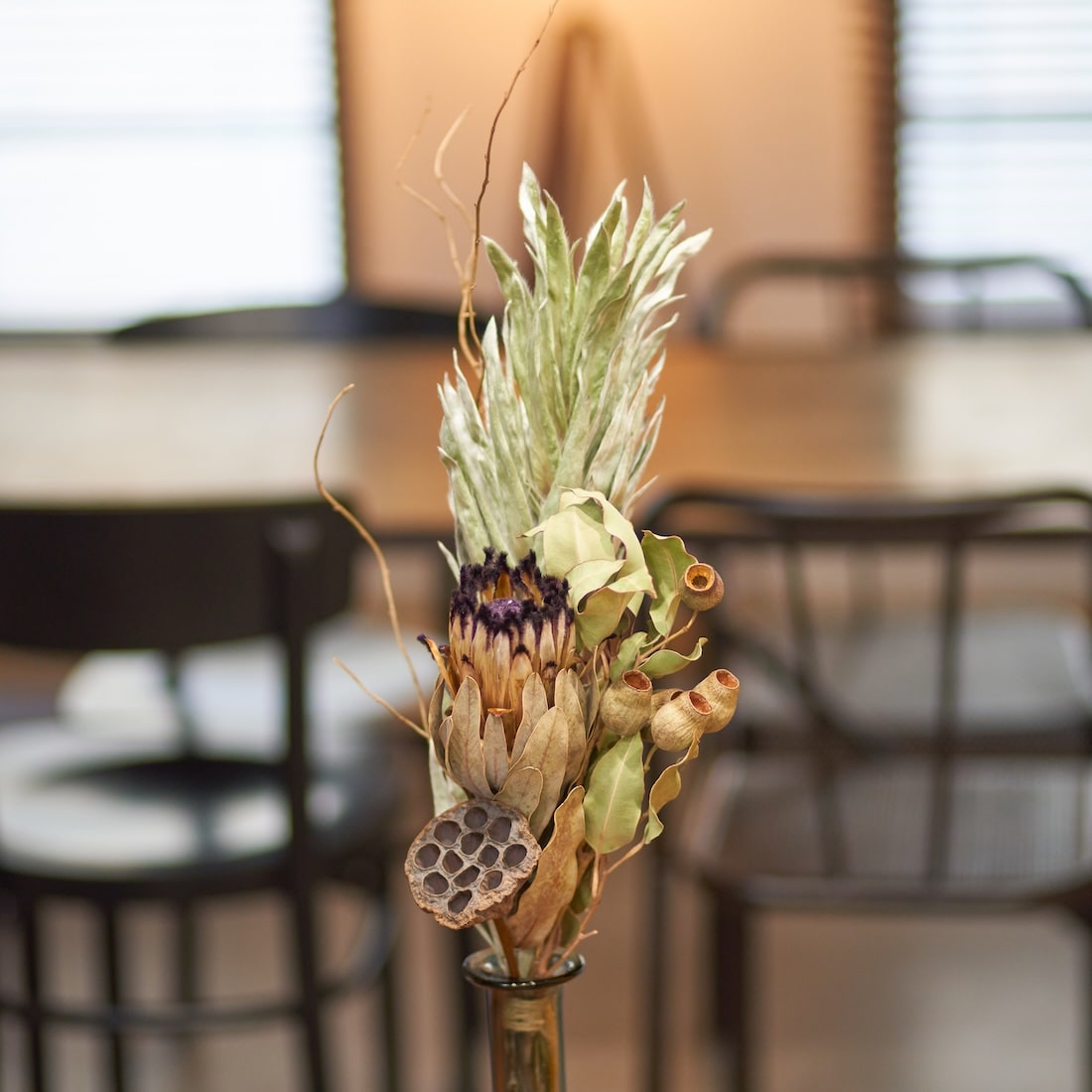 先端の苞(ほう)がふわふわのプロテアニオベや不思議な見た目のハス、ぽこぽこ感が可愛いユーカリトランペットなど、シルエットがユニークなドライボタニカルばかり。