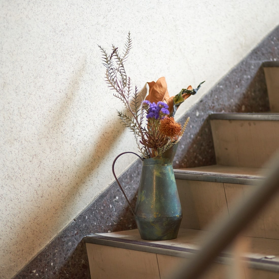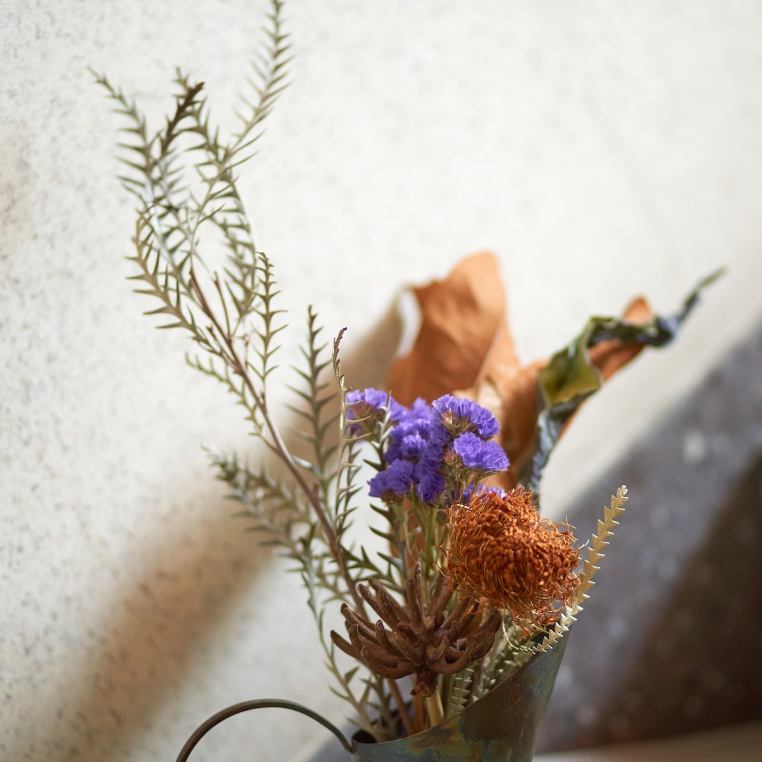アンティークなドライボタニカルの色彩と、古びたアイアンの色味が、互いを引き立てます。