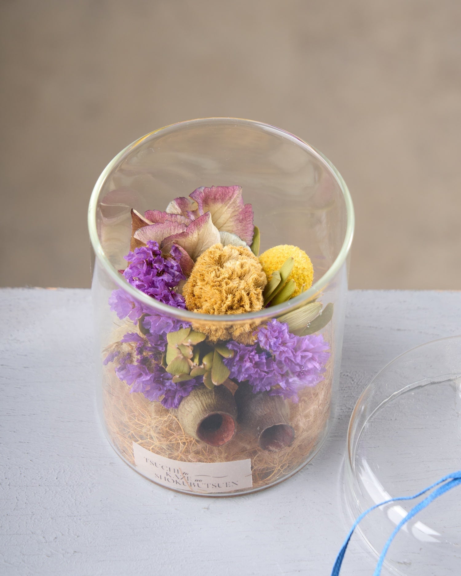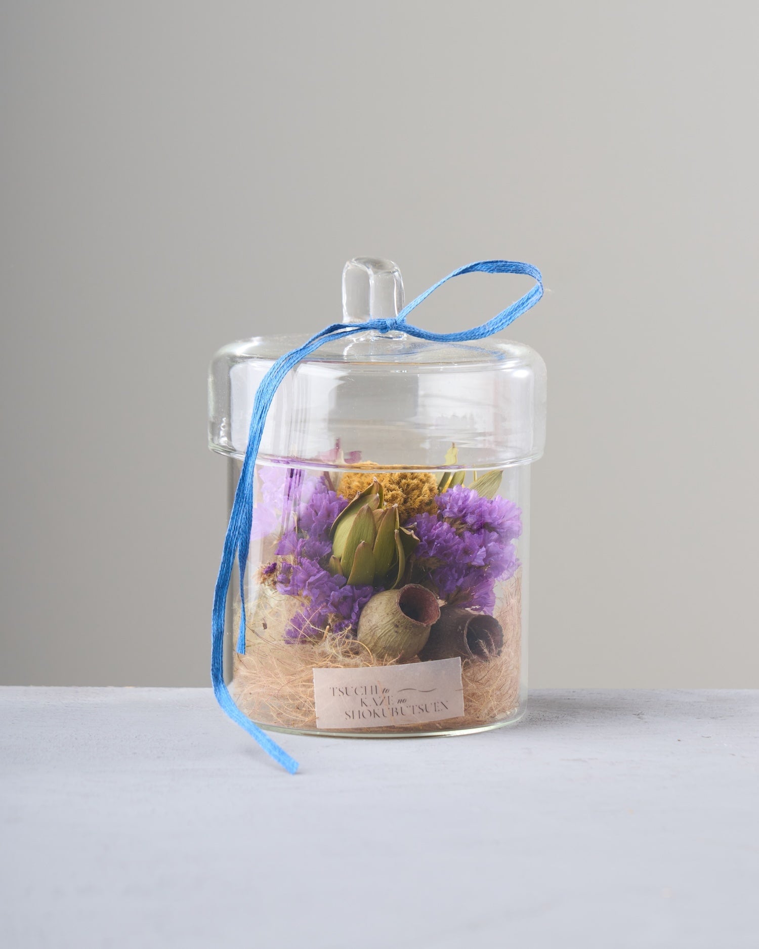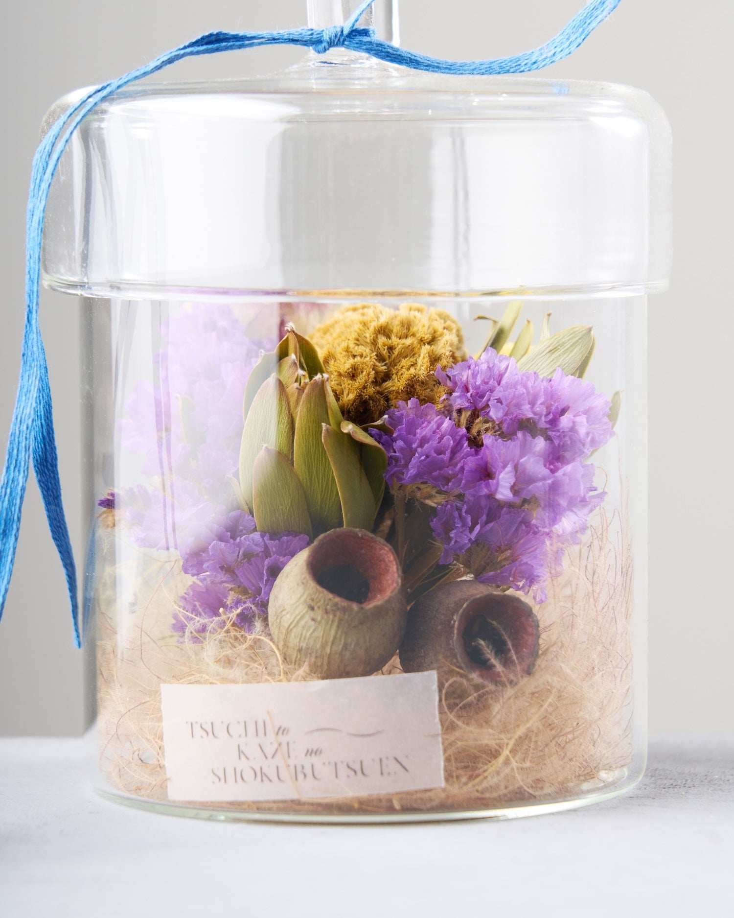 土と風の植物園オリジナルの、ガラスキャニスター入りの仏花です。ドライフラワーの豊かな色彩が、仏前とあなたの心を明るく照らします。フローリストが季節のドライフラワーをお選びし、その時々に思い浮かんだテーマに合わせてお作りします。