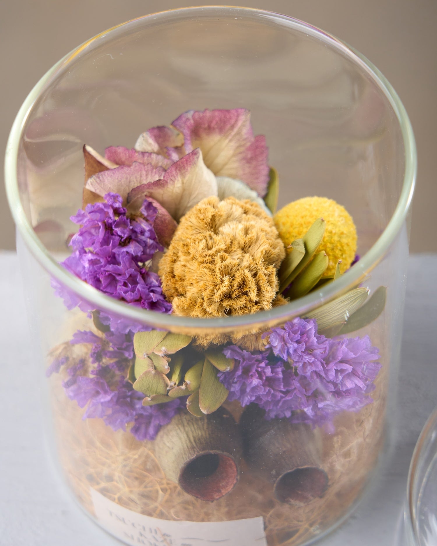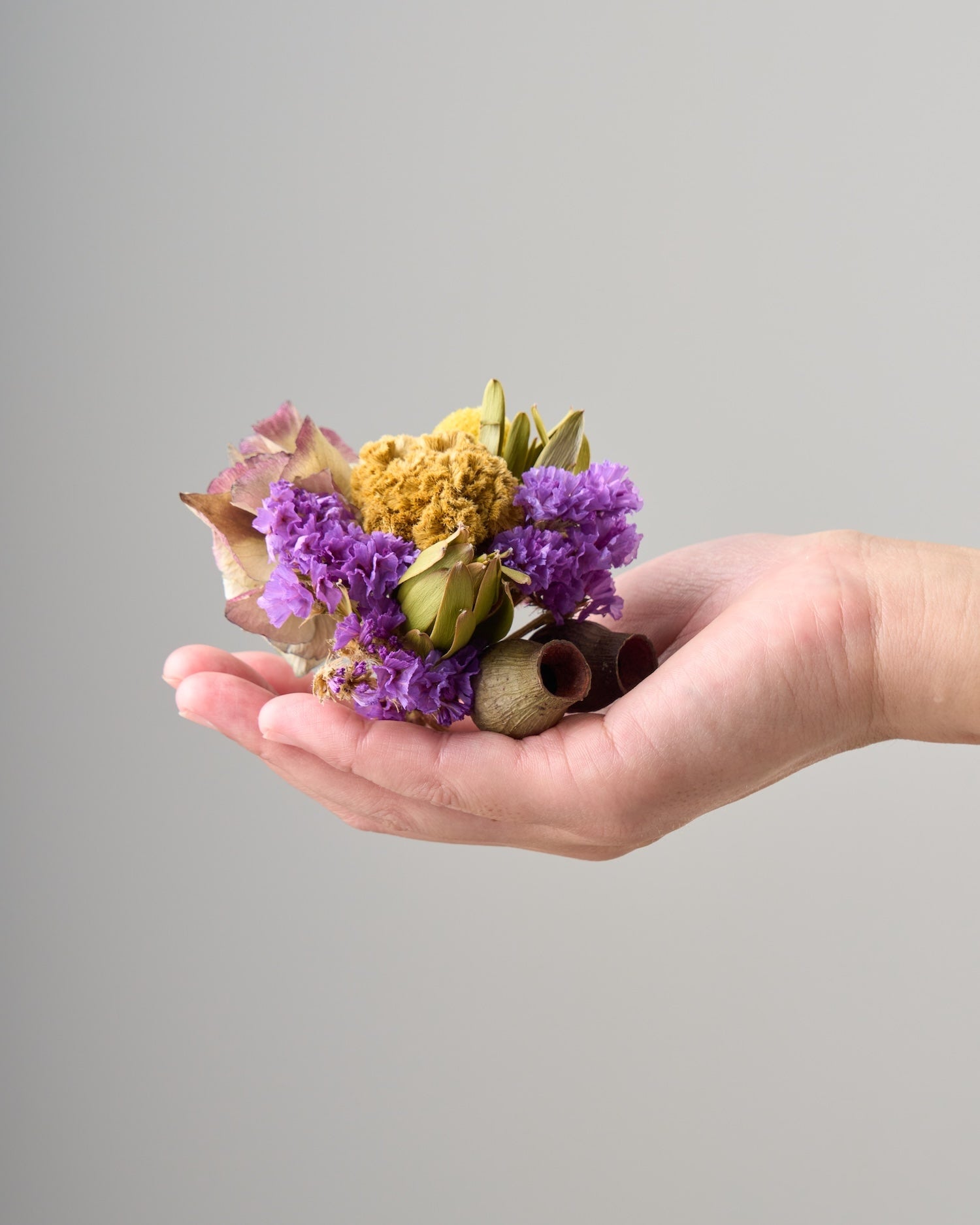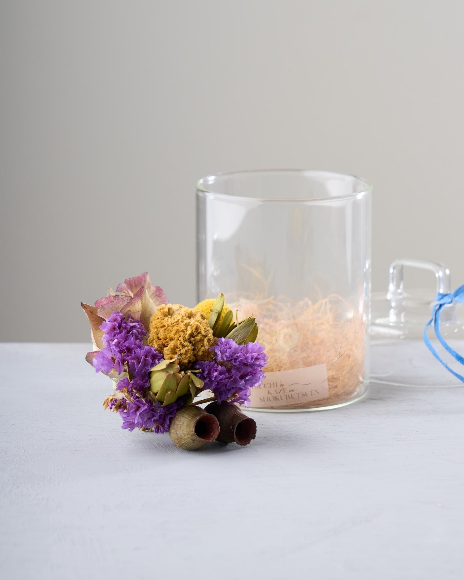 土と風の植物園オリジナルの、ガラスキャニスター入りの仏花です。ドライフラワーの豊かな色彩が、仏前とあなたの心を明るく照らします。フローリストが季節のドライフラワーをお選びし、その時々に思い浮かんだテーマに合わせてお作りします。