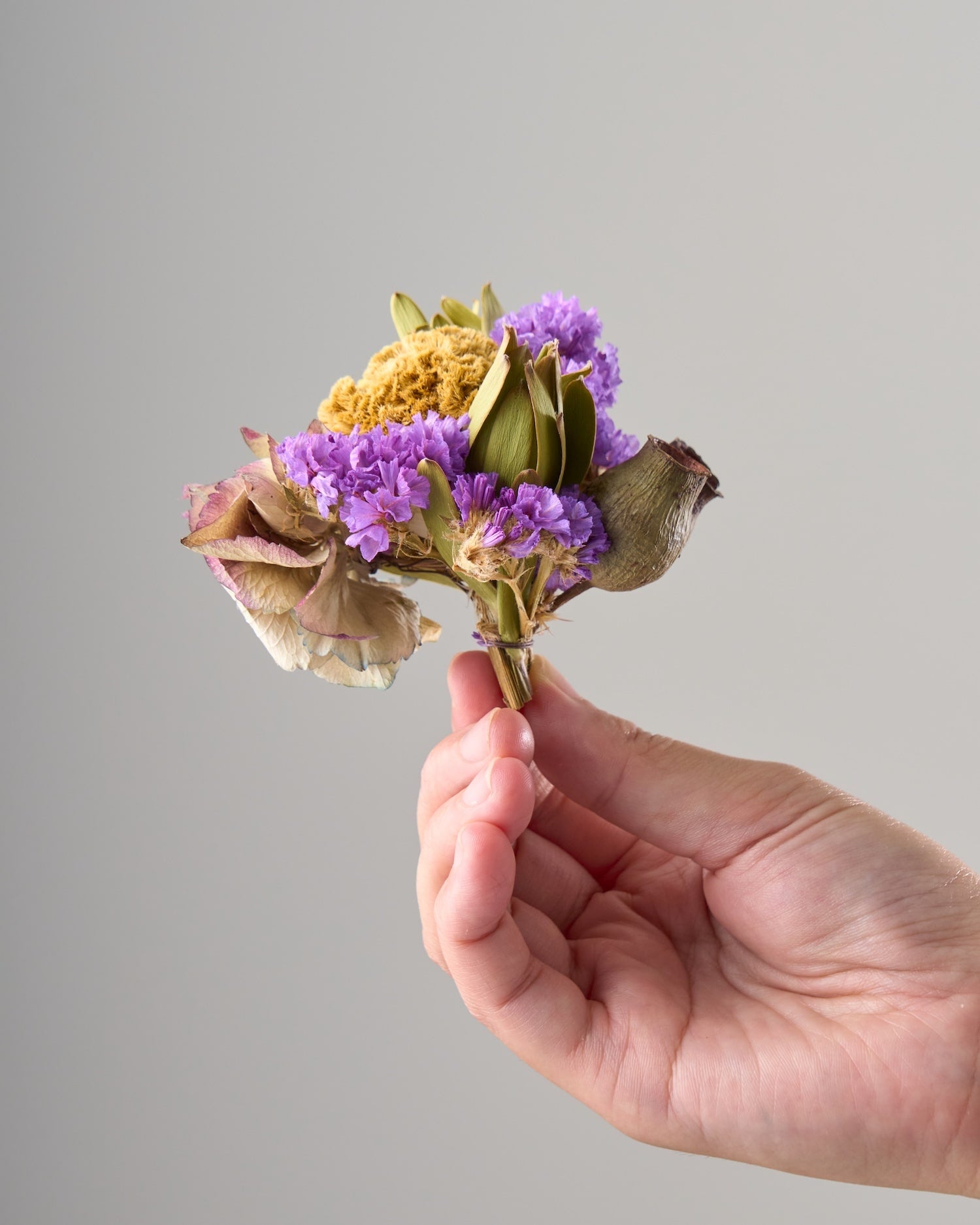 入れ替えの時は、先に花屑を敷き詰め、その上に束ねたドライフラワーをふんわりとのせてください。