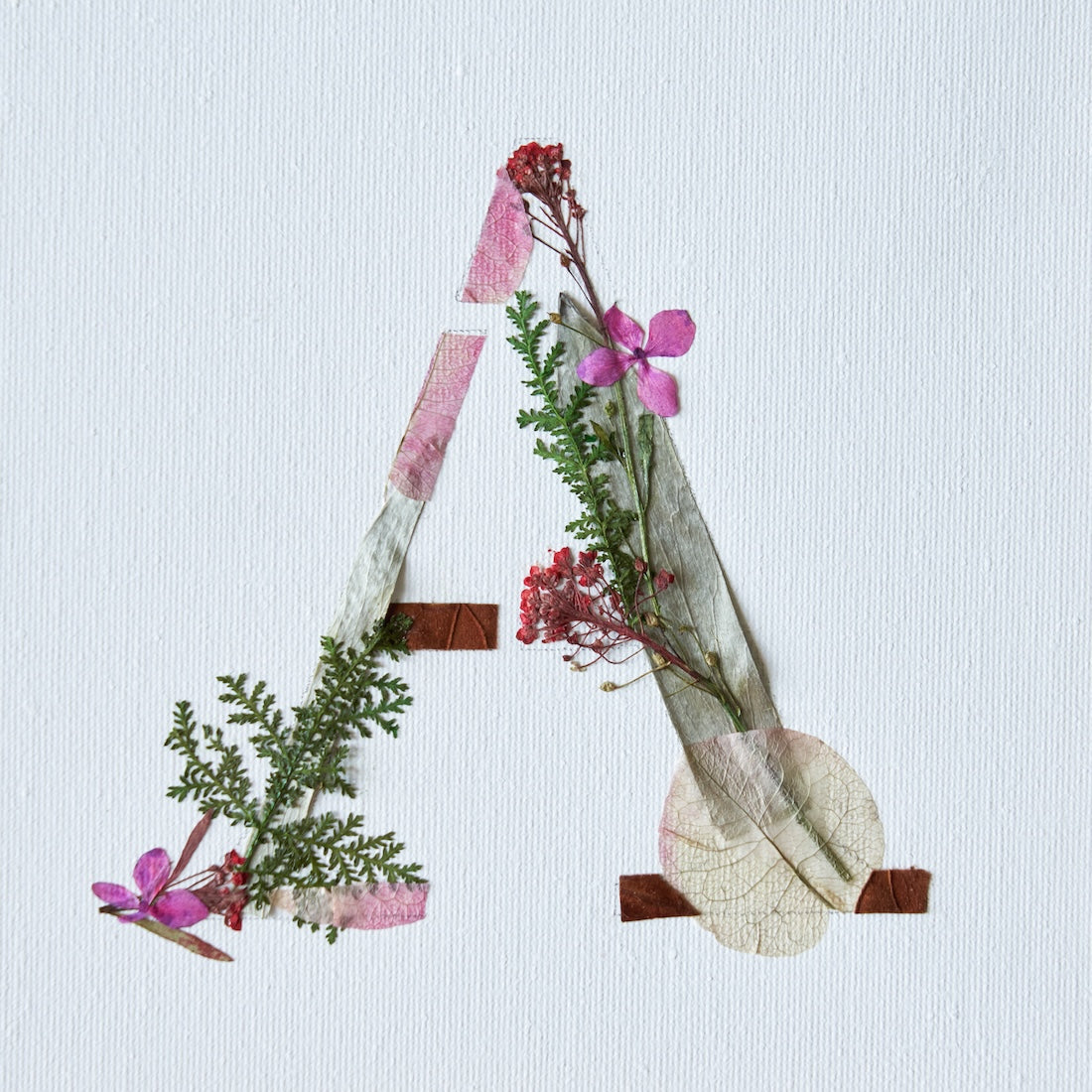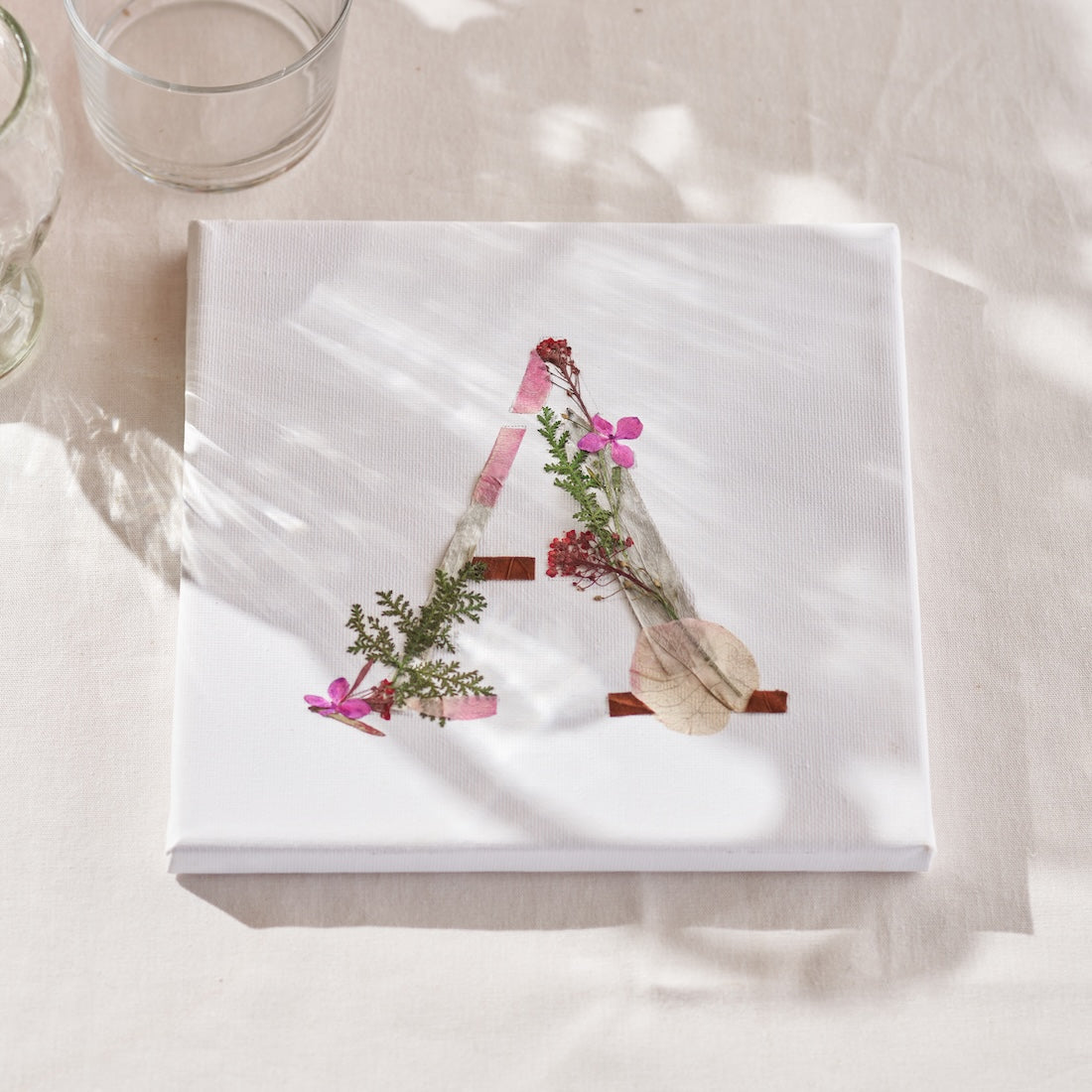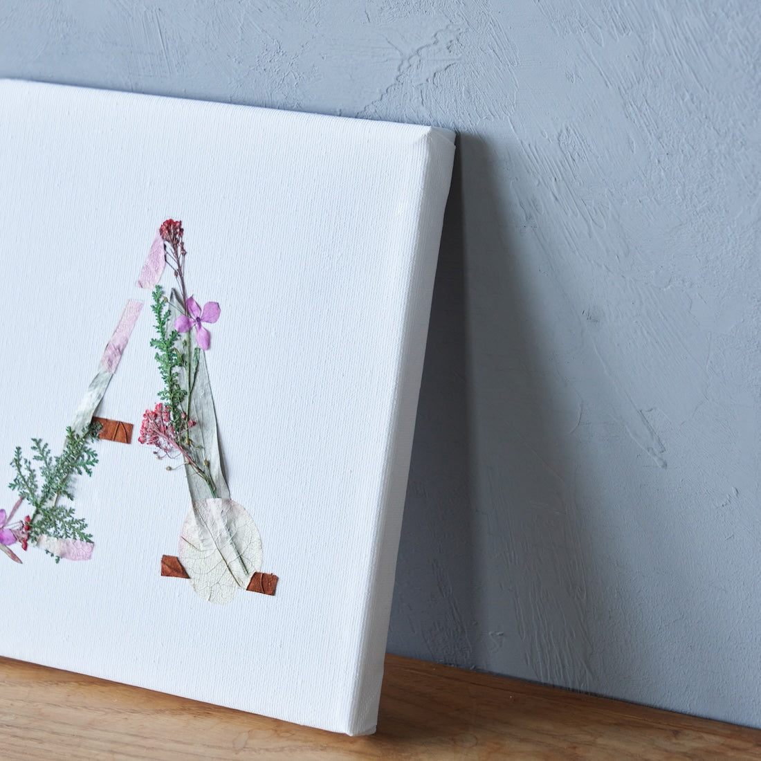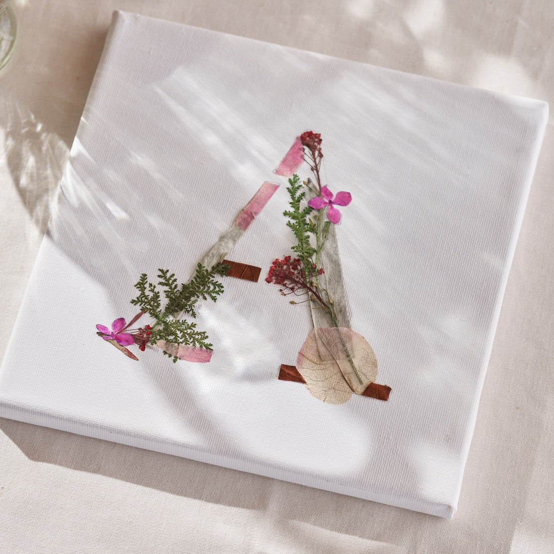 アルファベット一文字のシンプルなデザインだけど、色々な種類のドライボタニカルを組み合わせているから、とっても表情ゆたか。