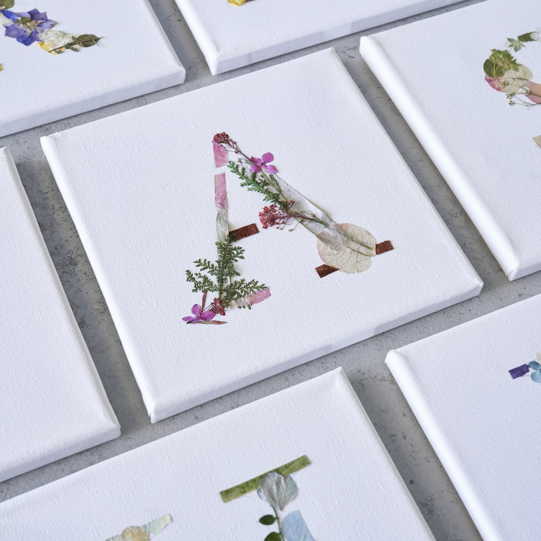 色とりどりの押し花で、アルファベット文字をかたどった、土と風の植物園オリジナルのアートパネルです。