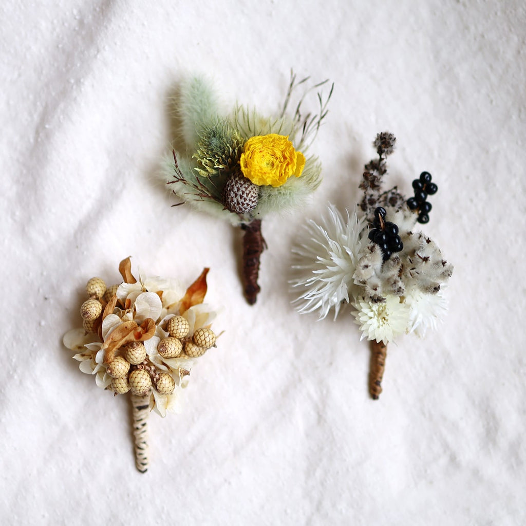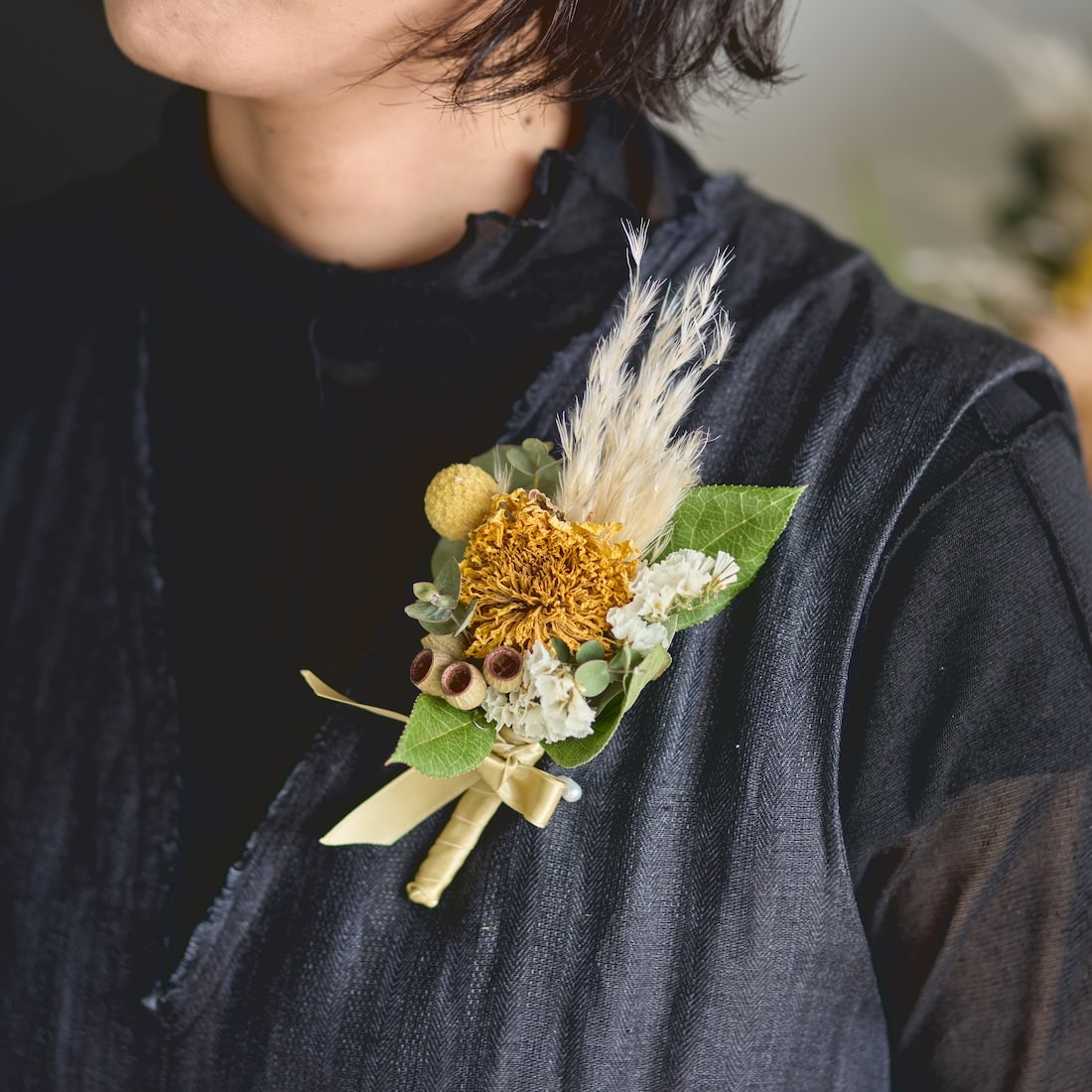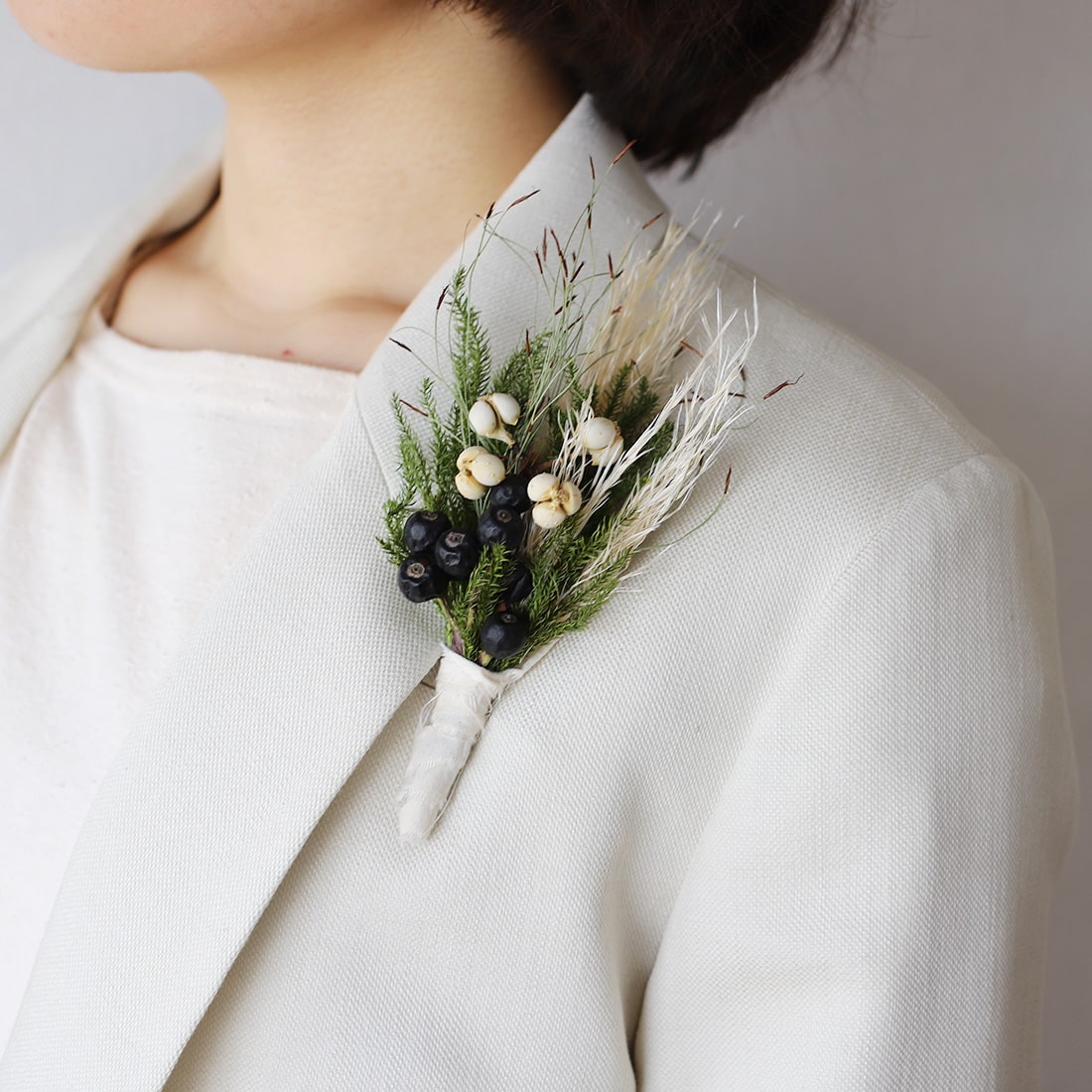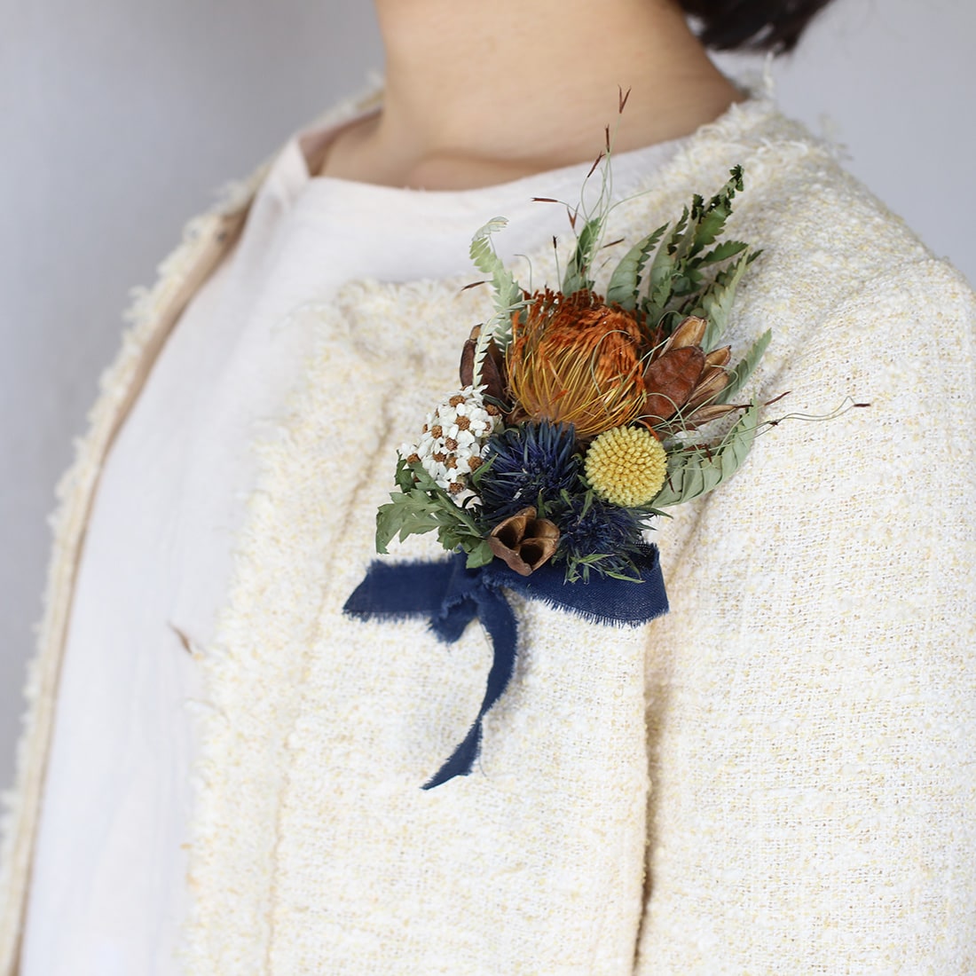 フローリストが季節のドライフラワーで作る、オートクチュールのコサージュ・ブートニアです。結婚式など、さまざまなお祝いごとにぴったり。