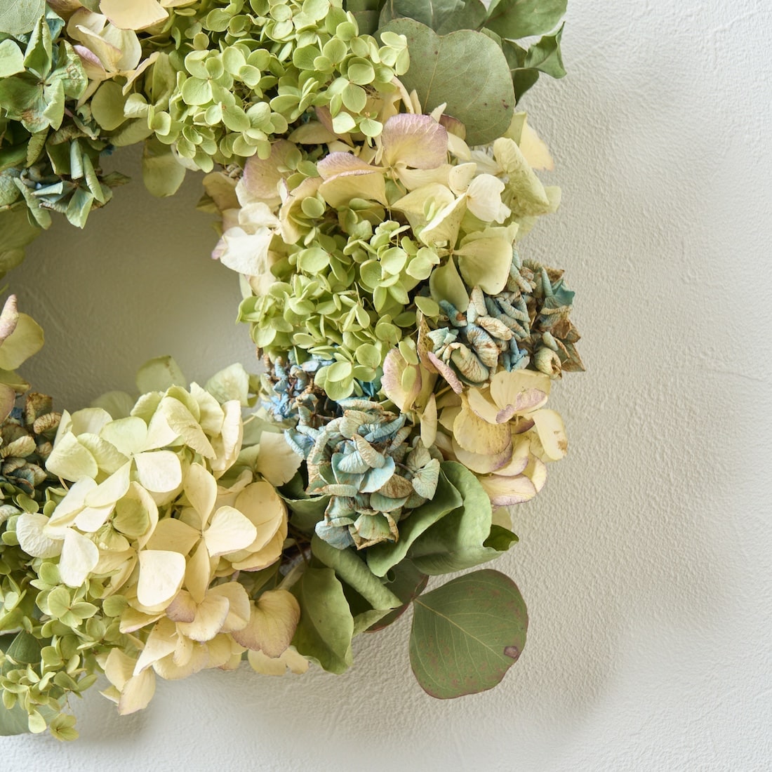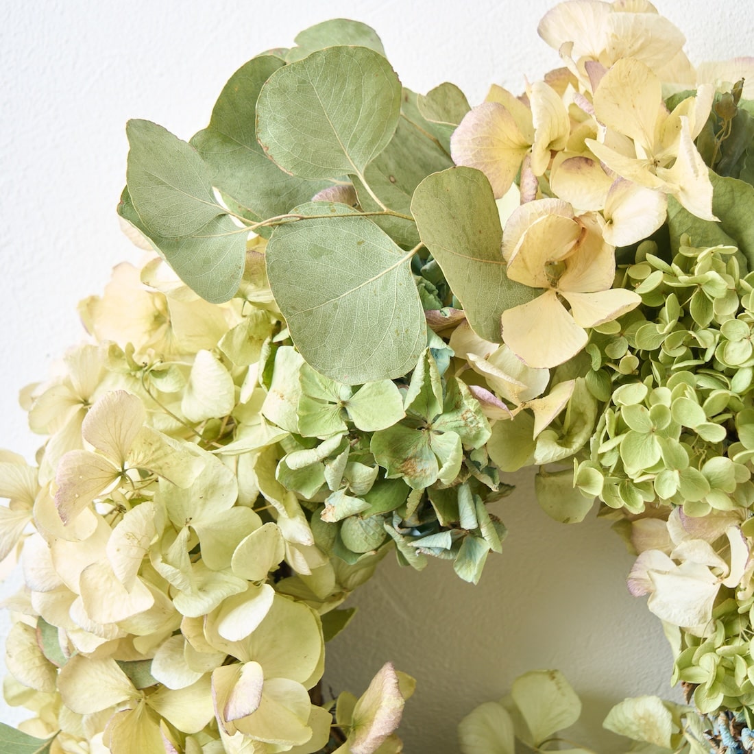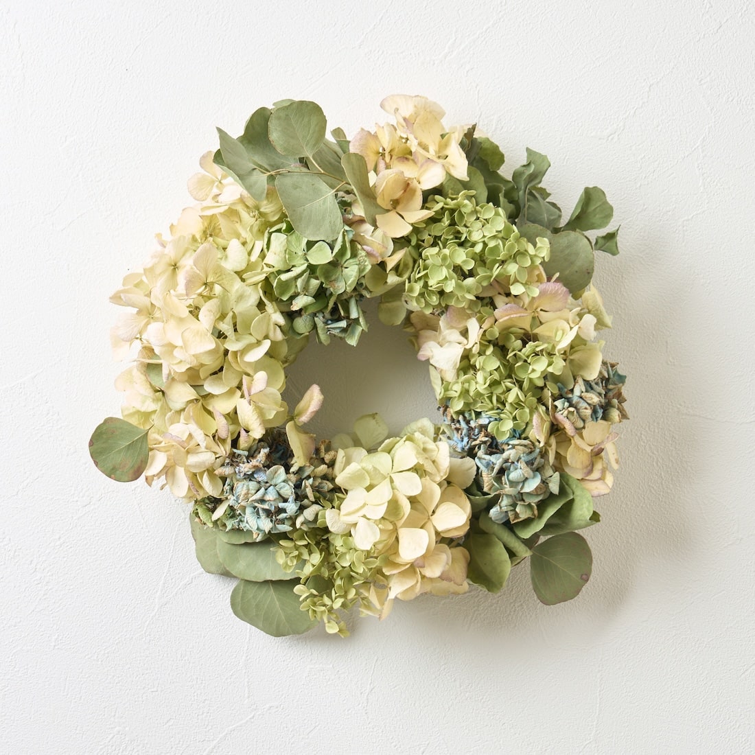 やさしい彩りをあつめた、紫陽花とユーカリのリースです。