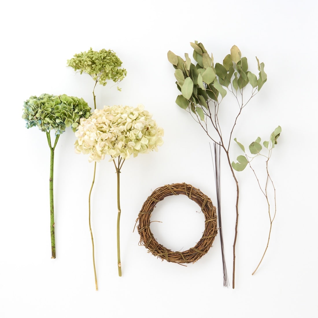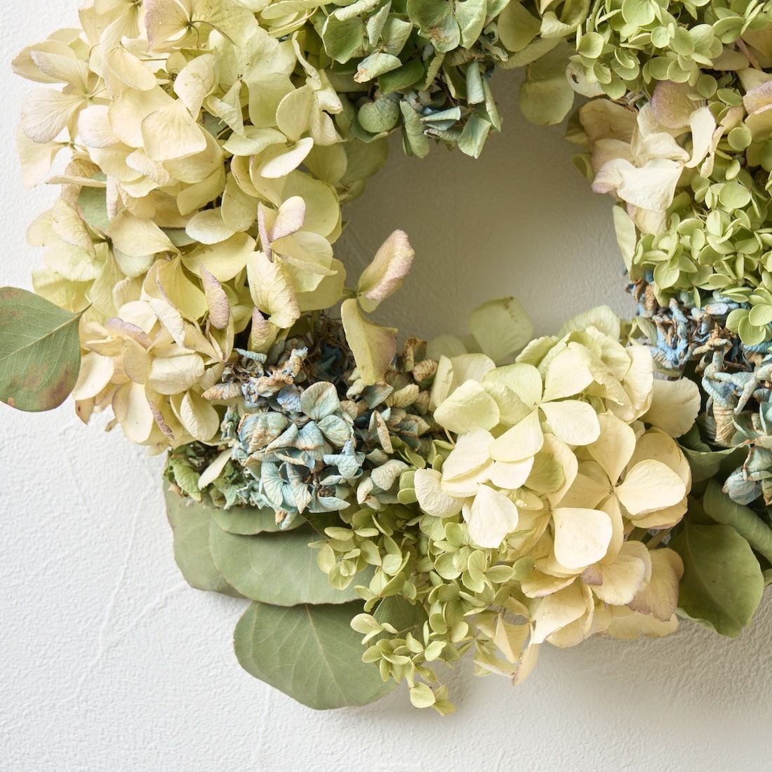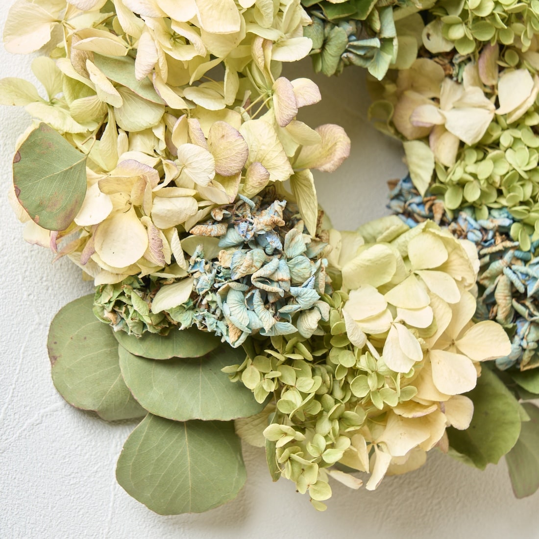やさしい彩りをあつめた、紫陽花とユーカリのリースです。