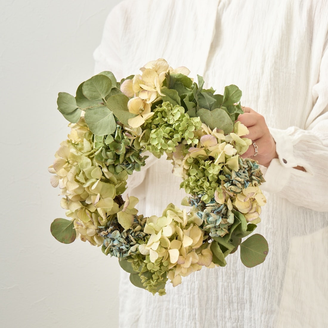 風をまとったように、軽やか。やさしい彩りをあつめた、紫陽花とユーカリのリースです。どちらも、品種がとても豊富な植物。だからこそ、「おまかせ」にして、そのときいちばんきれいな組み合わせでお届けします。グリーン系のトーンで、フローリストがひとつひとつおつくりします。
