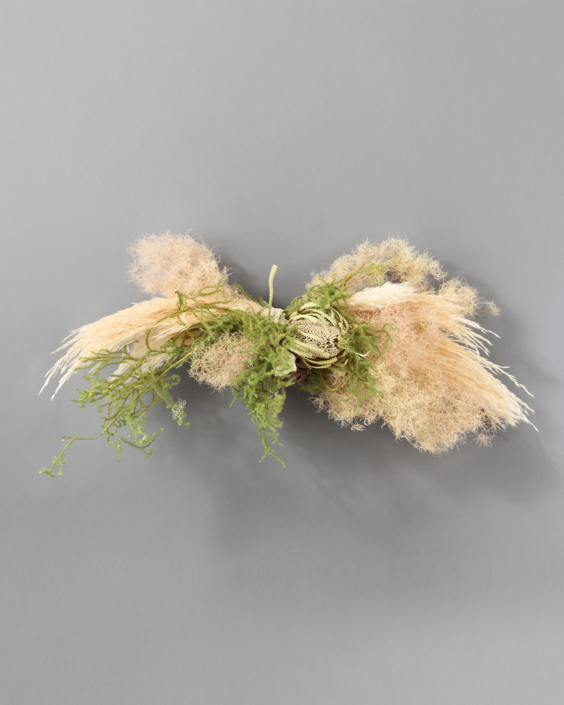 淡くけぶる秋の気配を束ねた、やさしい表情のスワッグが登場。ホワイト×グリーンの彩りは、秋の気配をまといながらも爽やかで、空間にすっとなじみます。特におすすめしたいのはお店のディスプレイの主役として。特別な人へのギフトにもぴったりです。