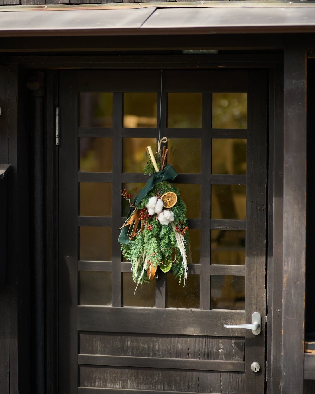 クリスマスの限定スワッグのそばに、土と風の植物園のオリジナルキャンドルを並べて飾るのもおすすめです。