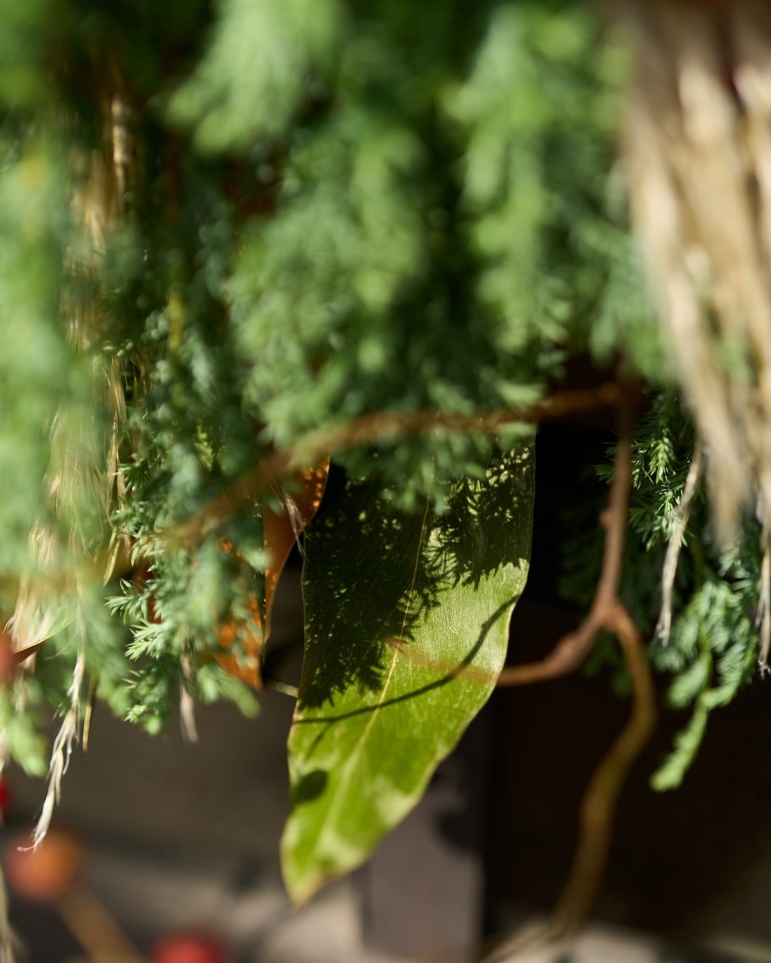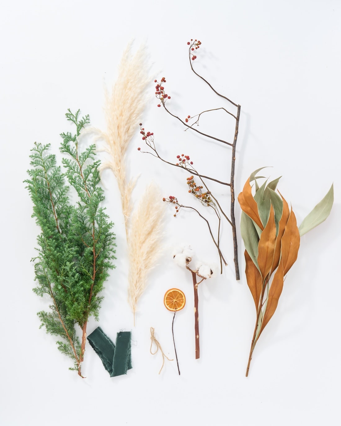 サツマ杉に合わせたのは、オレンジ、赤い実、グレビレアゴールドなど。