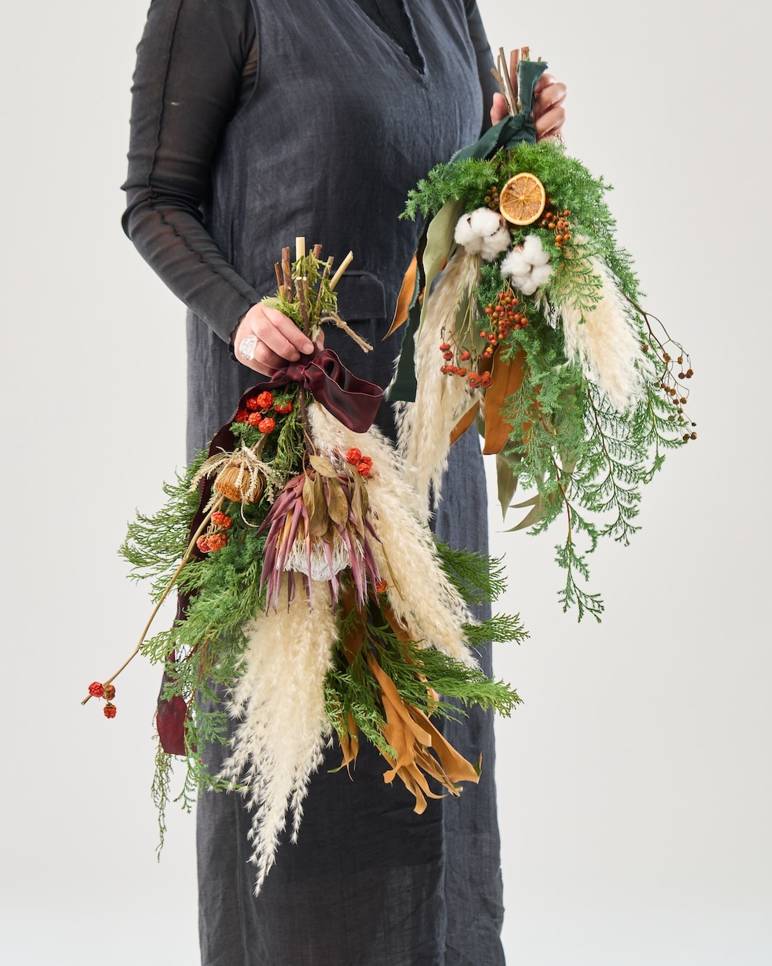 現在は、花束を逆さにしたような形になるように花や葉を束ねたものが、スワッグのイメージとして広く定着しています。