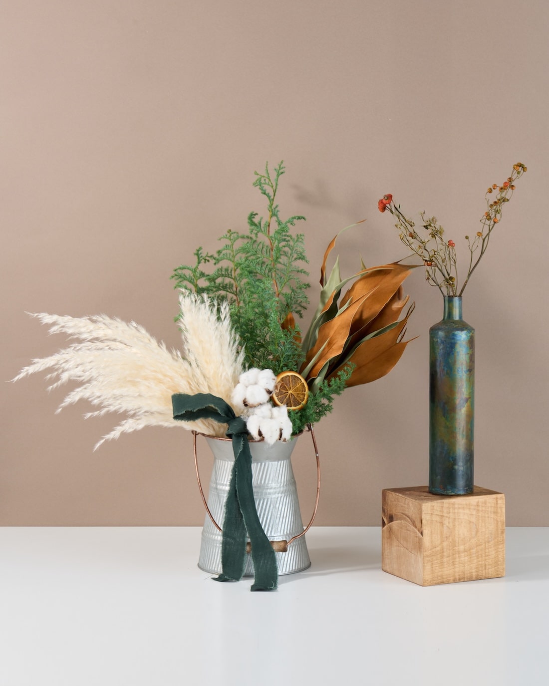 みずみずしいグリーンが、ドライフラワーの深みある色彩を引き立てて、豊かな表情に。