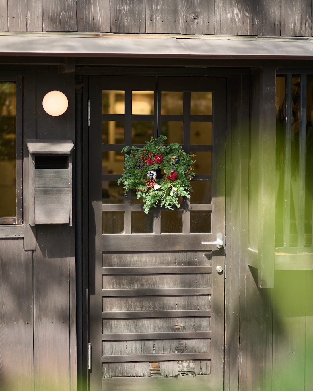 風渡る、エバーグリーンのクリスマスリースを見る