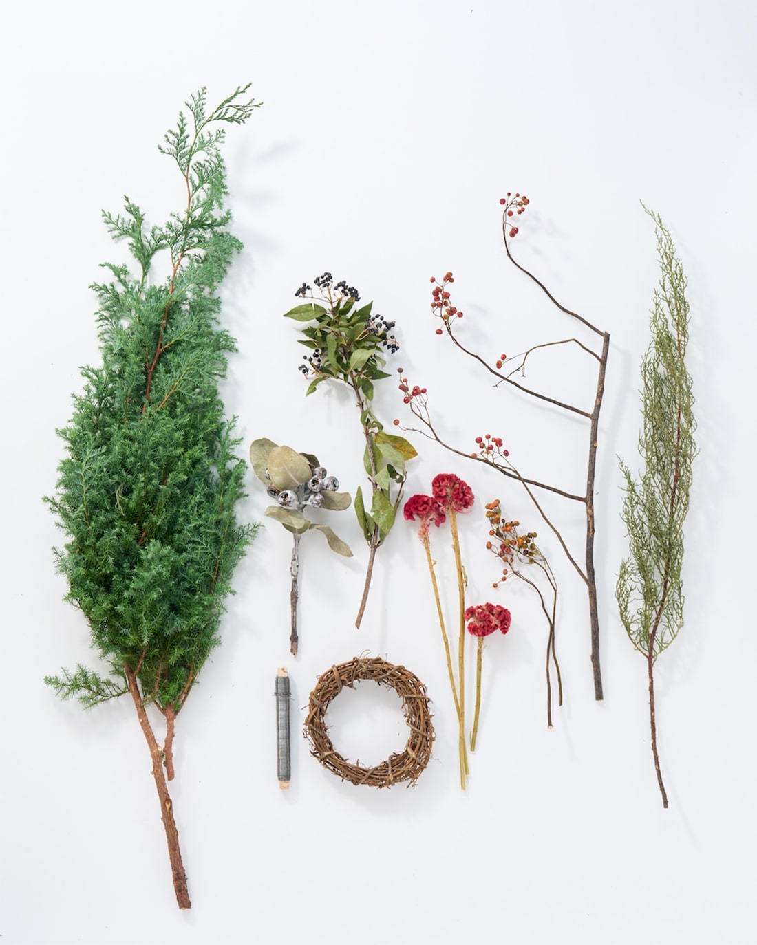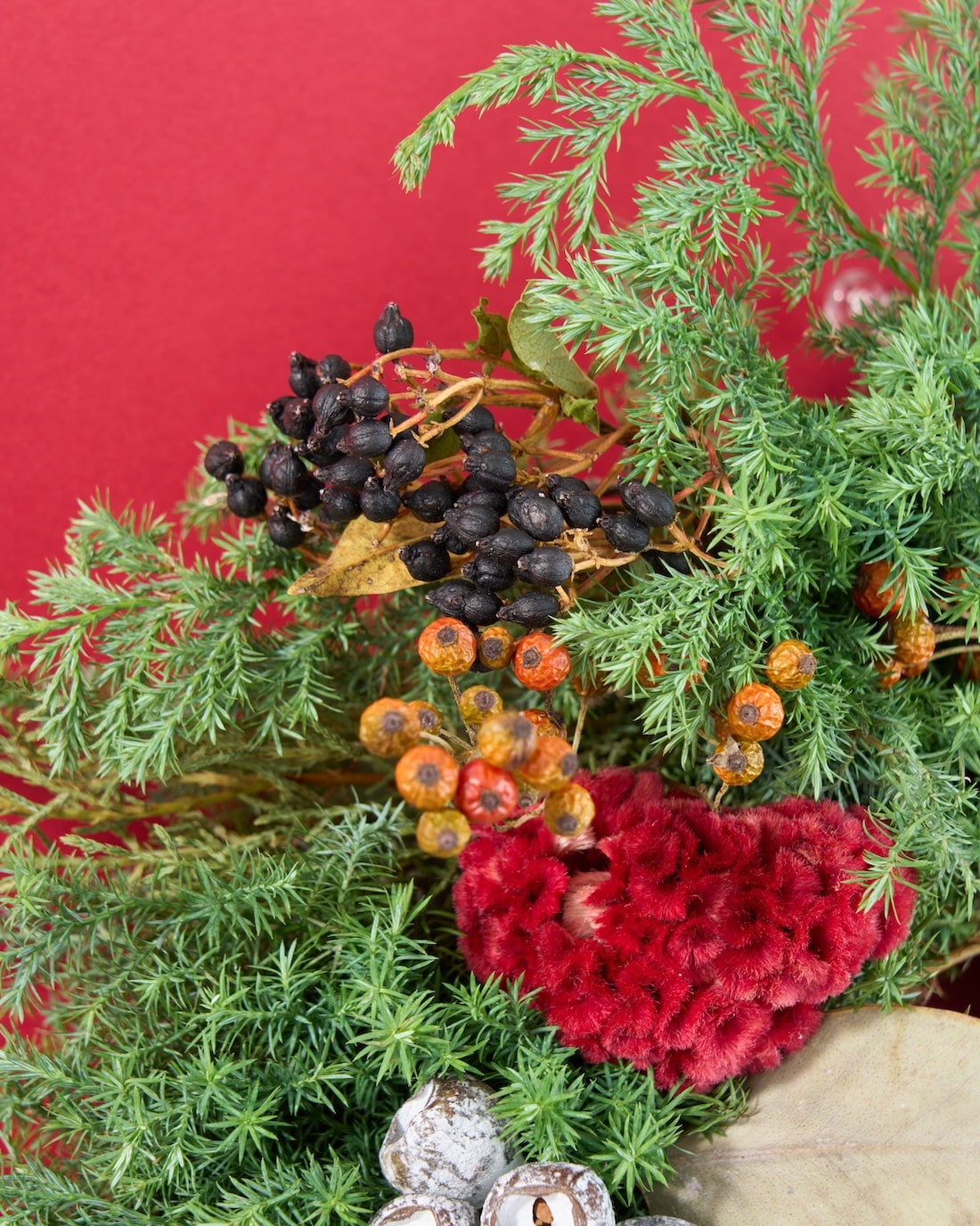 ドライフラワーと、フレッシュの針葉樹を織り交ぜて