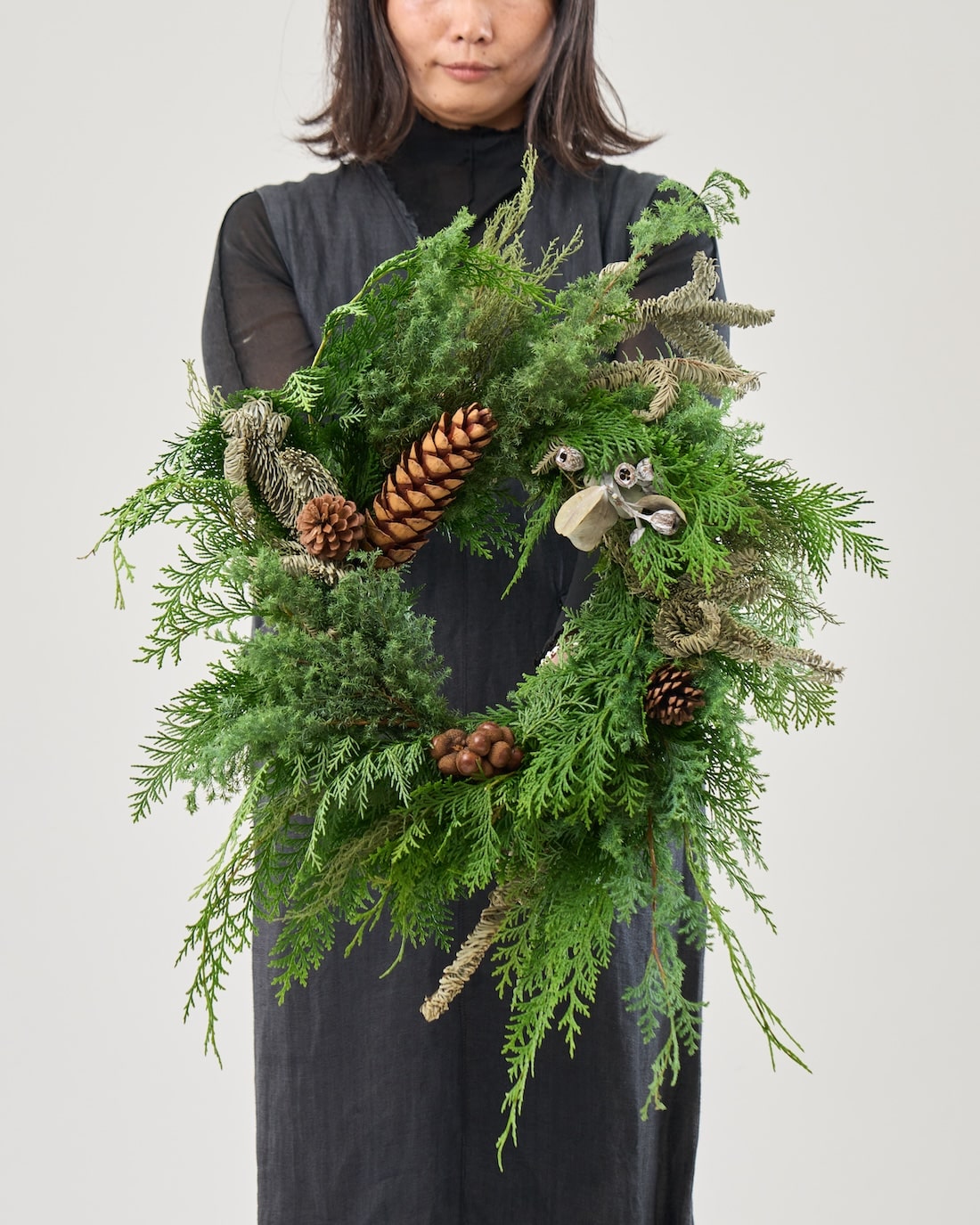 季節を越えて生きる力を感じさせてくれる。永遠の豊かさの象徴、「エバーグリーン」をたっぷりと使った大きなクリスマスリース。フレッシュな状態でお届けするから、香りもゆたか。冬の森の澄んだ空気や、植物たちの息づかいを間近で感じられます。大切な方への贈りものにもおすすめ。12月10日までの数量限定販売です。