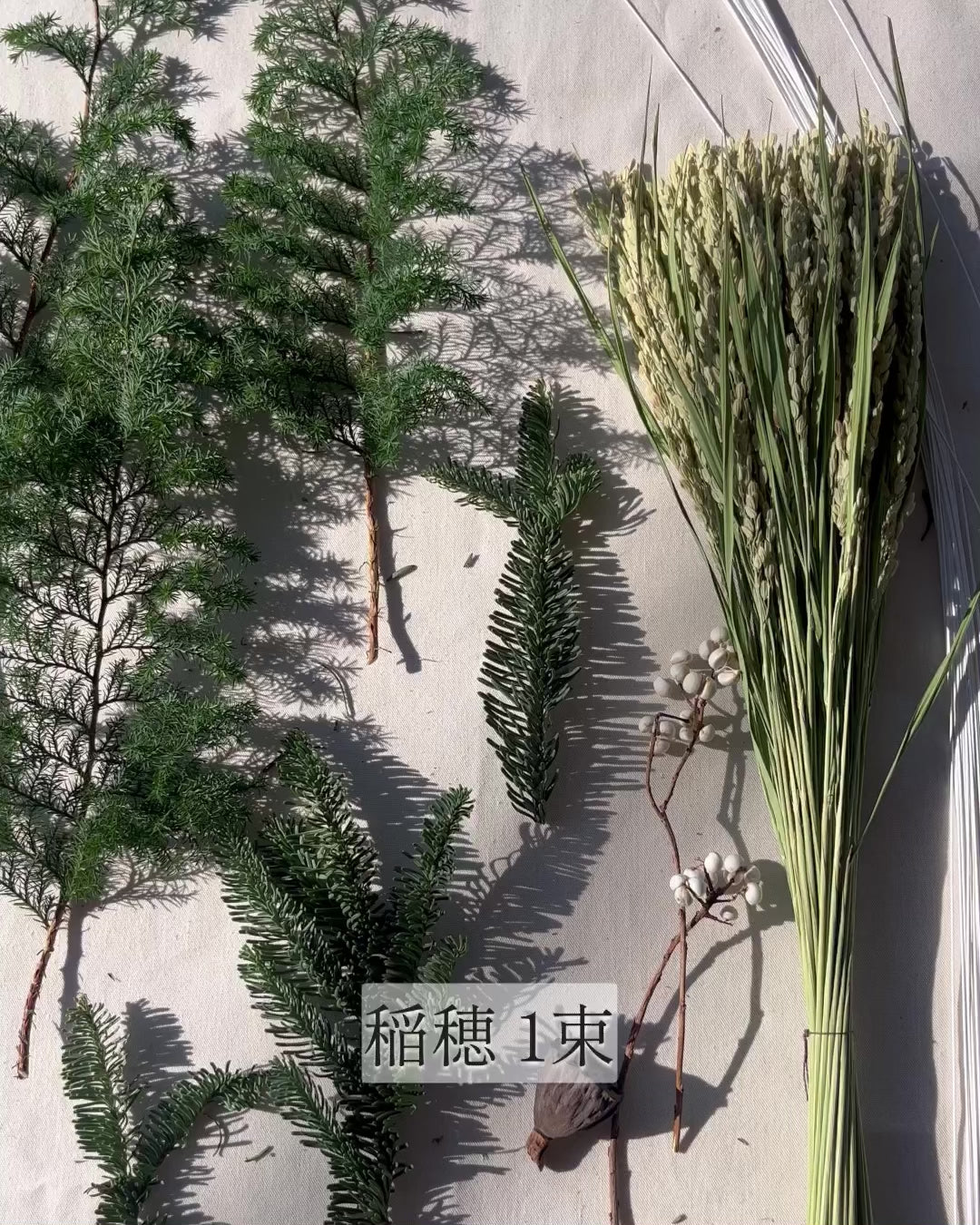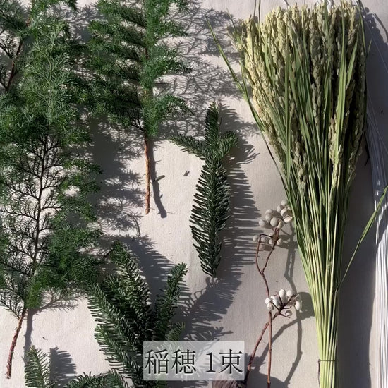 | 手作りキットの内容 | 稲穂1束/針葉樹(サツマ杉、松、モミなど)適量/ナンキンハゼ 適量/ミニハス 1個/水引 白 20本/ワイヤー#26 10本 |