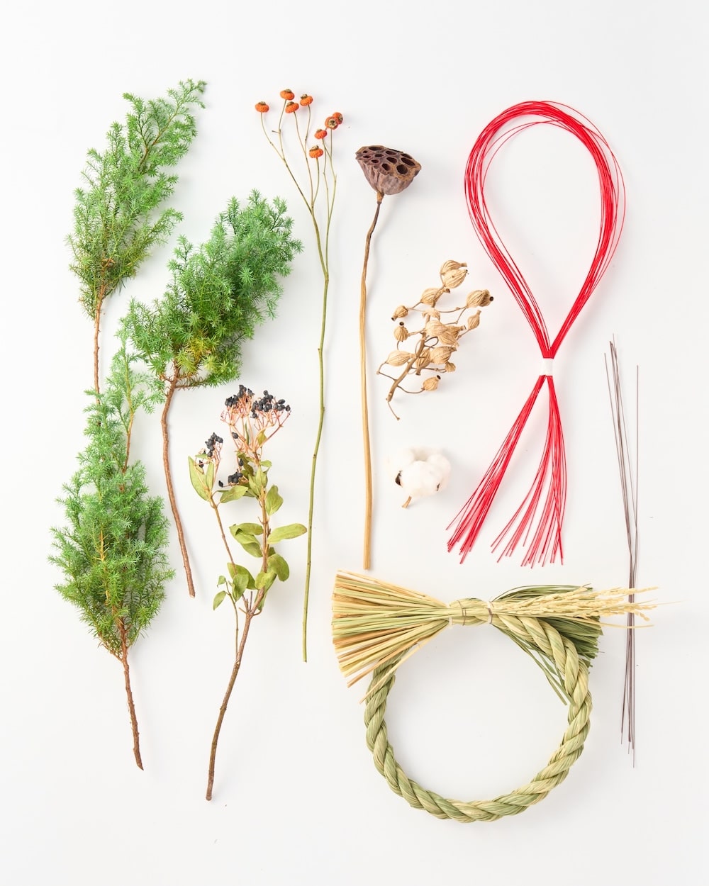 | 手作りキットの内容 | 越後魚沼のしめ縄リース 1個/フレッシュの針葉樹(サツマ杉、松、モミなど)適量/月桃 1パーツ/ハス 1本/ティナスベリー 1本/センセーショナルファンタジー 1本/コットンフラワー 1個/水引 赤 20本/ワイヤー#26 20本 |