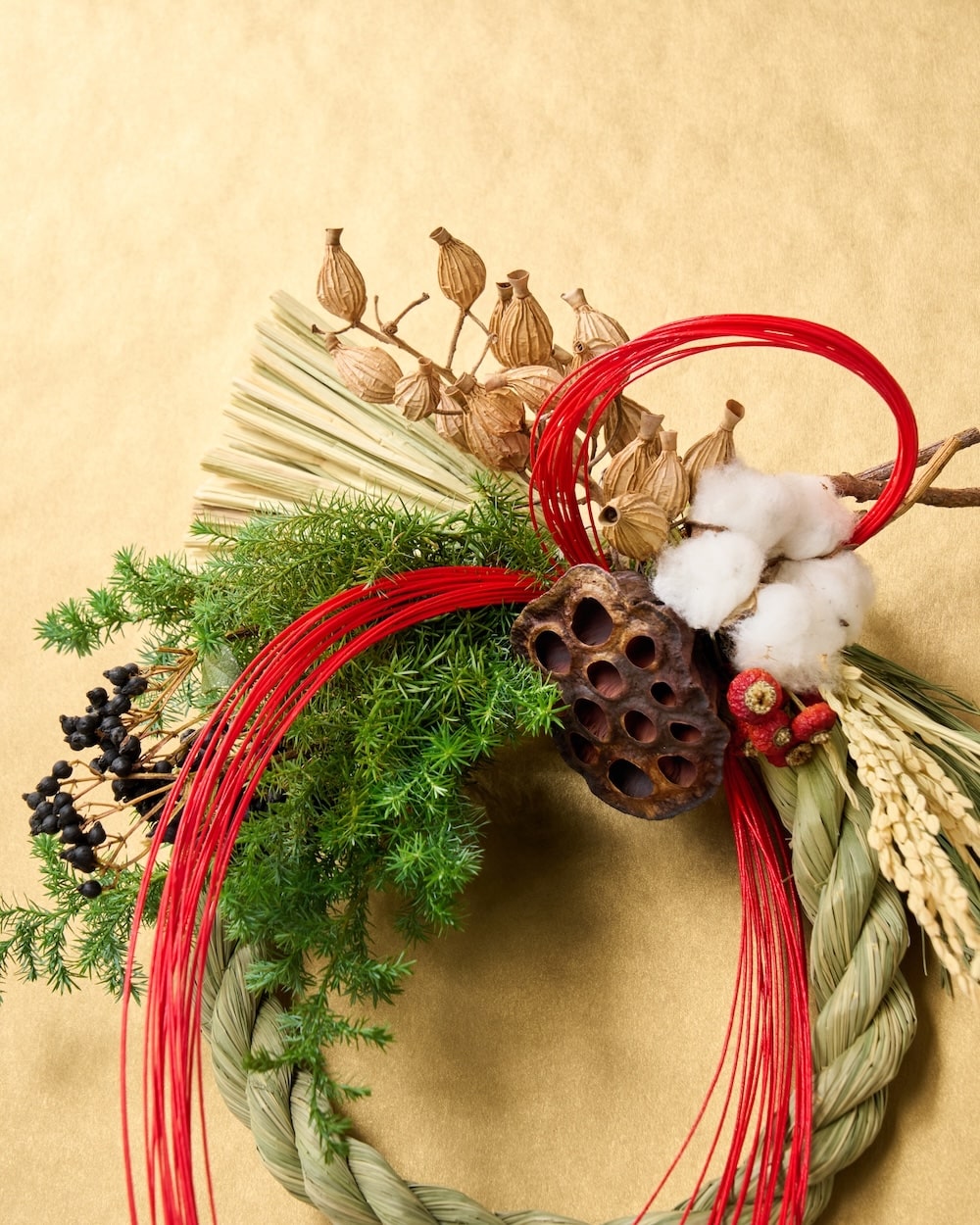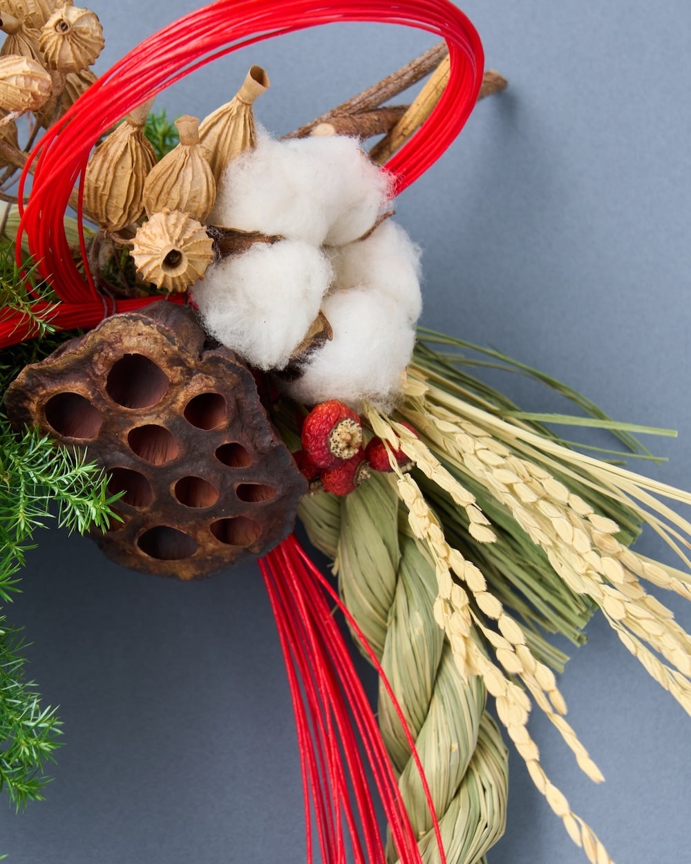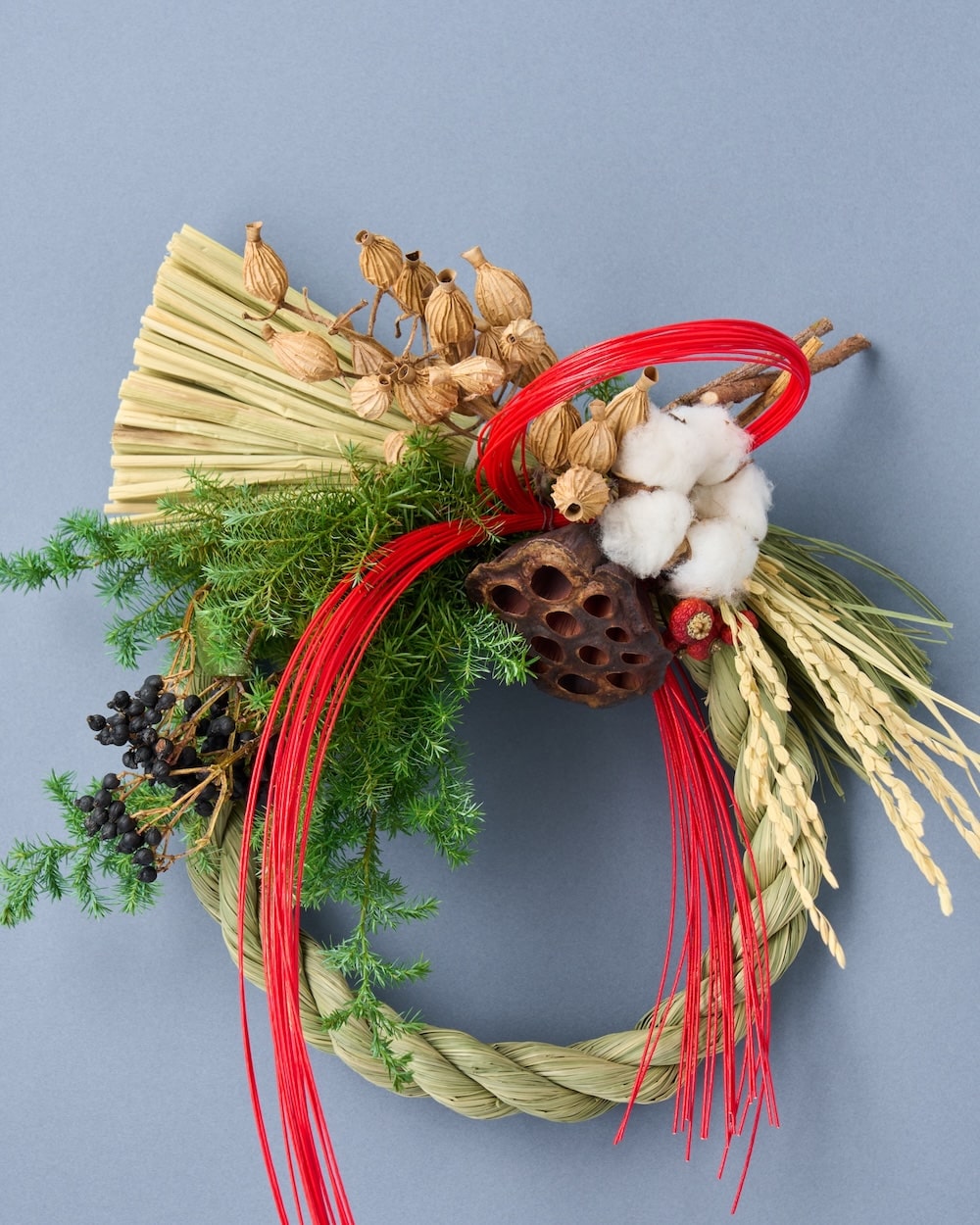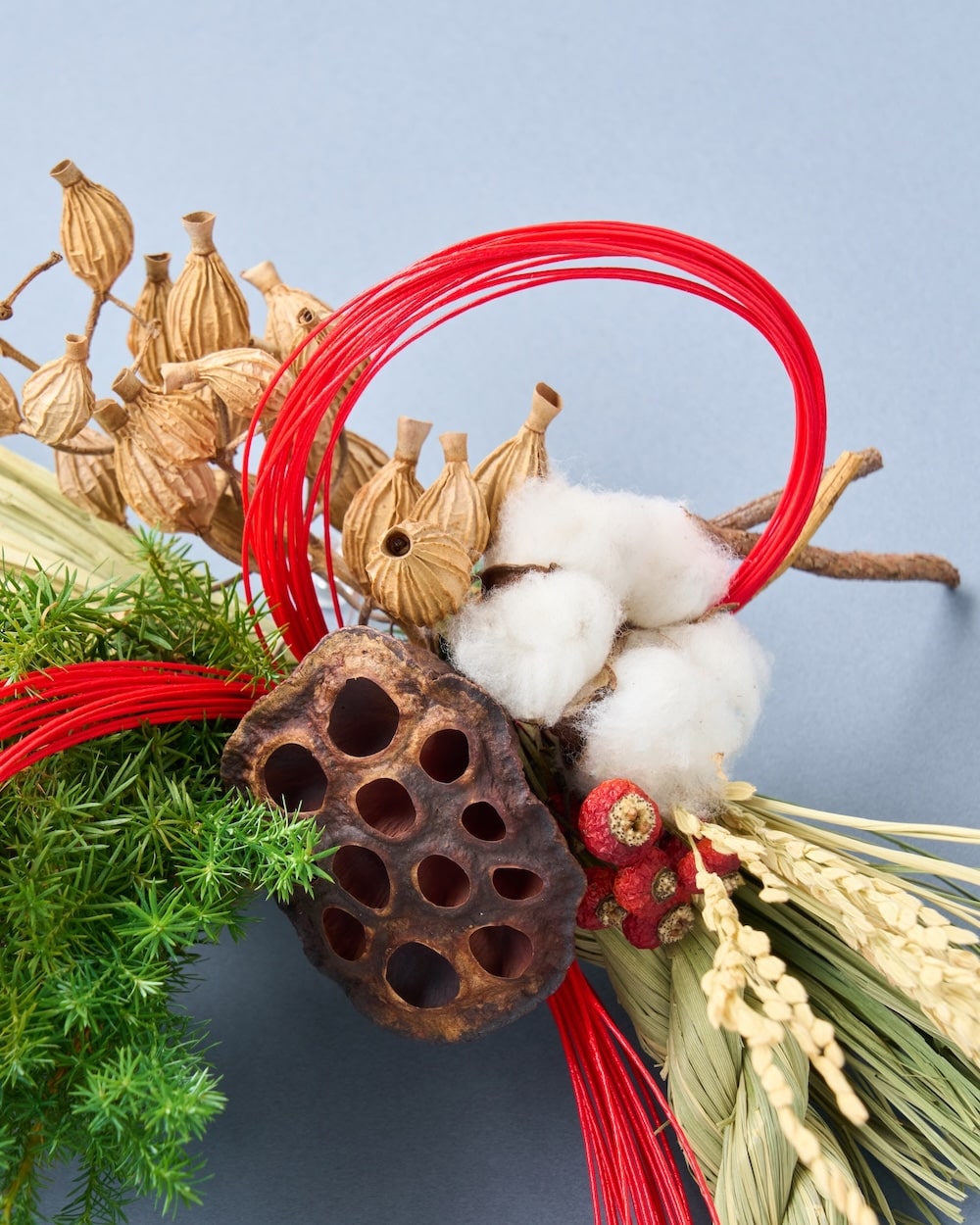 個性豊かな実りをたっぷりと。来たる年への慶びとワクワクを詰め込んだお正月飾りをご用意しました。赤い水引は、歳神様を迎える門出にふさわしい、力強く清らかな色。