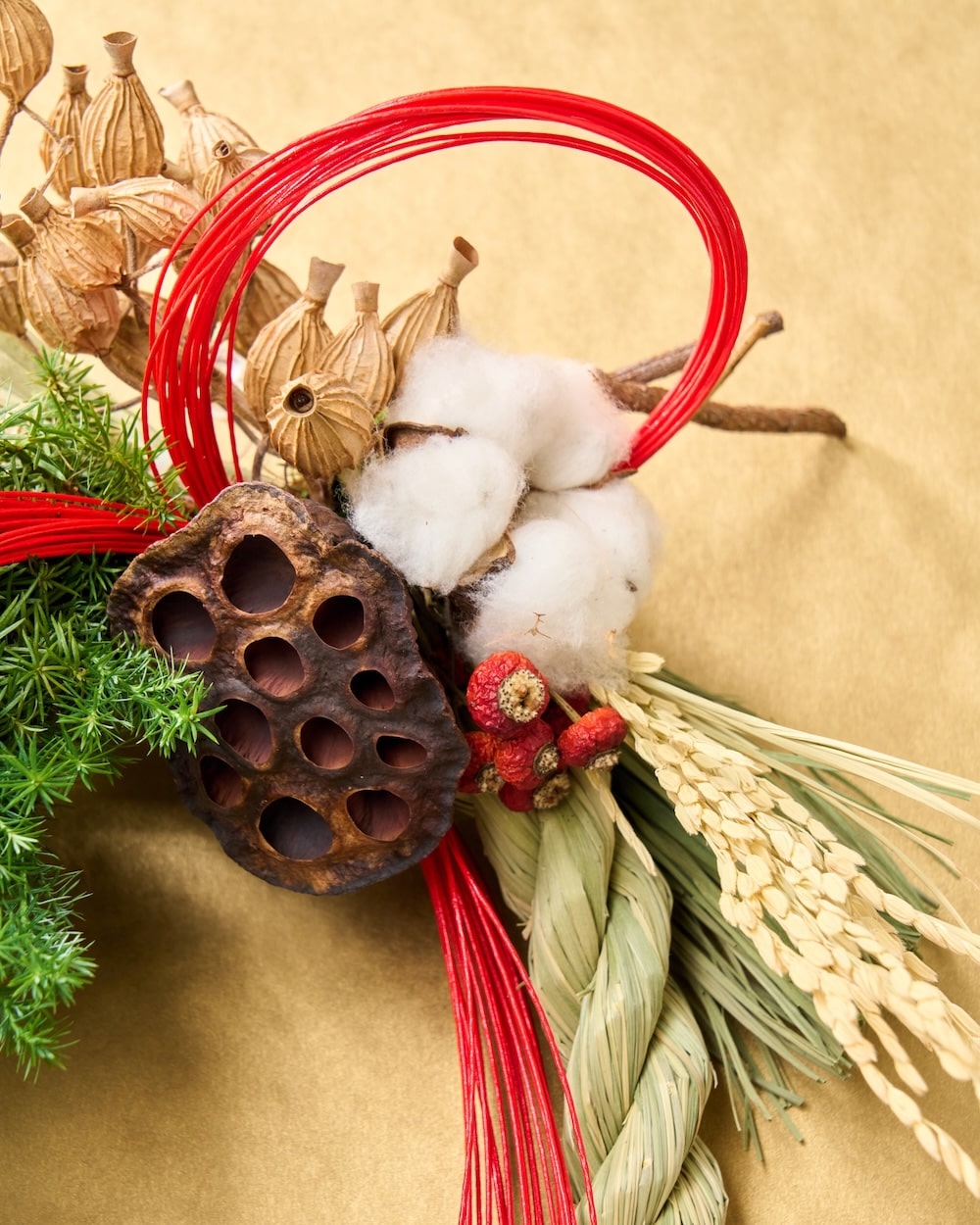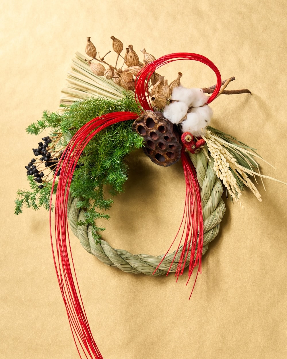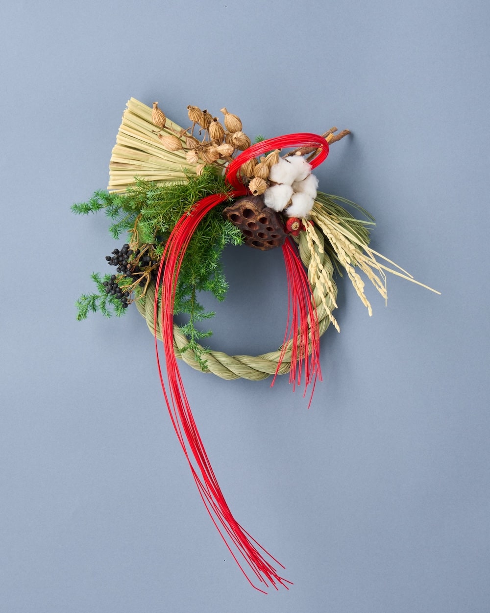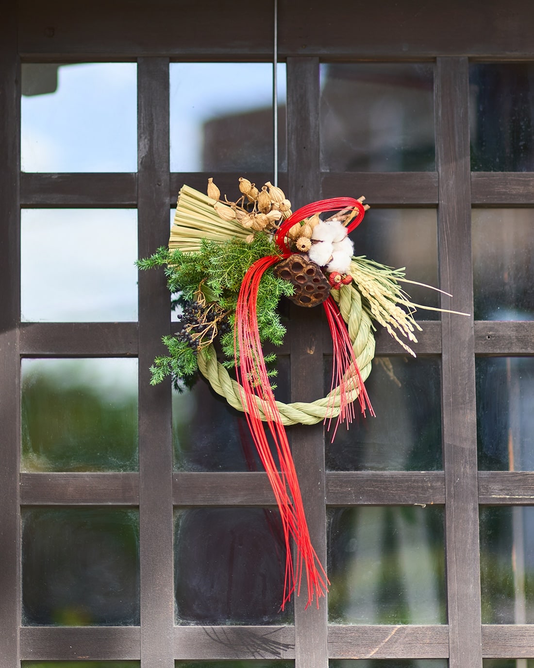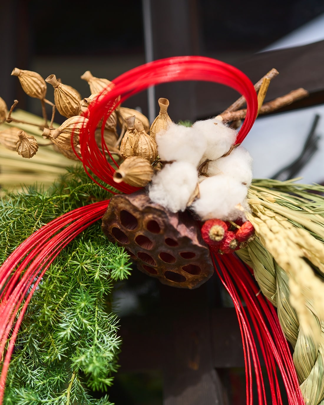個性豊かな実りをたっぷりと。来たる年への慶びとワクワクを詰め込んだお正月飾りをご用意しました。赤い水引は、歳神様を迎える門出にふさわしい、力強く清らかな色。